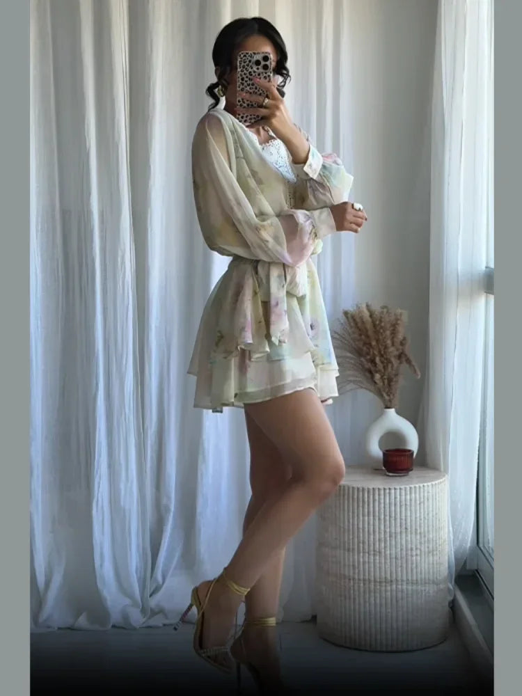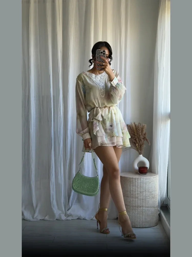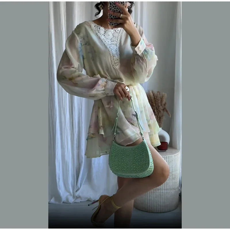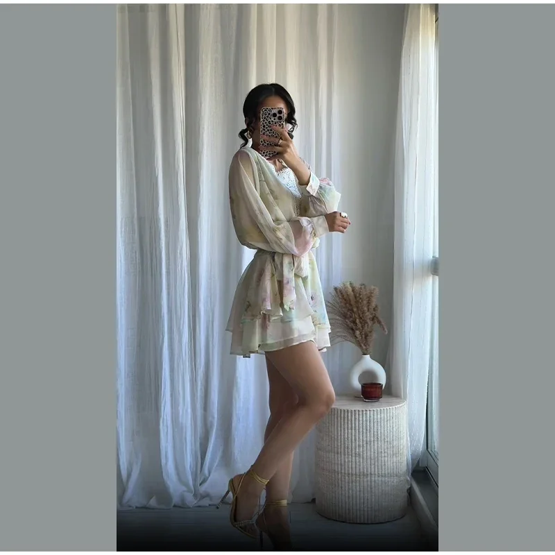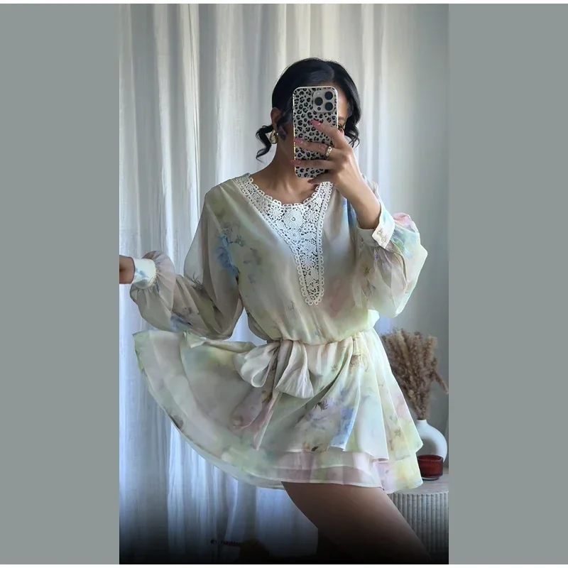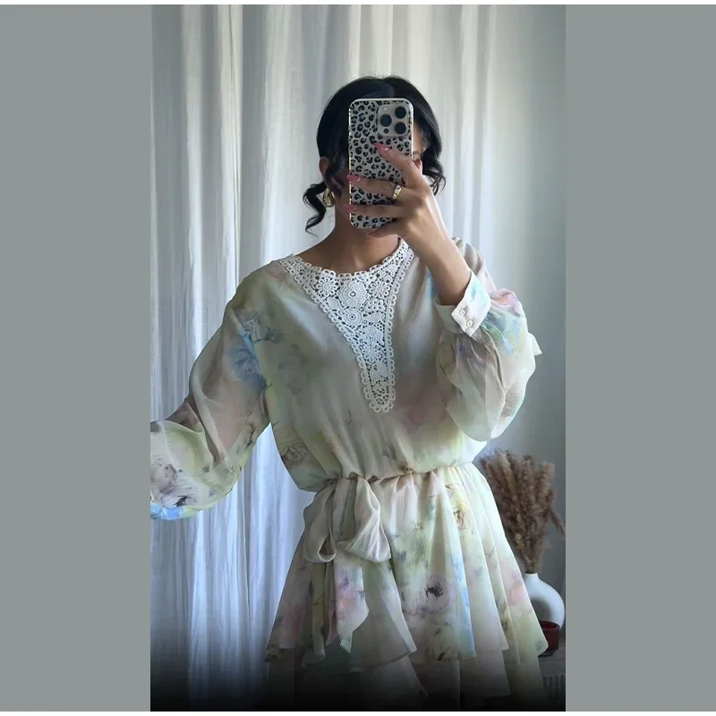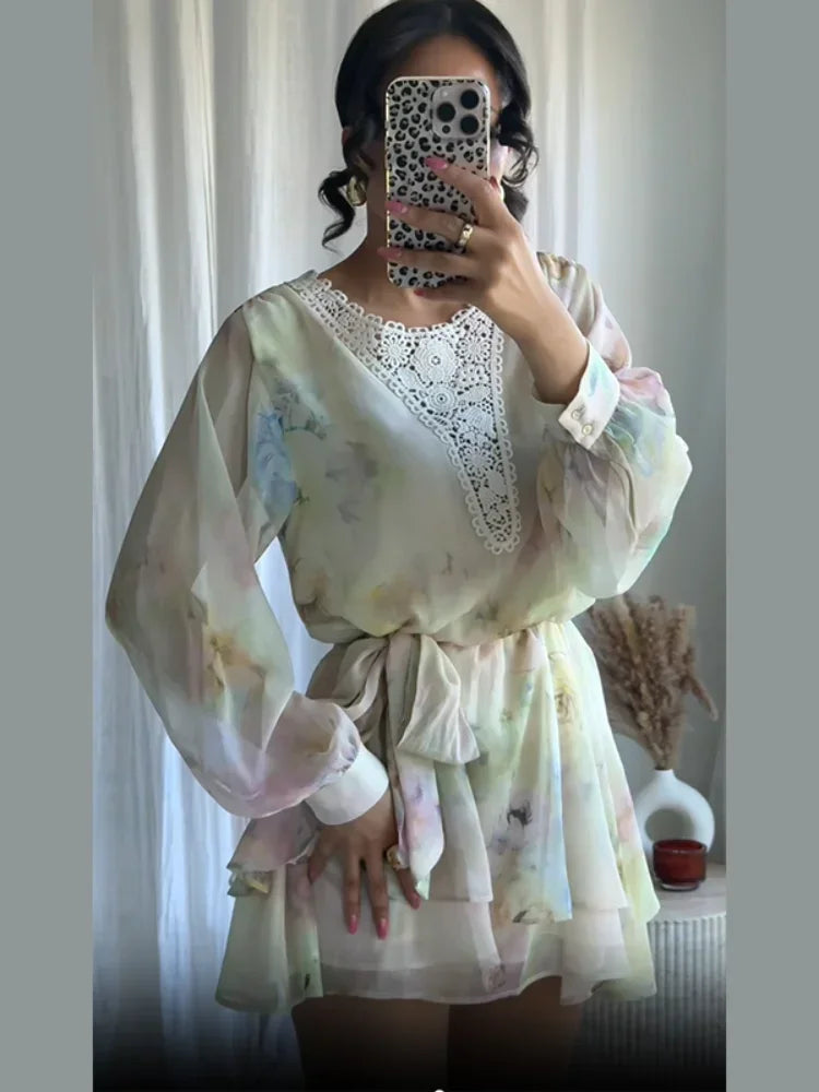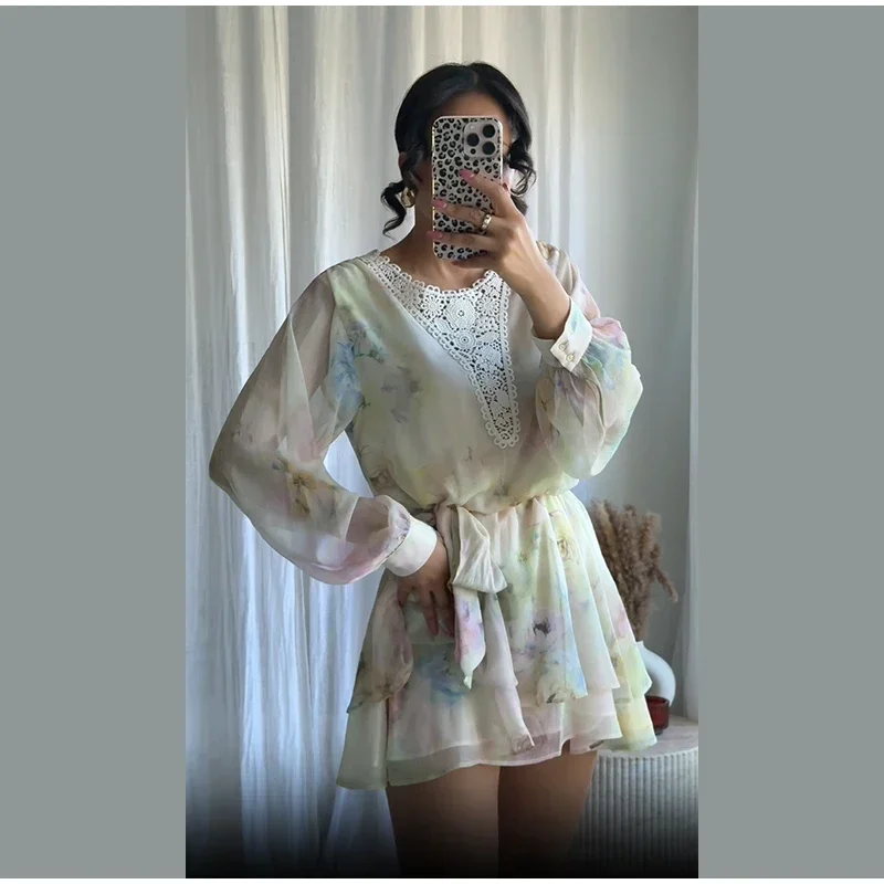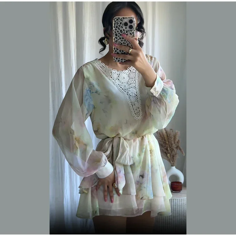 AIDASE - Printed Lace Patchwork Chiffon Waist Mini Dress Women Elegant Round Neck Long Sleeve Bodycon Short Dresses 2025 New Summer Robe