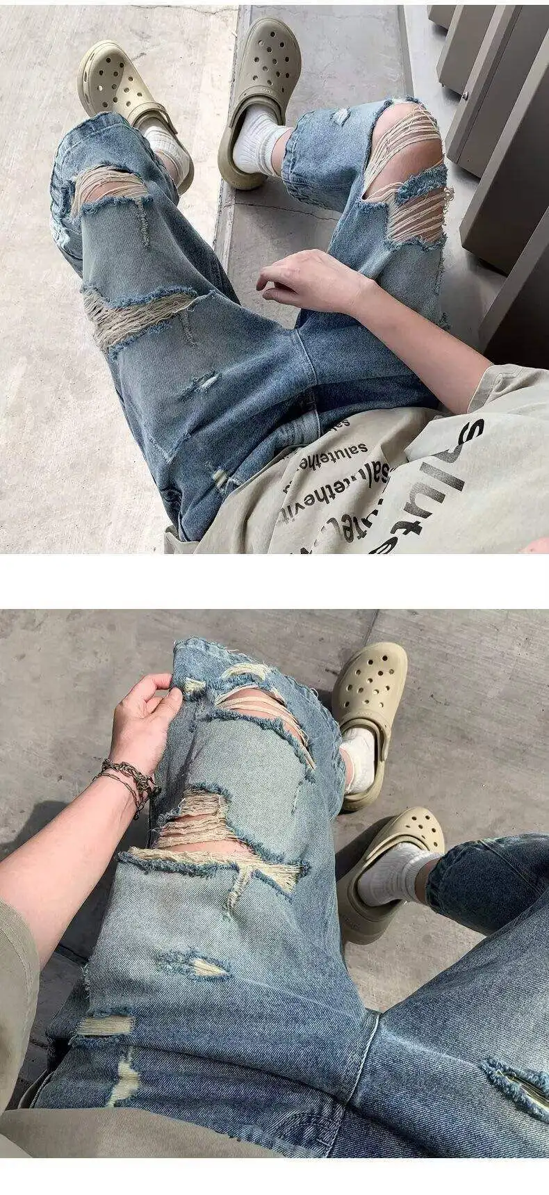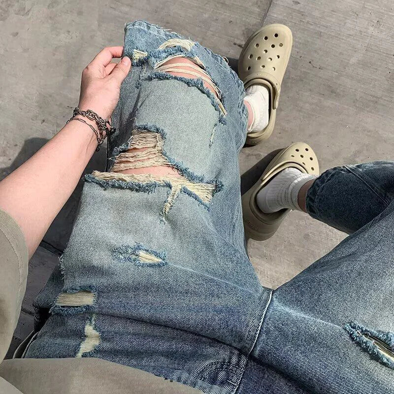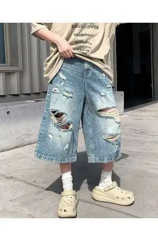 AIDASE - Ripped Men's Denim Shorts Summer New High Street Loose Straight Wide Leg Pants Personality Fashionable Clothes