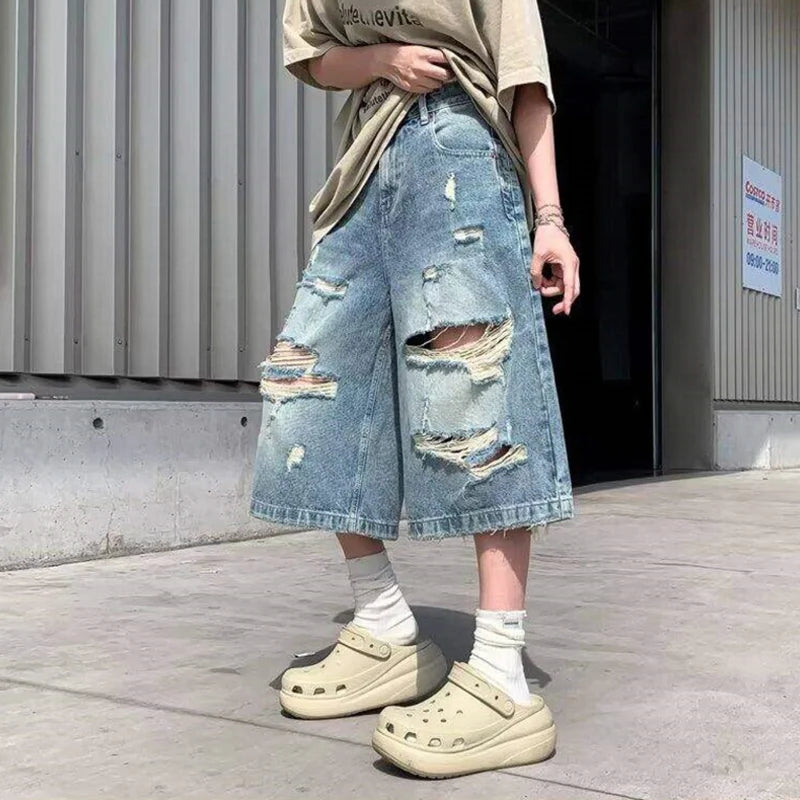 AIDASE  -  Ripped Men's Denim Shorts Summer New High Street Loose Straight Wide Leg Pants Personality Fashionable Clothes
