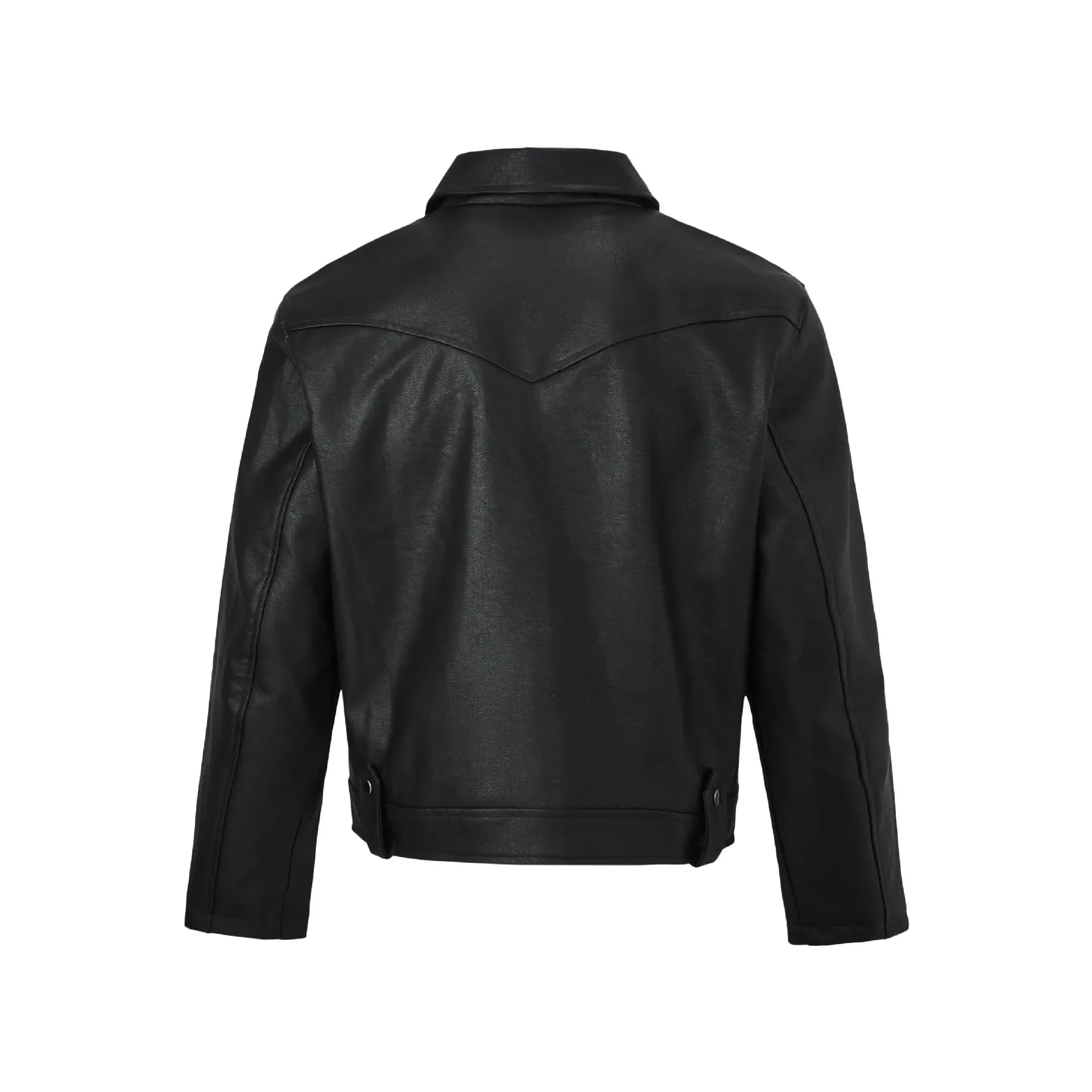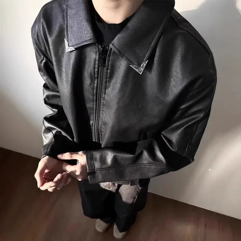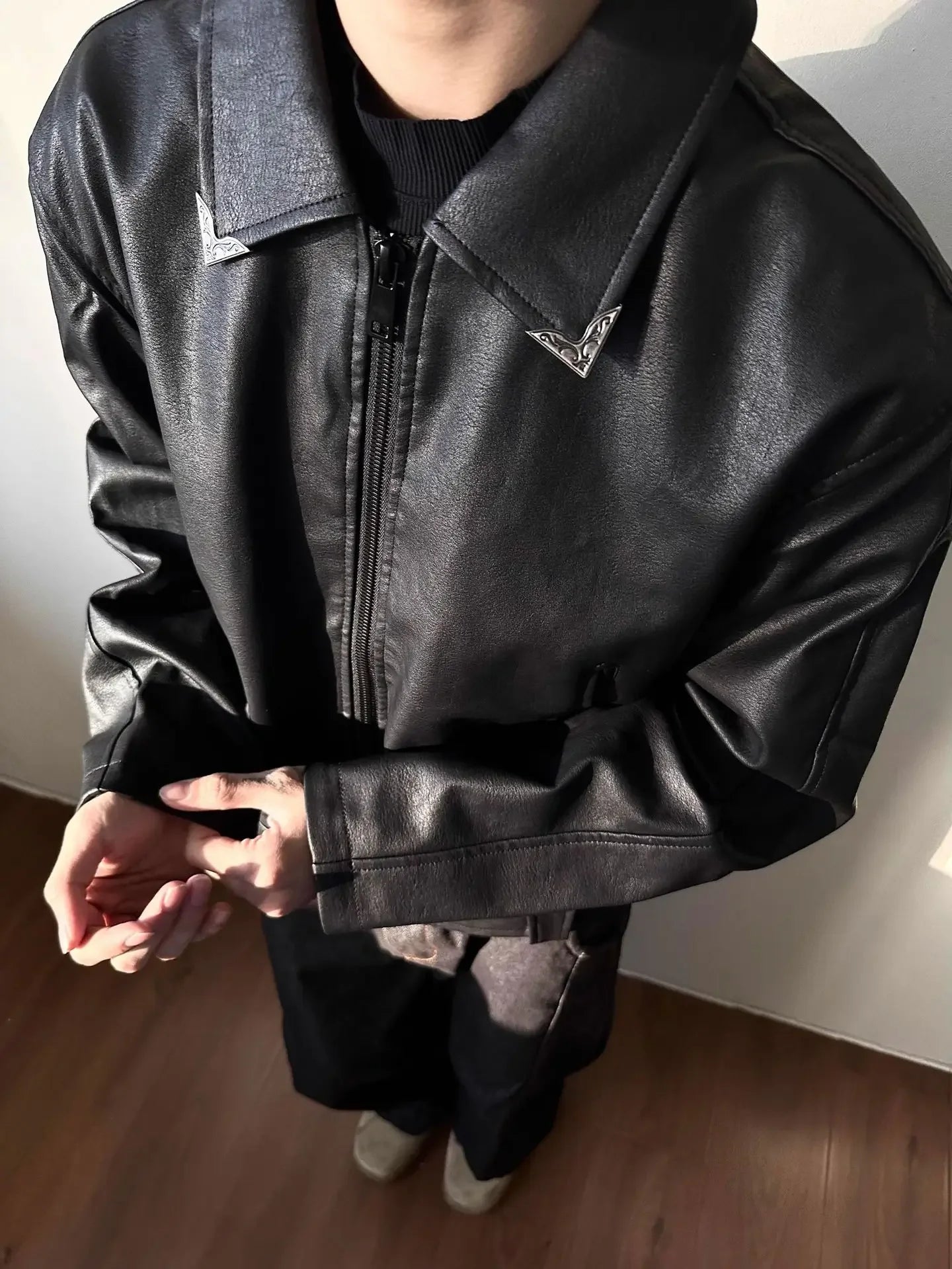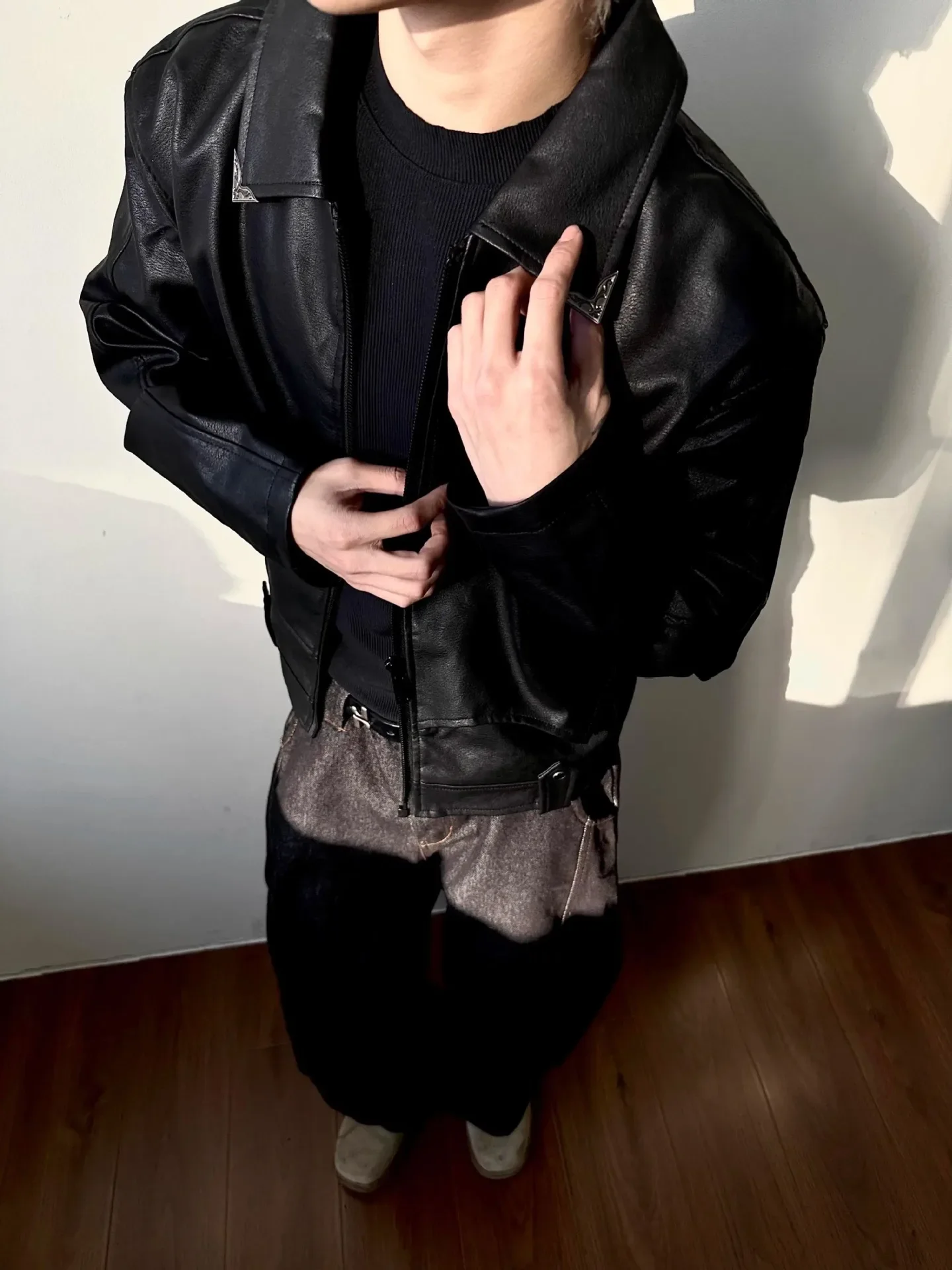 AIDASE - Short Black Leather Jacket Men's Spring Autumn Stylish American Retro Crack Texture Pilot Motorcycle Vest Jacket