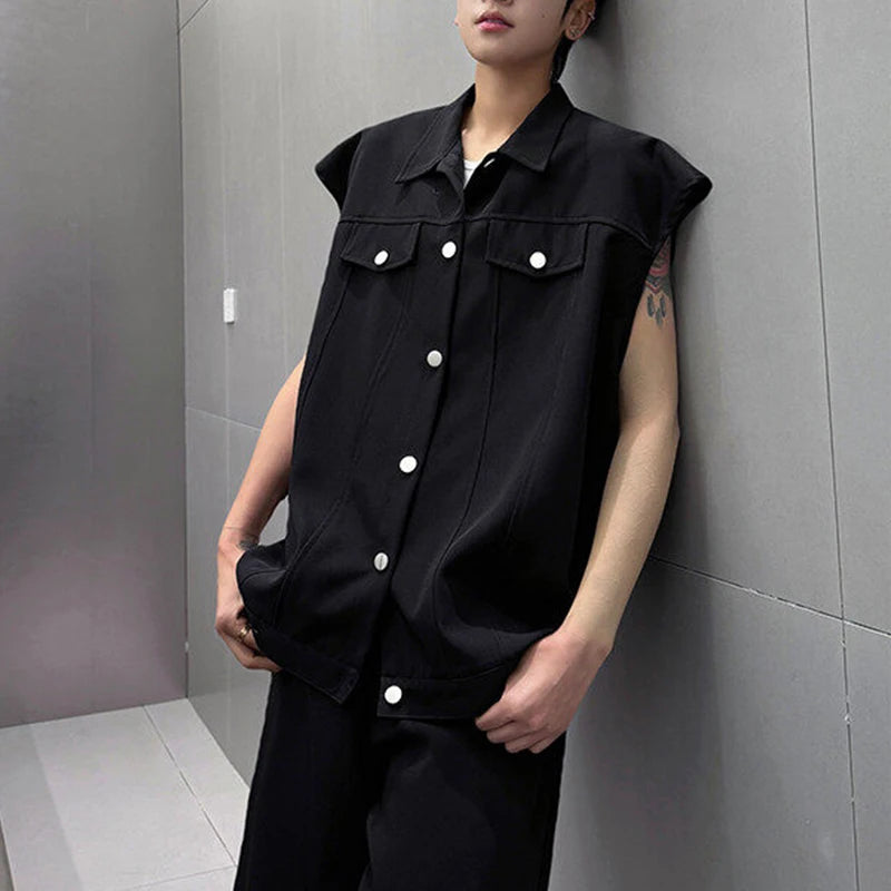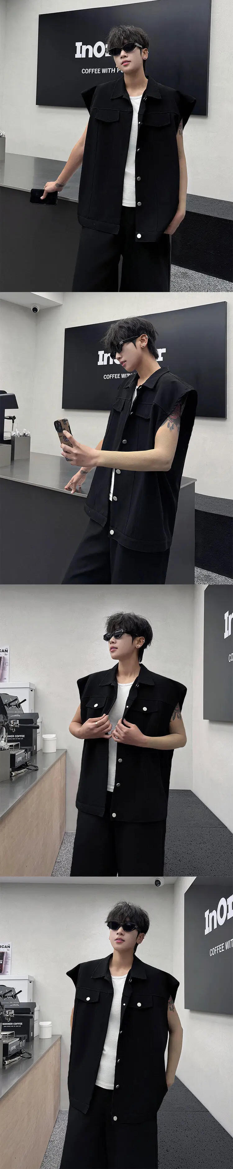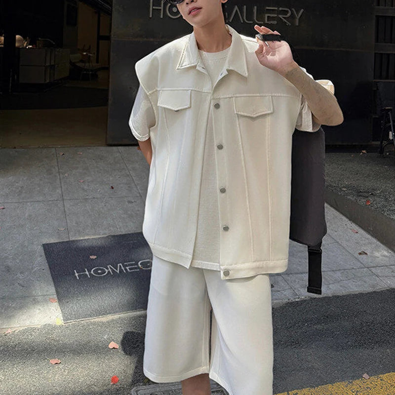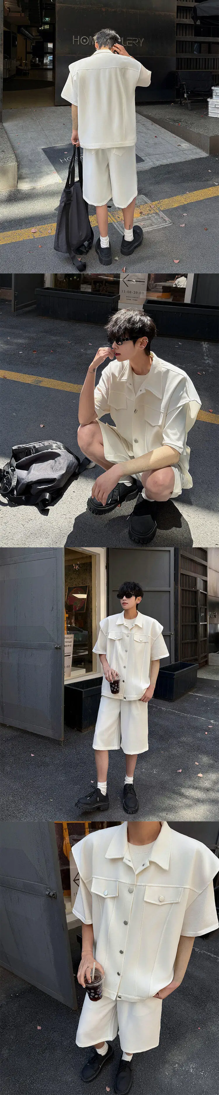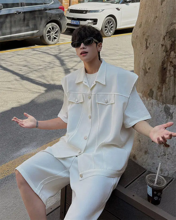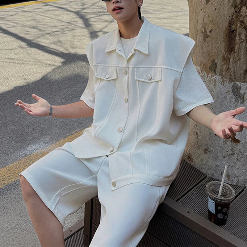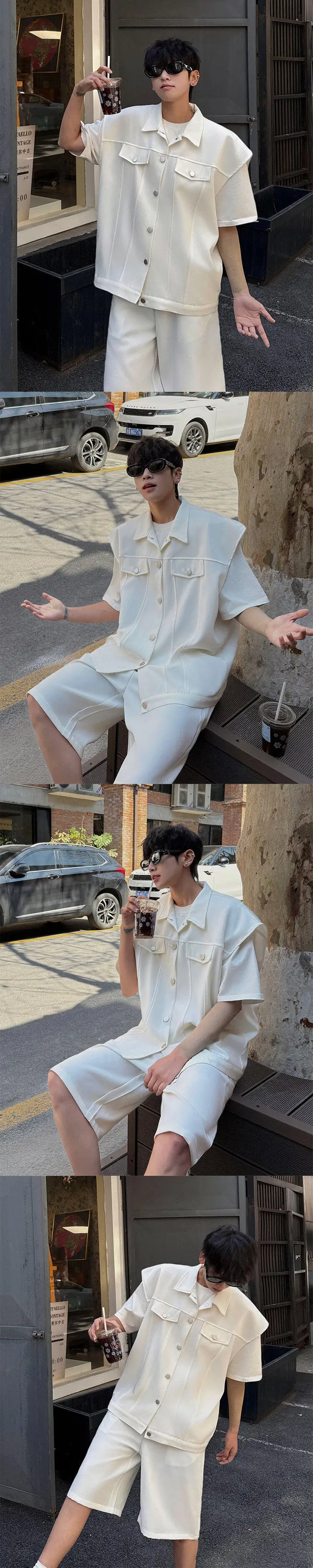 AIDASE - Simple Design Silhouette Workwear Loose Shoulder Vest Shorts Set Short Sleeved Spring Male Sets