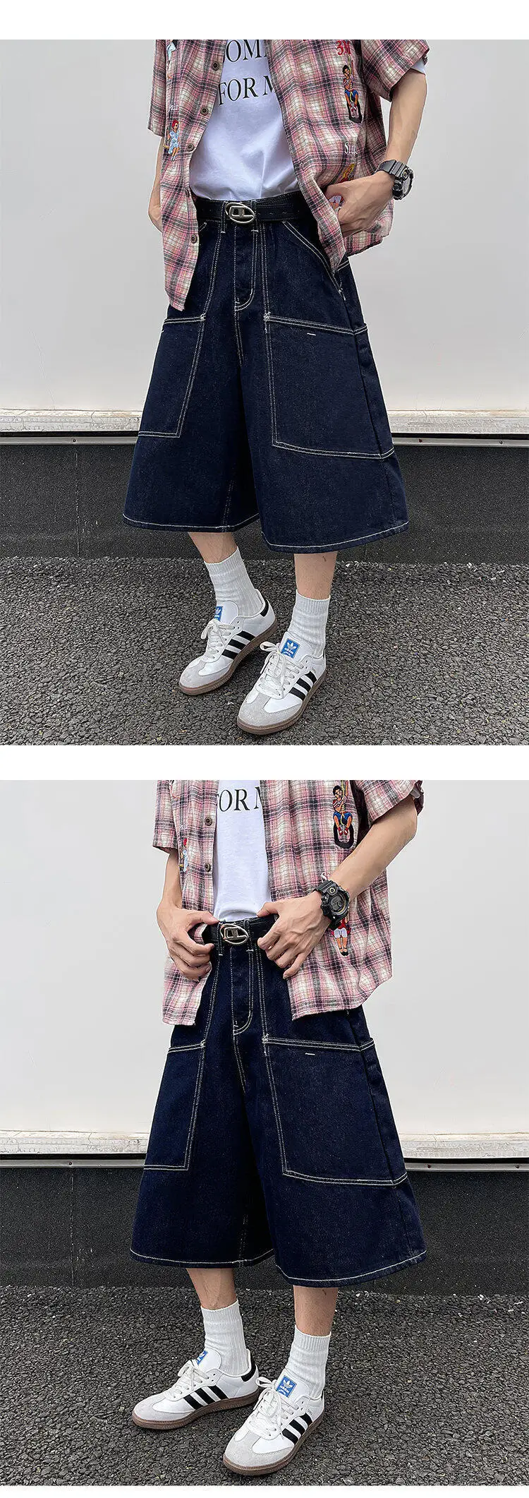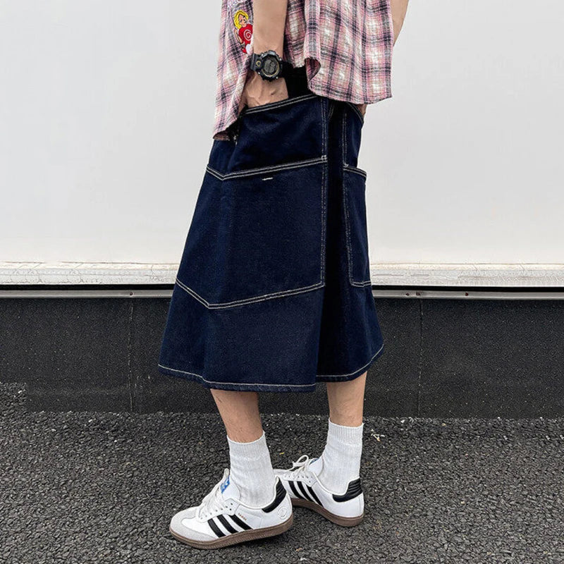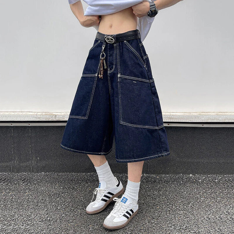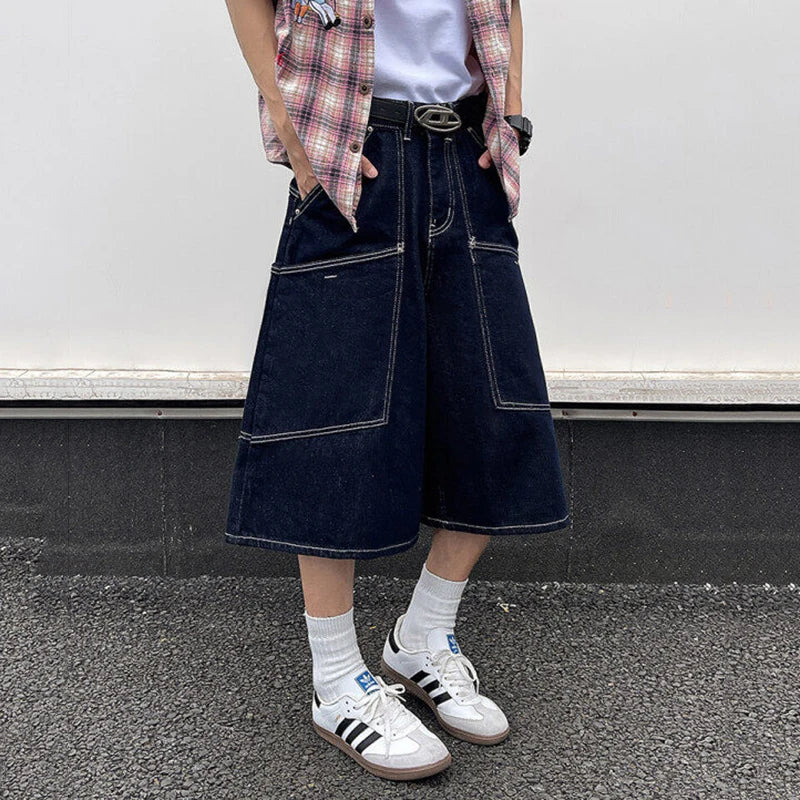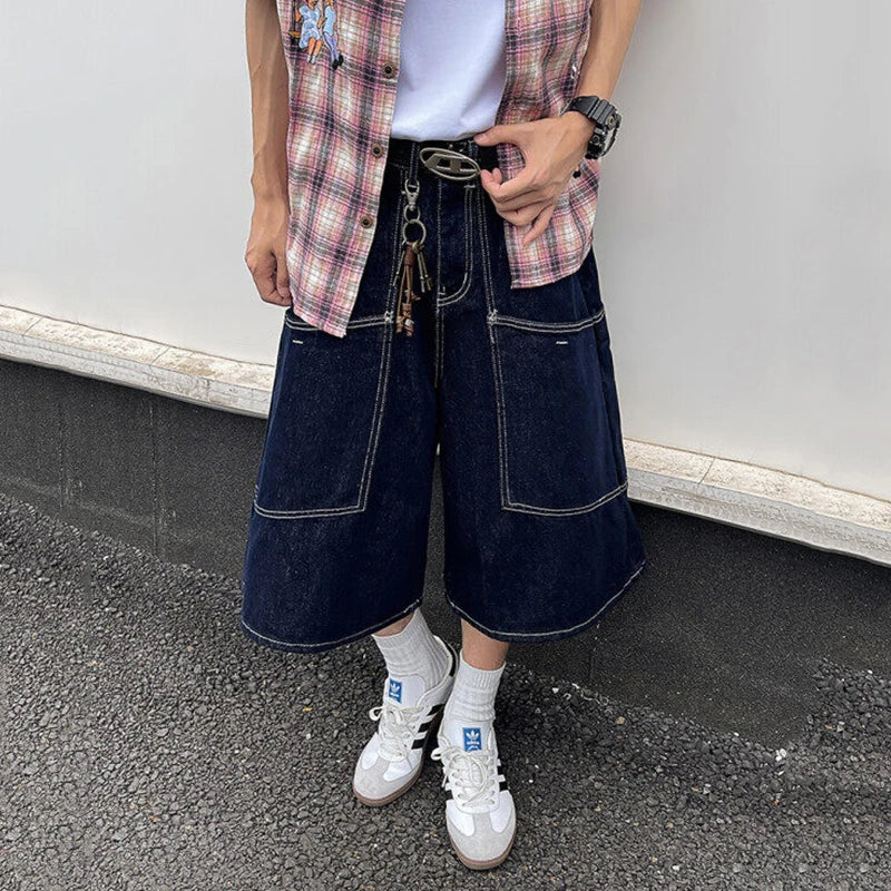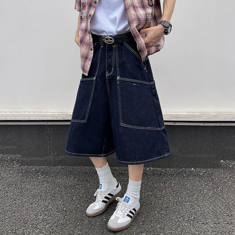 AIDASE - Trendy Men's Cargo Denim Shorts American Style Large Pocket Decoration Summer Niche Design Calf-Length Pants Tide 21E6606