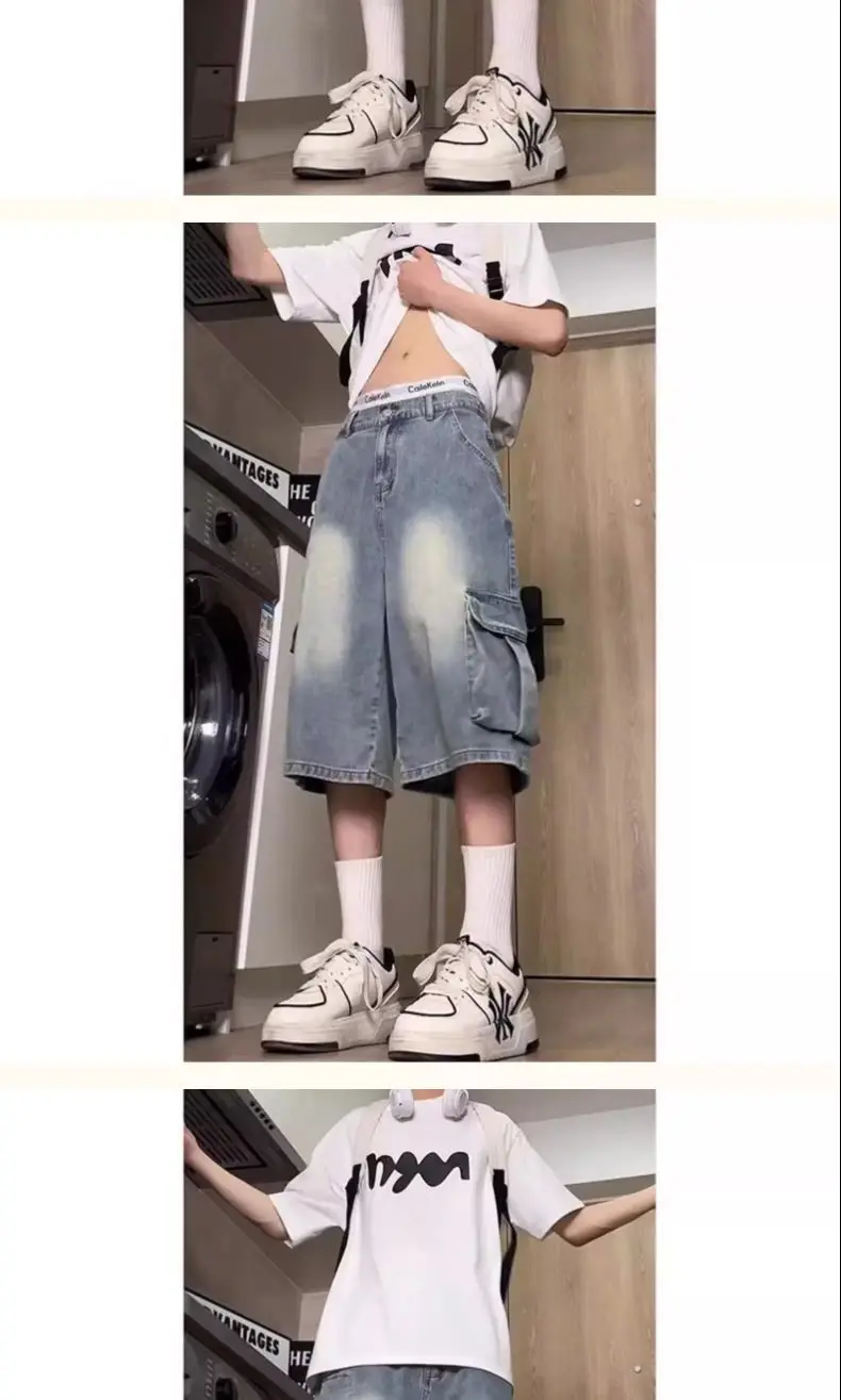 AIDASE - Washed and Used Work Clothes Denim Shorts Men's Retro Trendy Five-point Pants