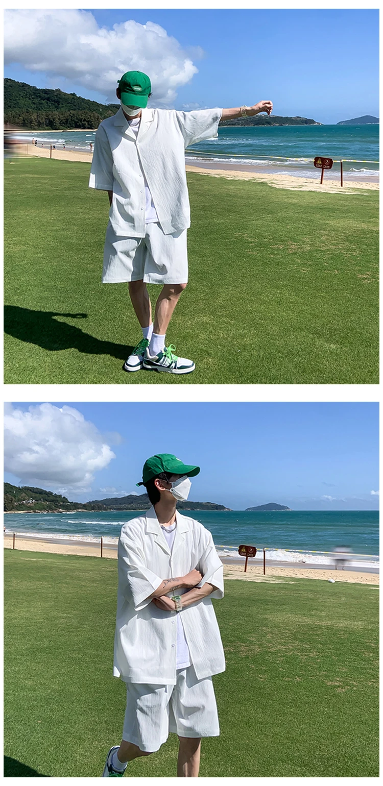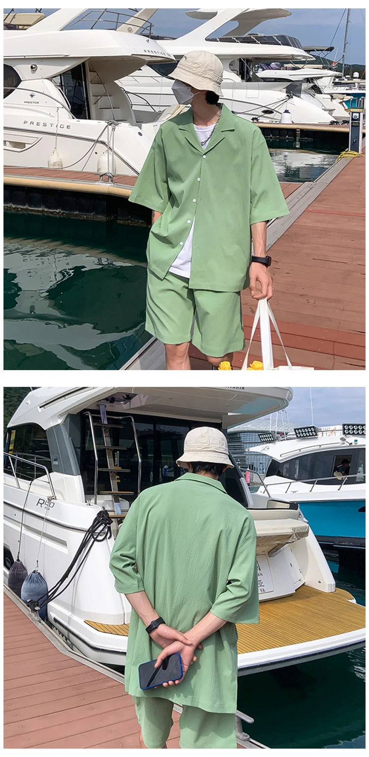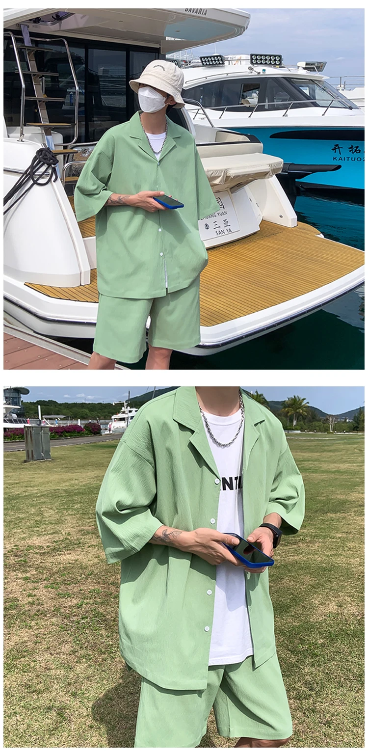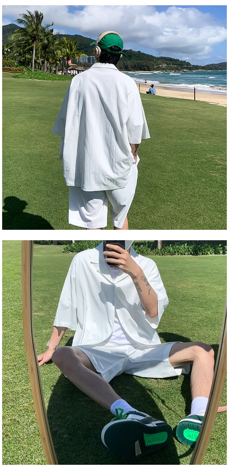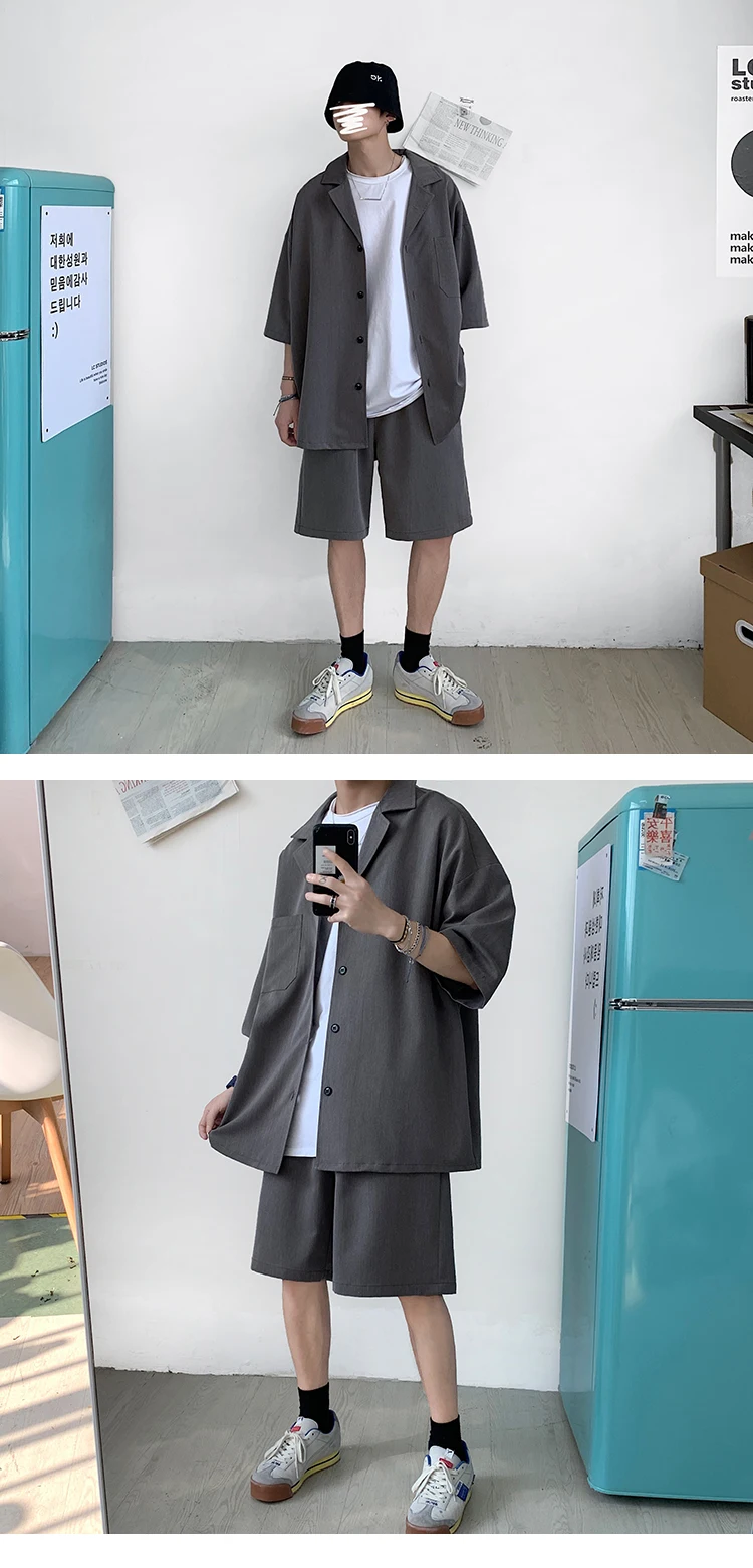 Korean Style Men's Set Suit Jacket and Shorts Solid Thin Short Sleeve Single Pocket Knee-Length Summer Oversized Clothing Man