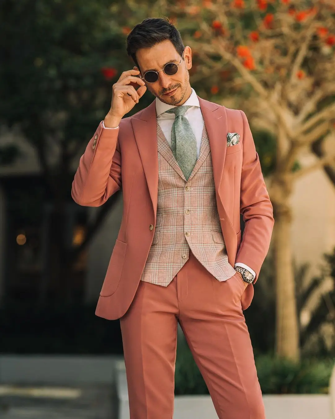 Aidase mens outfits Coral Red Men Suit Tailor-Made 3 Pieces Blazer Plaid Vest Pants Tuxedo One Button Business Fashion Wedding Groom Prom Tailored