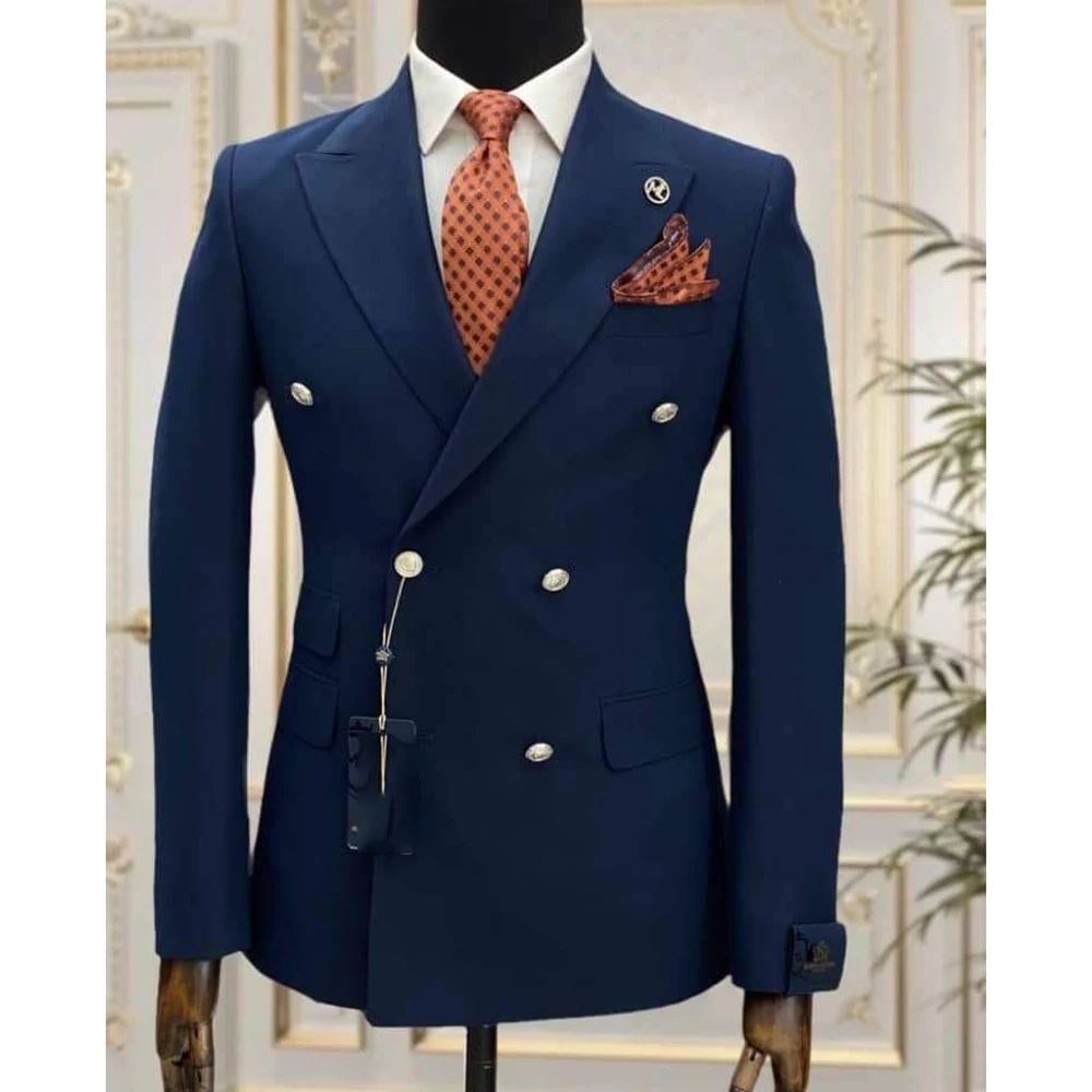 Formal Double Breasted Navy Blue Wedding Men's Suits High Quality Peak Lapel Groom Outfits Blazer Slim Fit 2 Piece Jacket Pants