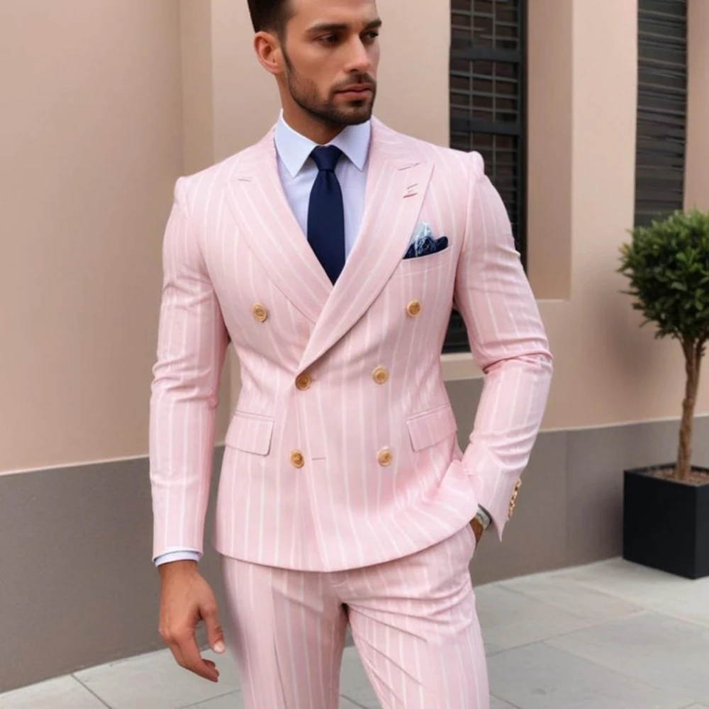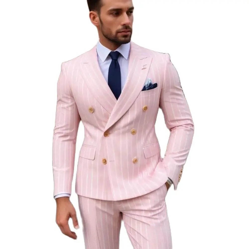 Aidase Formal Men's Suits Pink Stripe Double Breasted Peak Lapel Blazer High Quality Wedding 2 Piece Jacket Pants Classic Outfits Sets