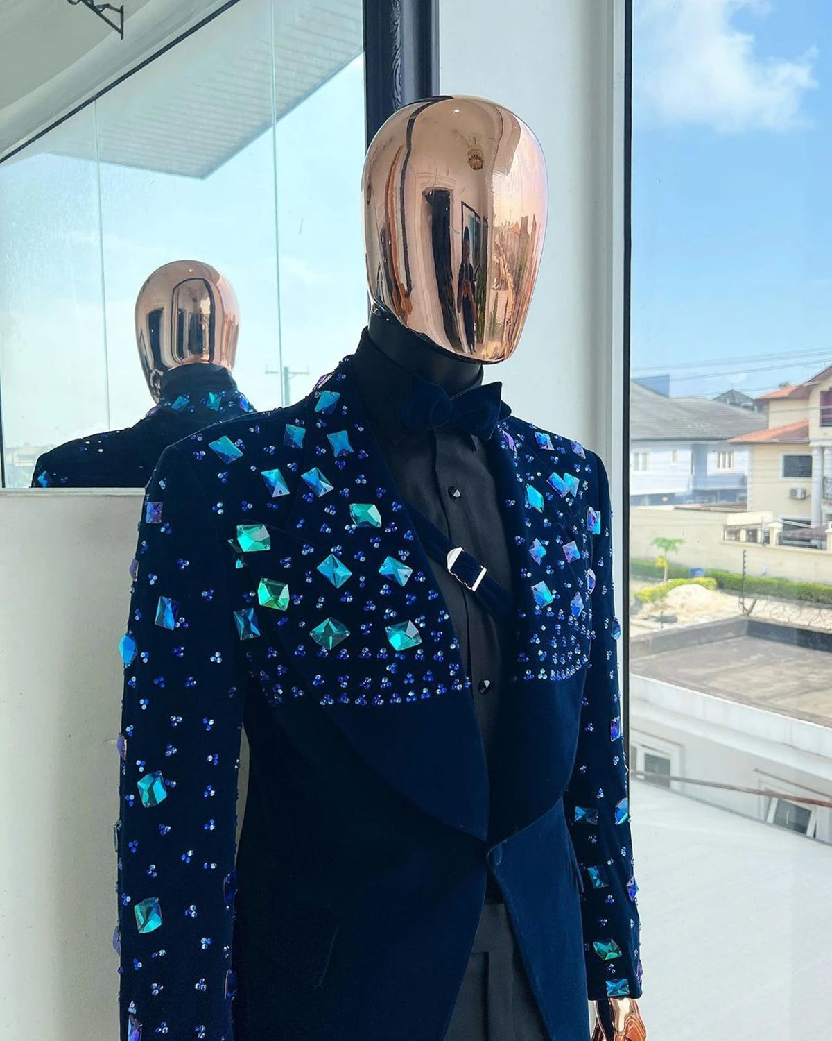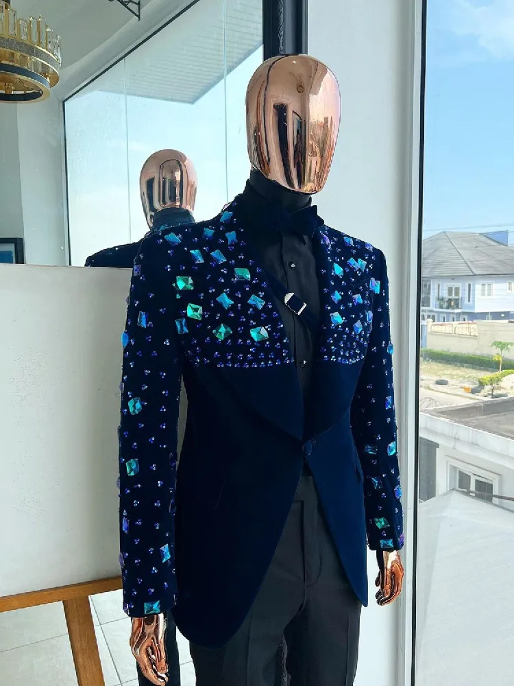Aidase Luxury Men's Suits Tailored 2 Pieces Velvet Blazer Black Pants One Button Diamonds Beaded ShinyWedding Groom Tailored Plus Size