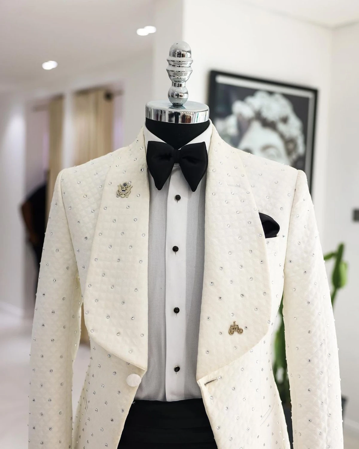 Aidase Men's Suit 2 Pieces White Blazer Black Pants One Button Wide Lapel Business Beads Formal Work Wear Wedding Groom Costume Homme