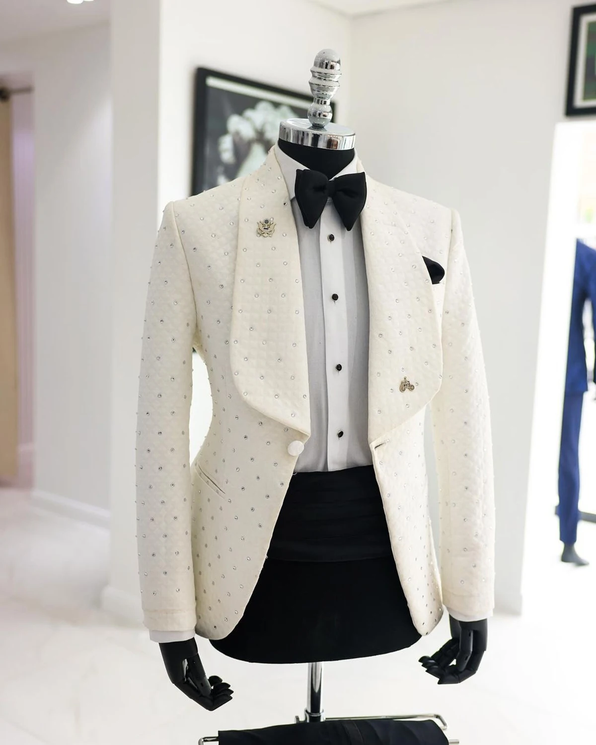 Men's Suit 2 Pieces White Blazer Black Pants One Button Wide Lapel Business Beads Formal Work Wear Wedding Groom Costume Homme
