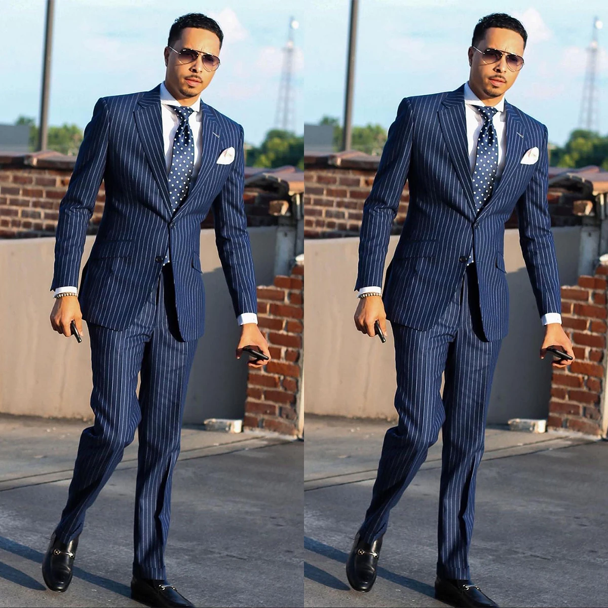 Aidase Navy Men's Suit 2 Pieces Blazer Pants Single Breasted Peaked Lapel Formal Pinstripes Wedding Groom Formal Tailored Costume Homme