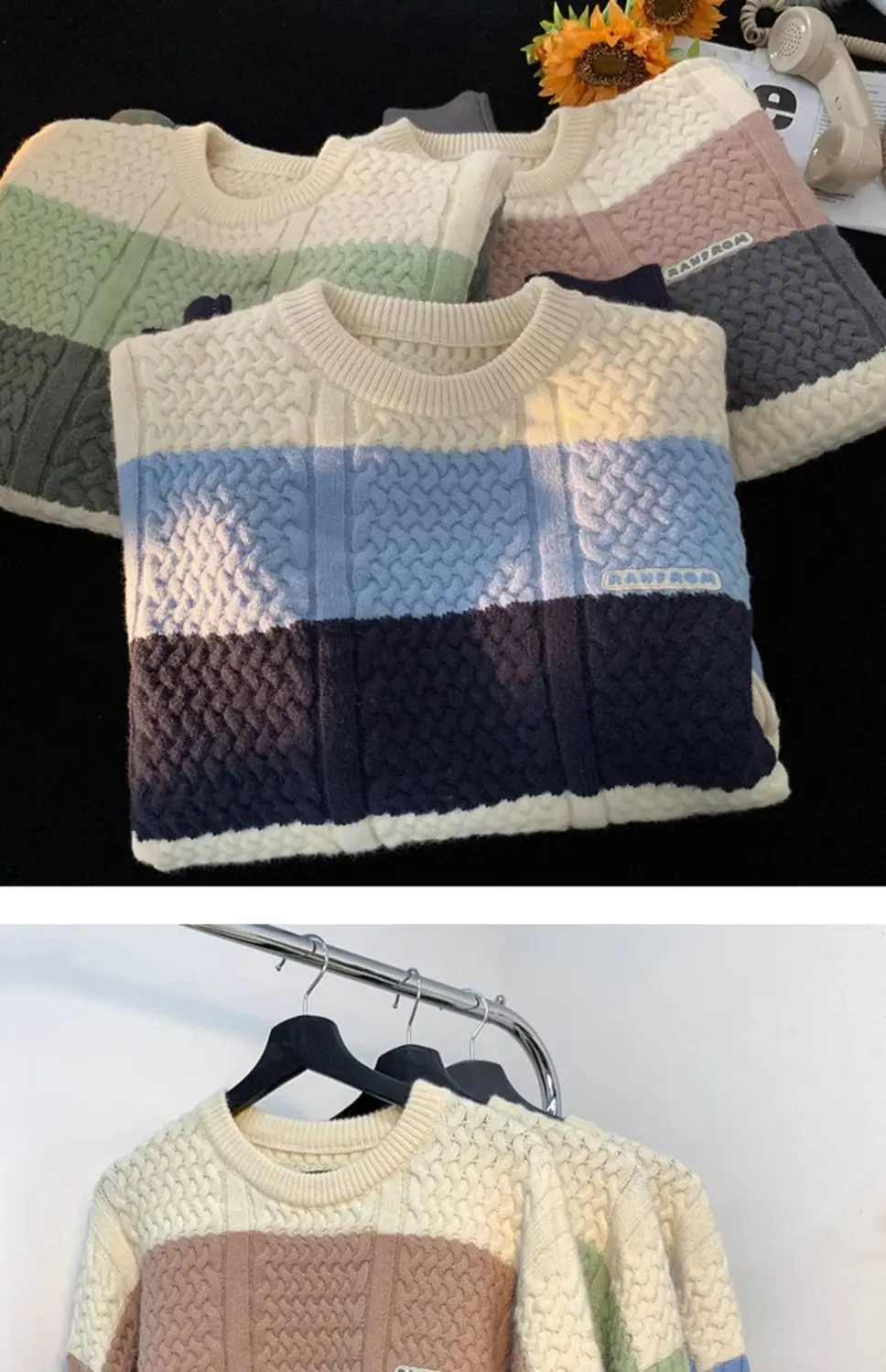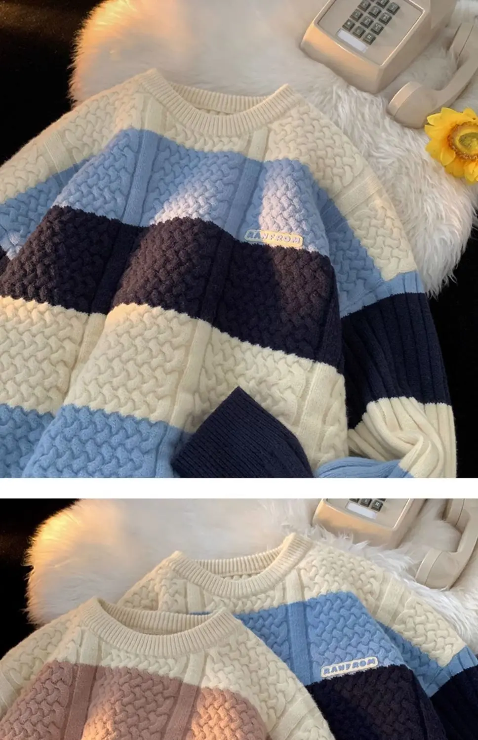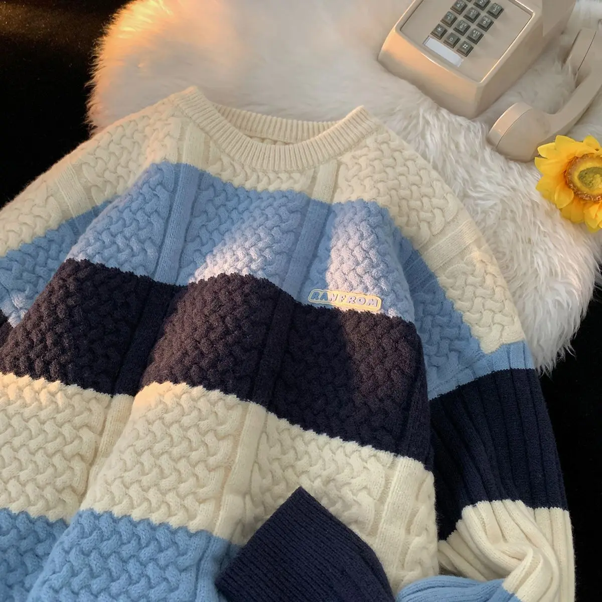 Aidase Winter Men and Women Trendy Personalized Round Neck Striped Sweater Couple Lazy Style New Loose Casual Pullover Top Harajuku Y2k