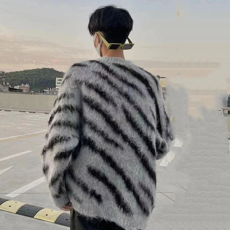 Aidase American Niche Zebra Print Men's Sweater Round Neck Pullover Mohair Knitted Jacket Trendy Contrast Color Male Tops