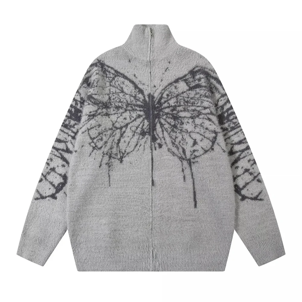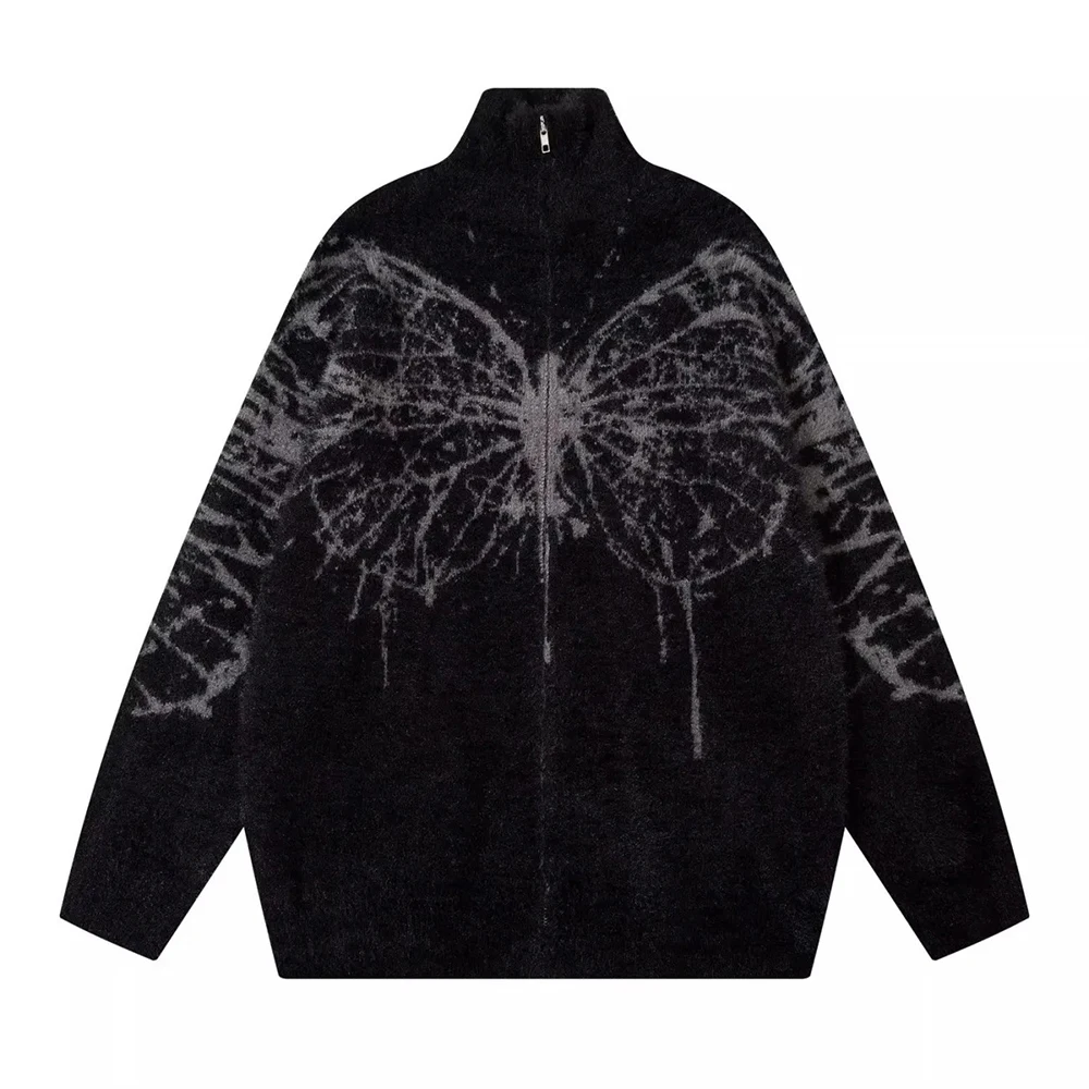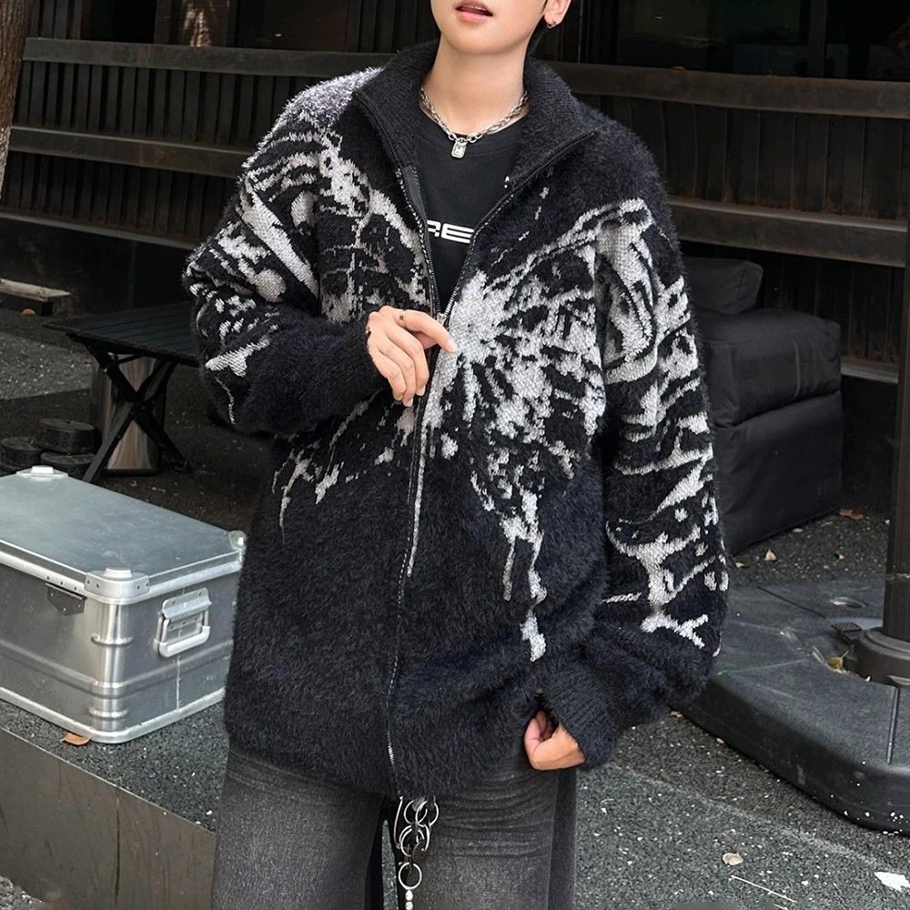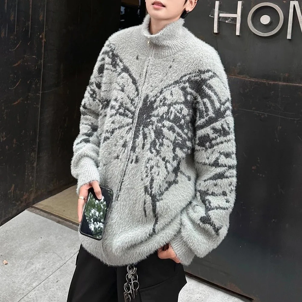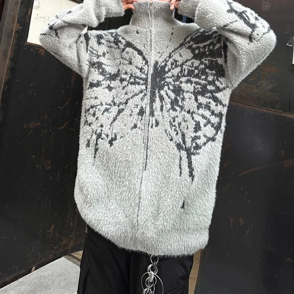 AIDASE - American Retro Butterfly Jacquard Zipper Cardigan Sweater Men Autumn Winter Trendy Street Lazy Loose Knitted Jacket Men Clothing
