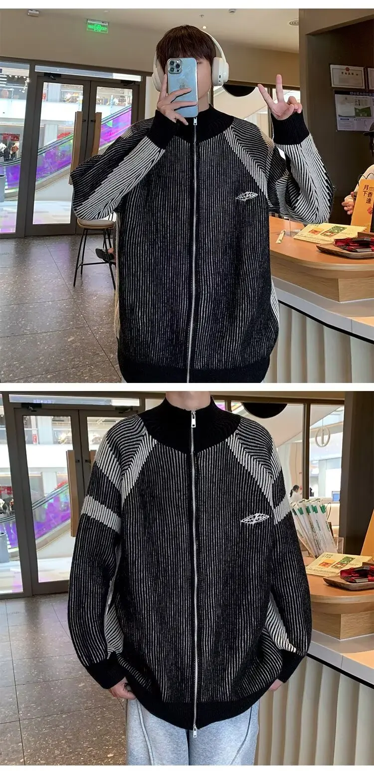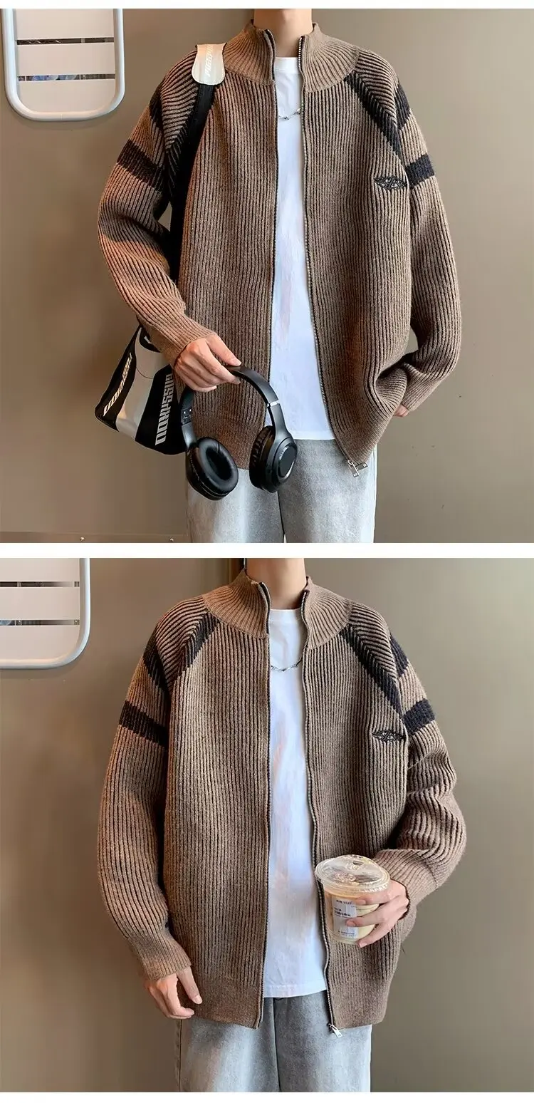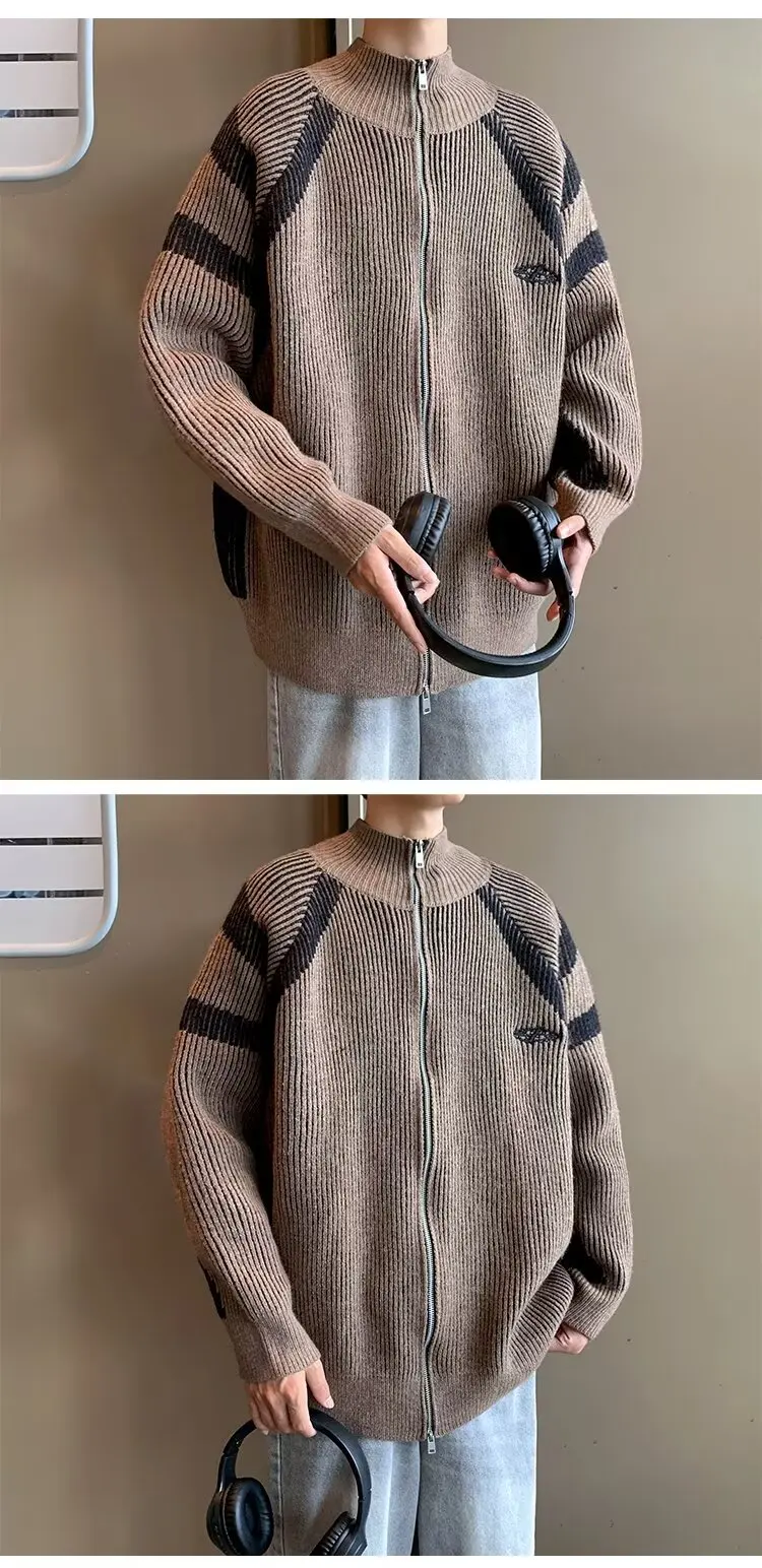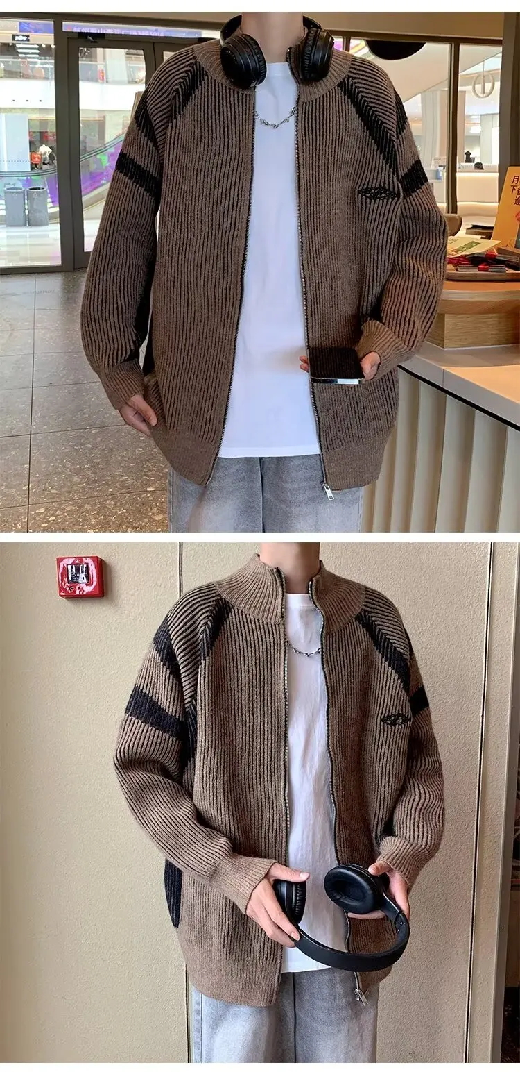 AIDASE - American Retro Striped f High Collar Sweater Coat Casual Sle Knitted Autumn Winter Outerwear for Men And Women