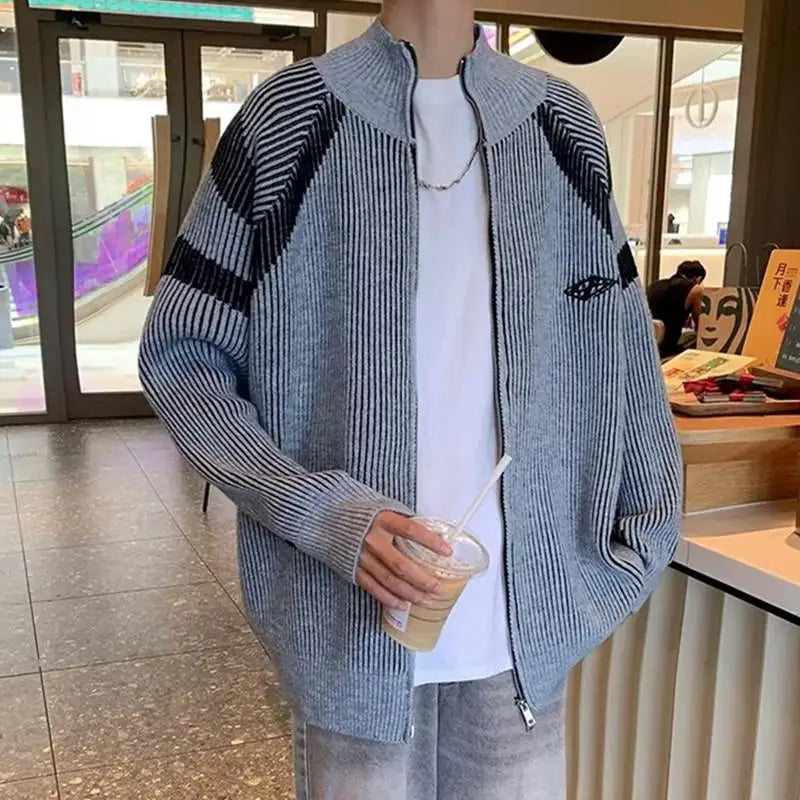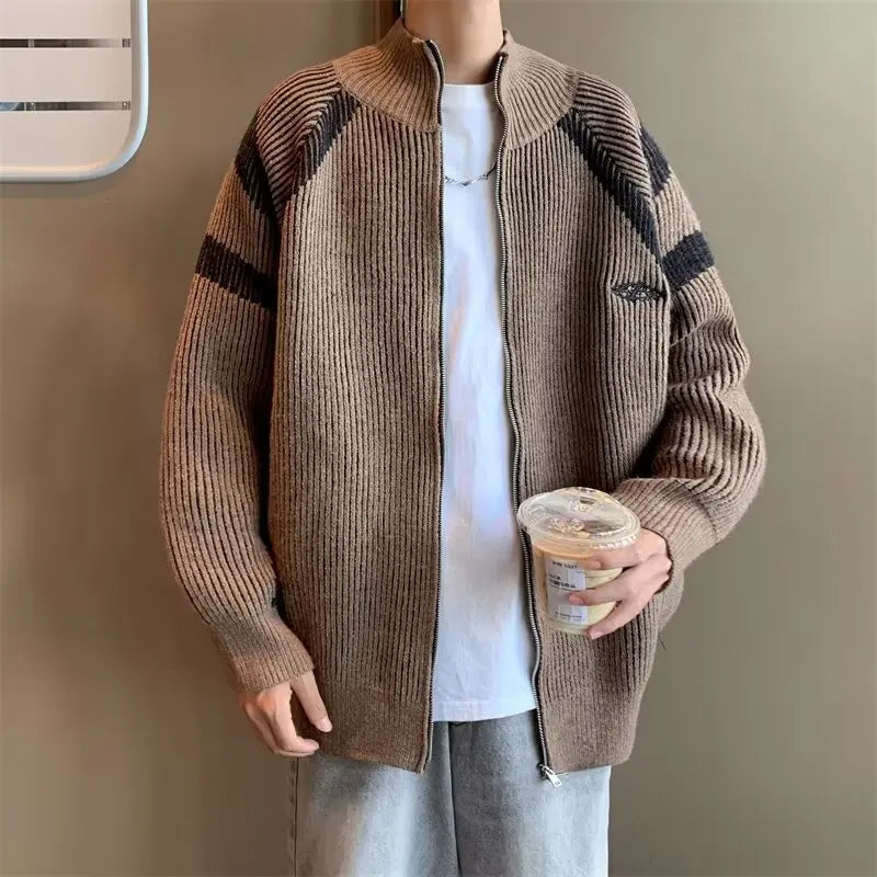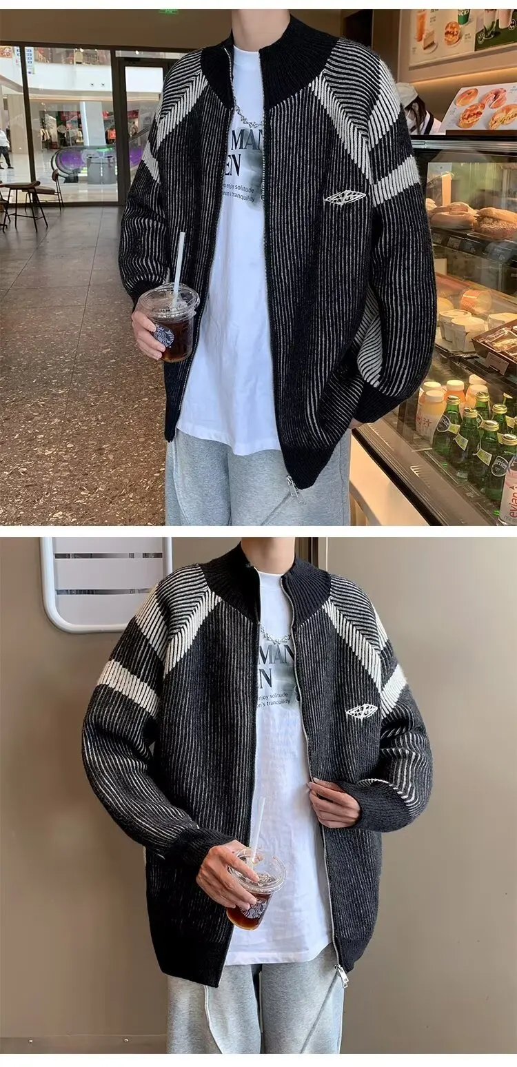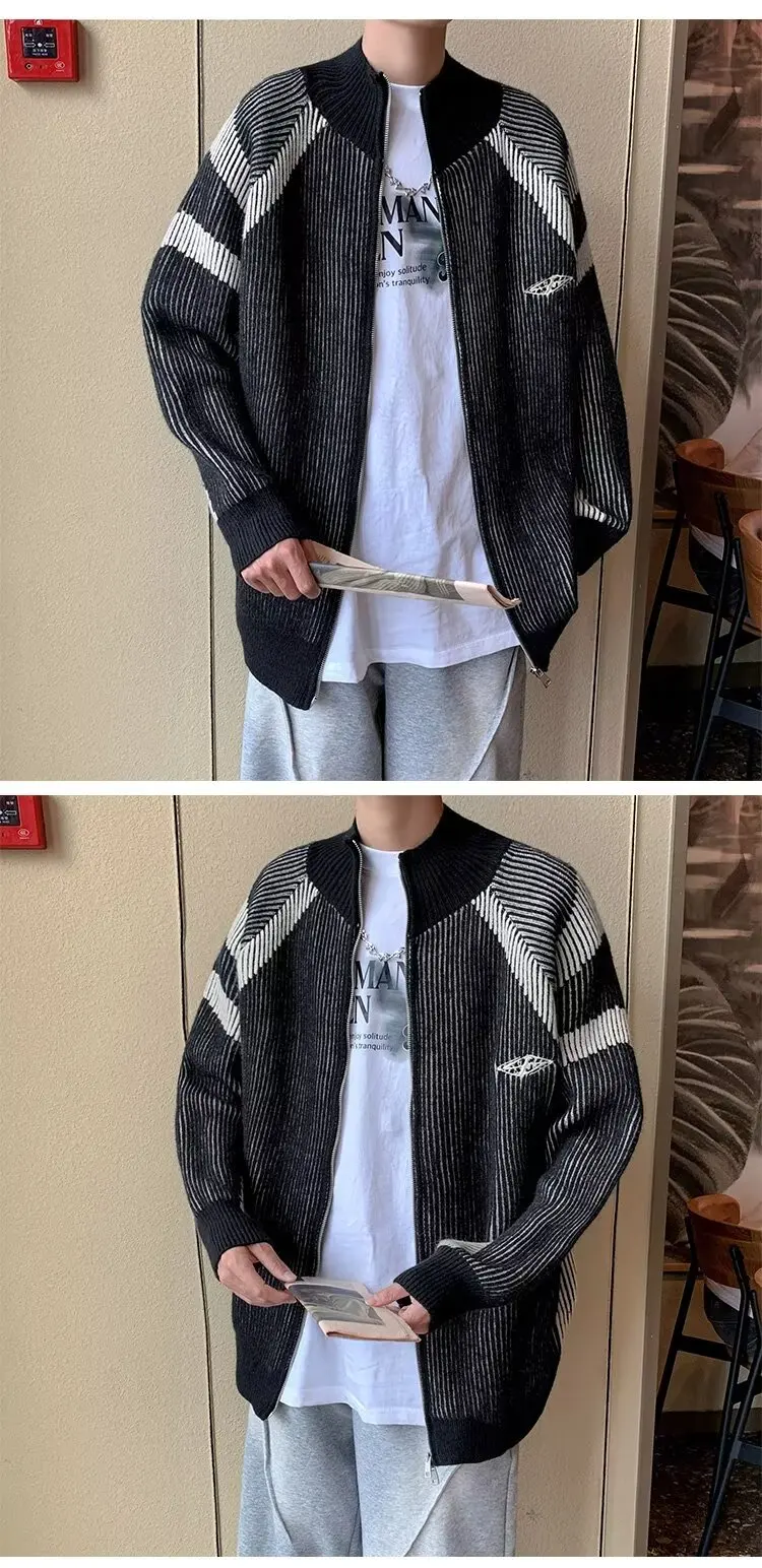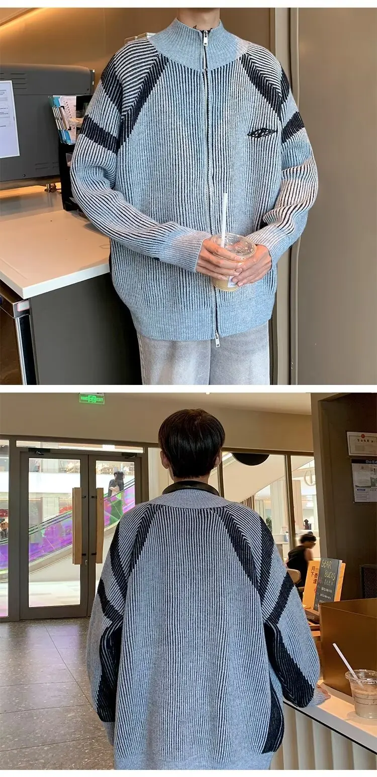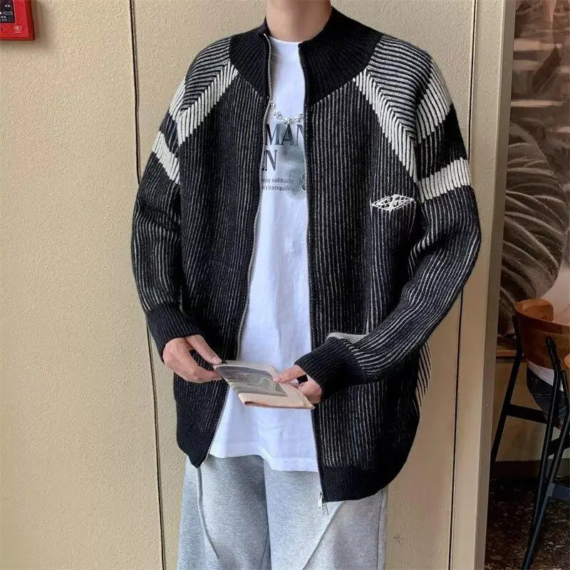 AIDASE - American Retro Striped f High Collar Sweater Coat Casual Sle Knitted Autumn Winter Outerwear for Men And Women