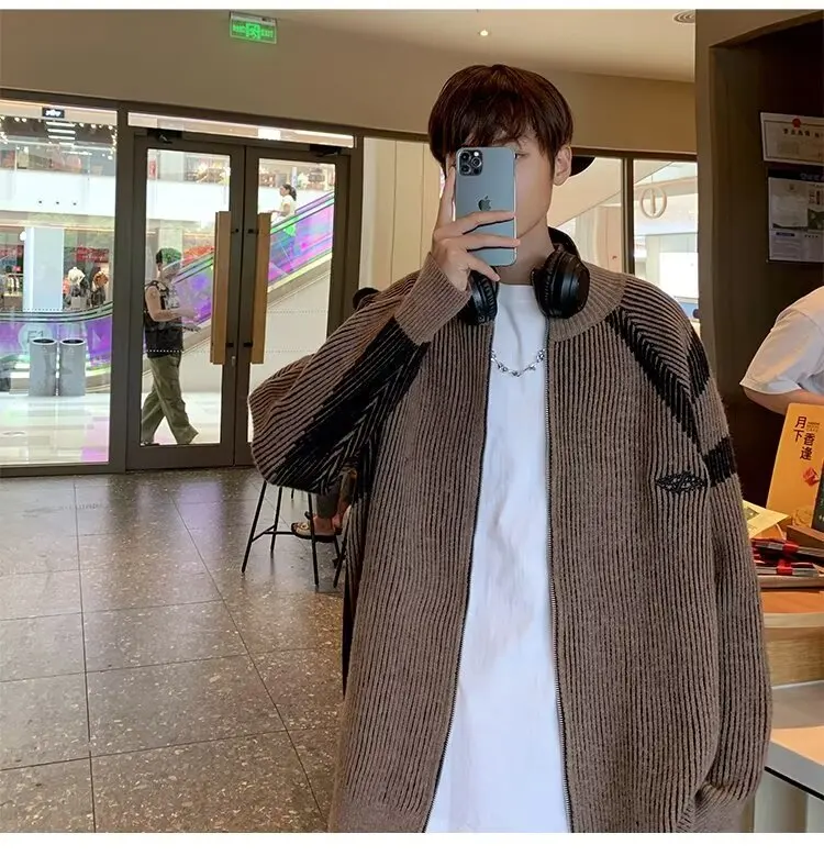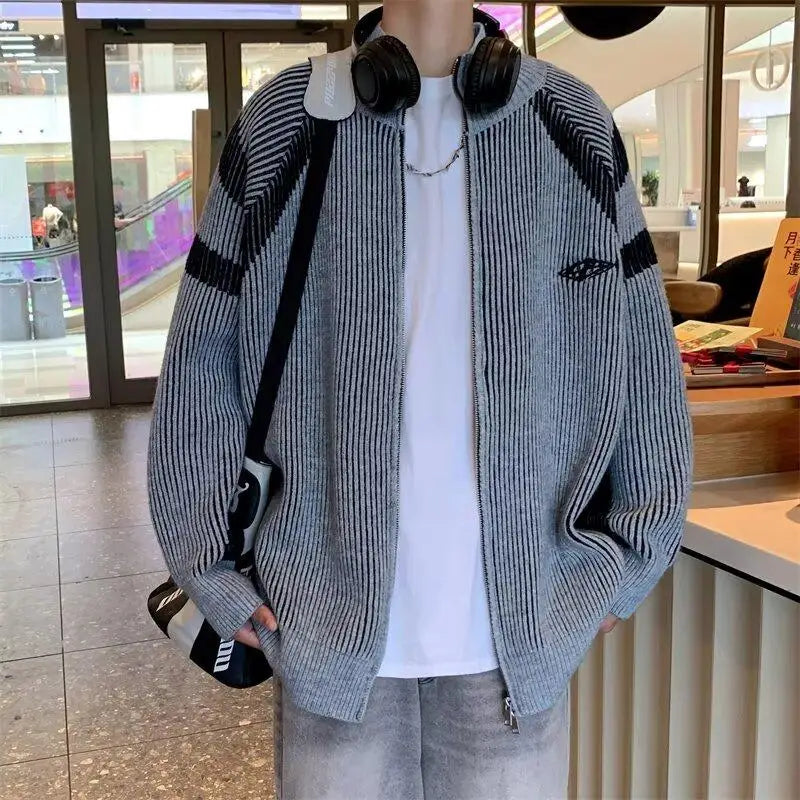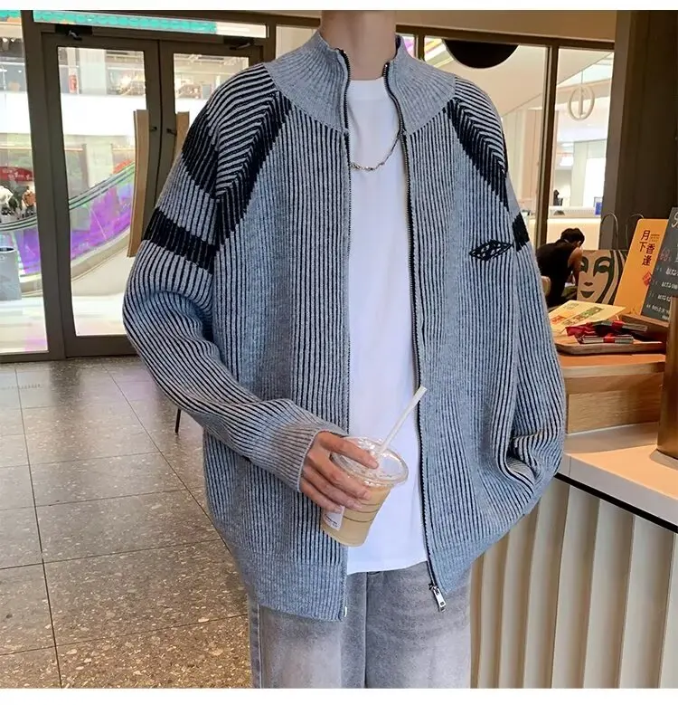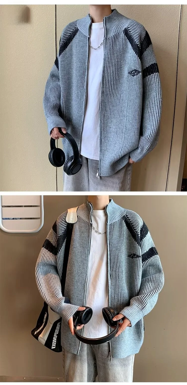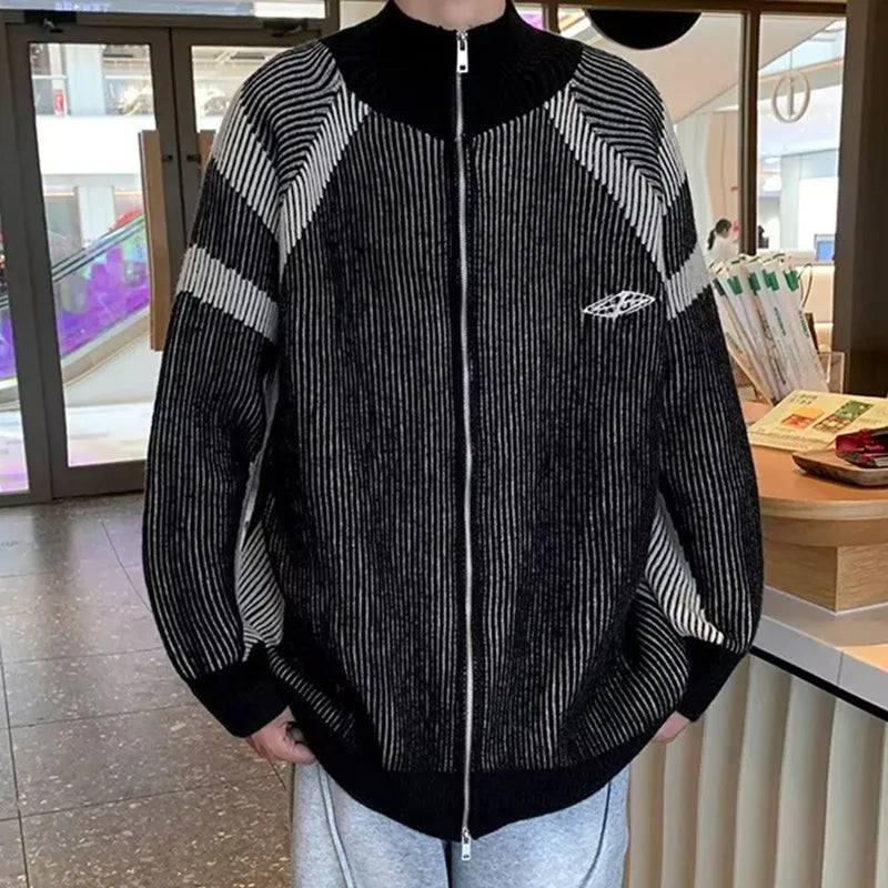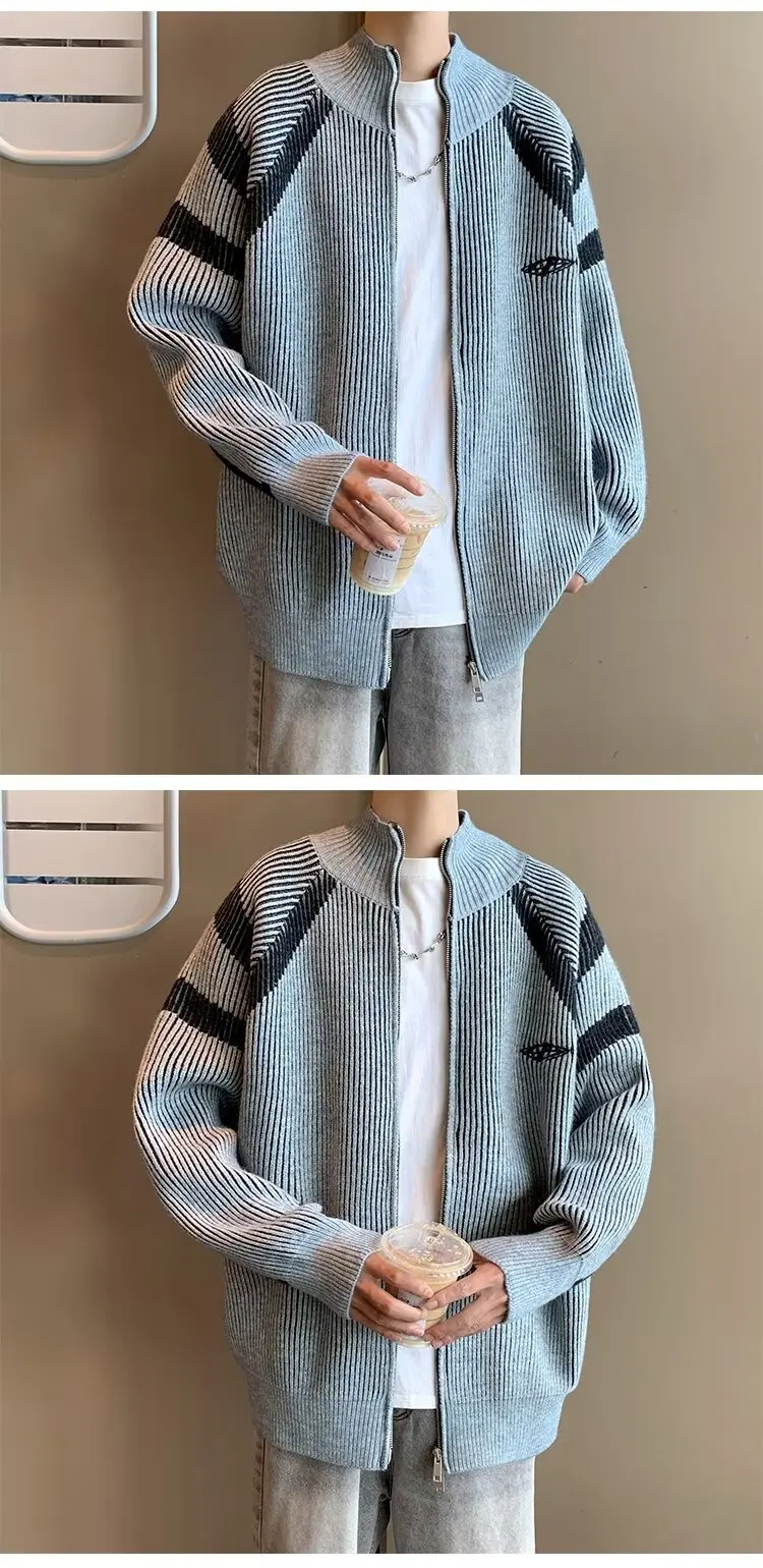 AIDASE - American Retro Striped f High Collar Sweater Coat Casual Sle Knitted Autumn Winter Outerwear for Men And Women