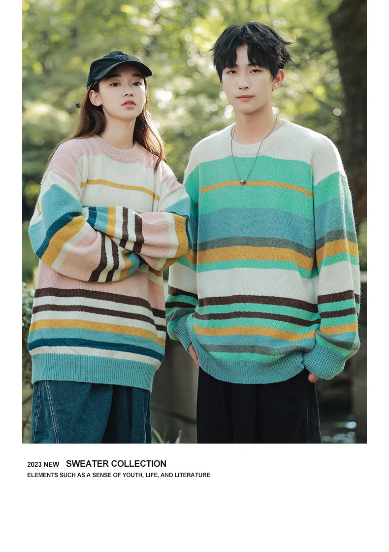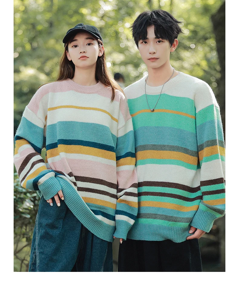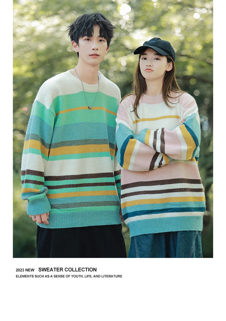 Aidase Autumn Striped Sweaters Men Korean Loose Streetwear Men's Pullovers Oversized Knitted Sweater Men Green Striped Sweater Women