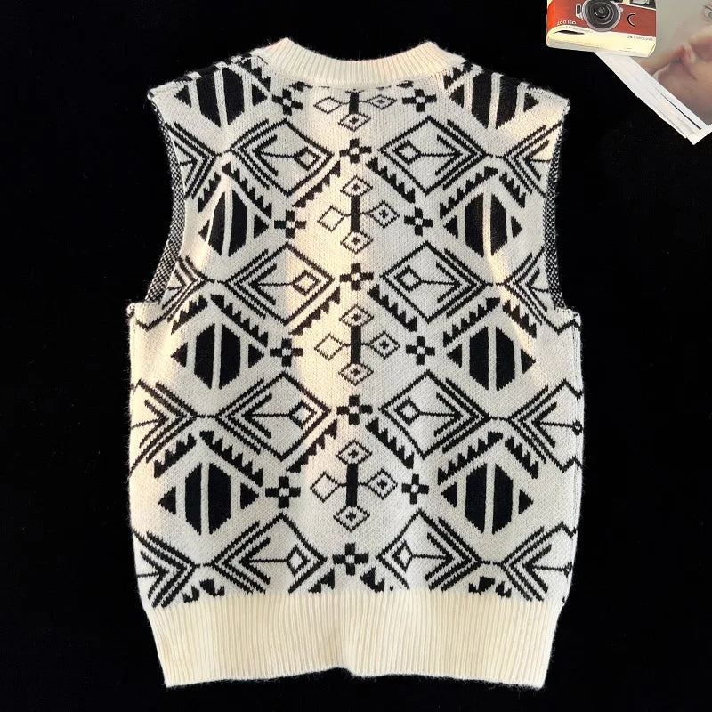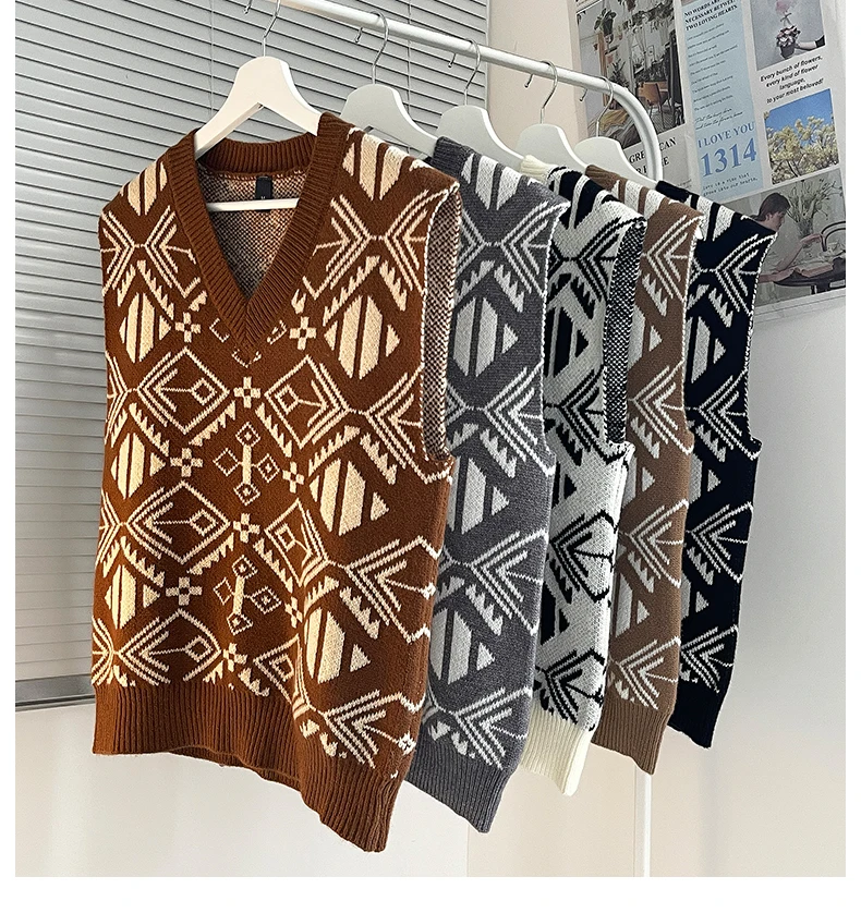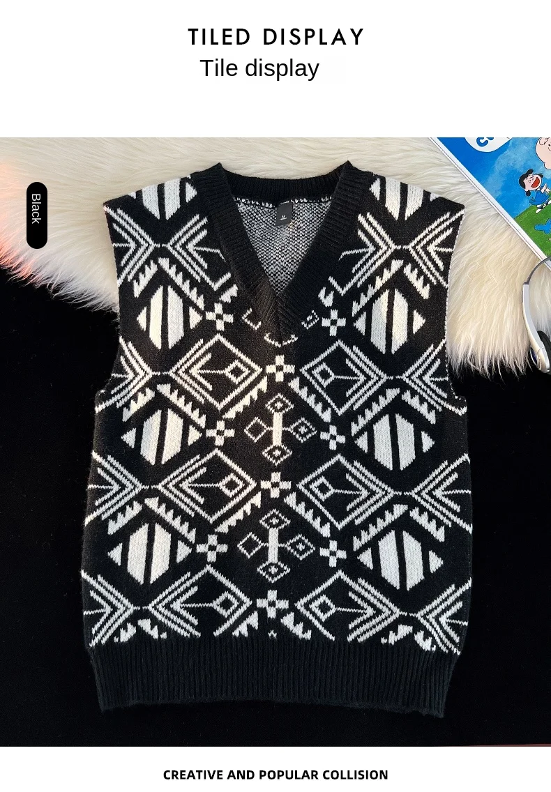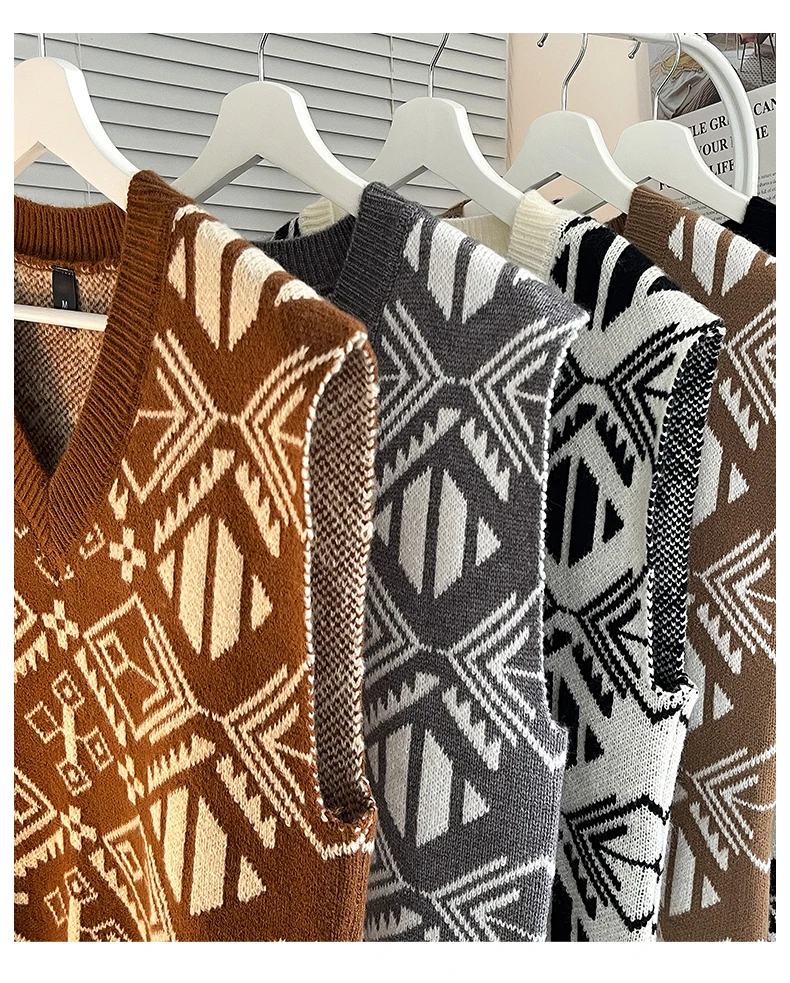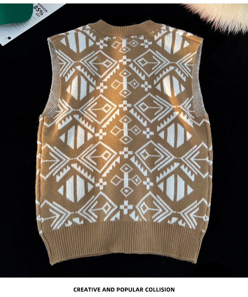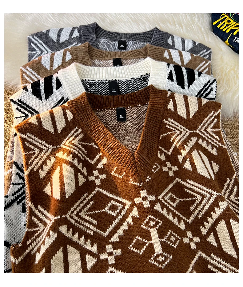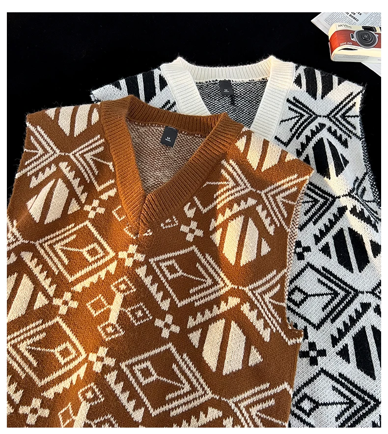 AIDASE - Fashion College Style Sweater Vest Men's V-neck Japanese Retro Knitted Sweater Daily Sleeveless Simple Jacquard Design