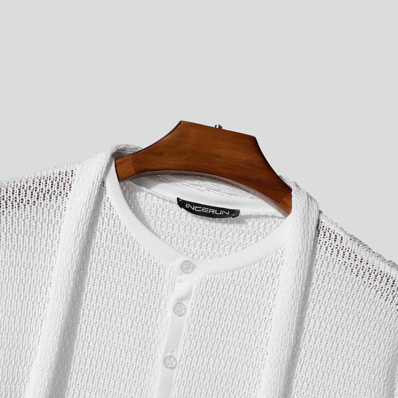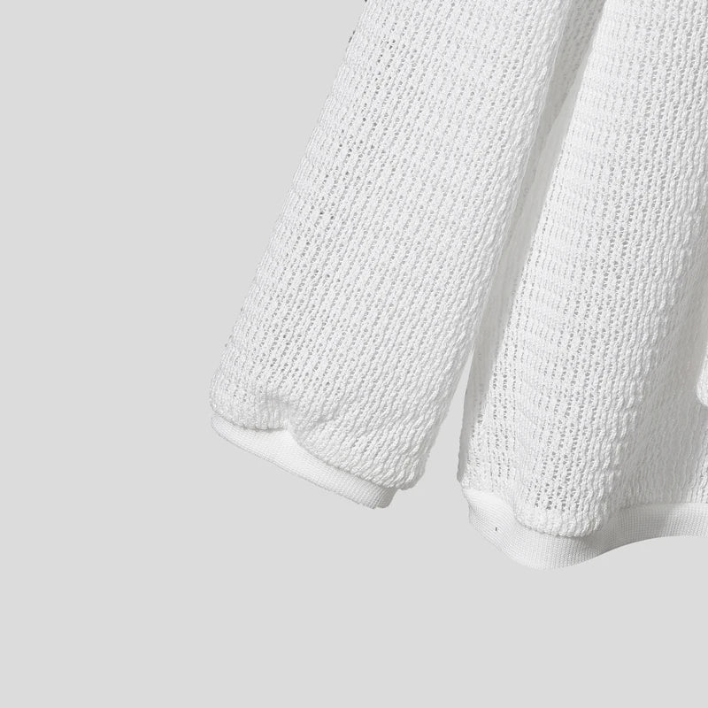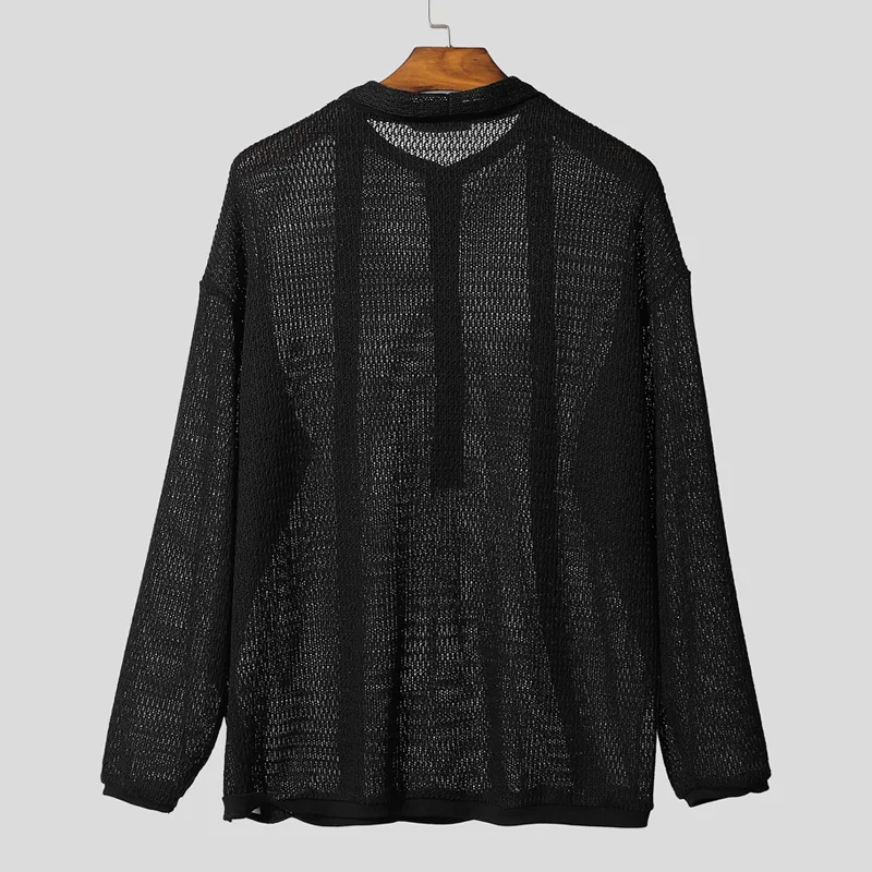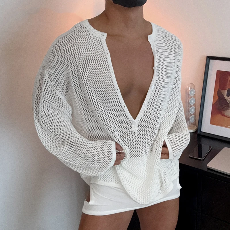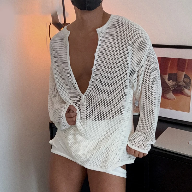 AIDASE - Men Sweater Solid V Neck Long Sleeve Hollow Out See Through Male Pullovers Streetwear Loose Fashion Casual Men Clothing