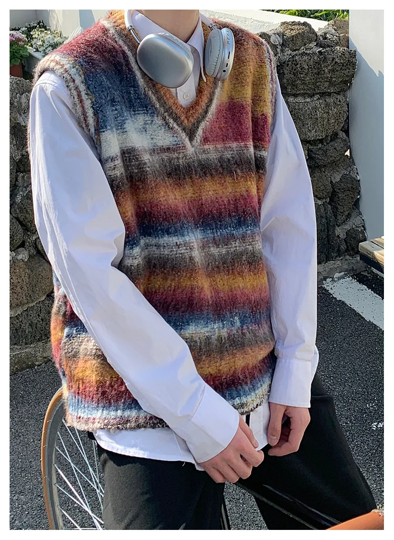 Aidase Sweater Vest Casual Loose V-neck Striped Spring Autumn Tie Dye Fashion Retro Soft Japanese Style Unisex Daily Knitting Youthful