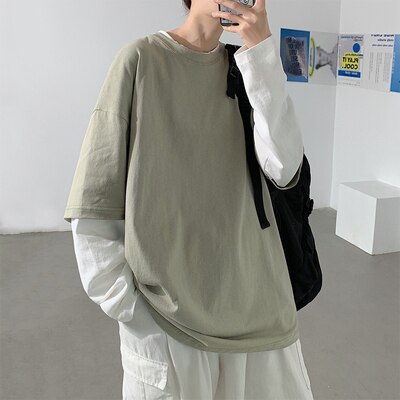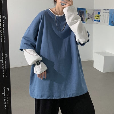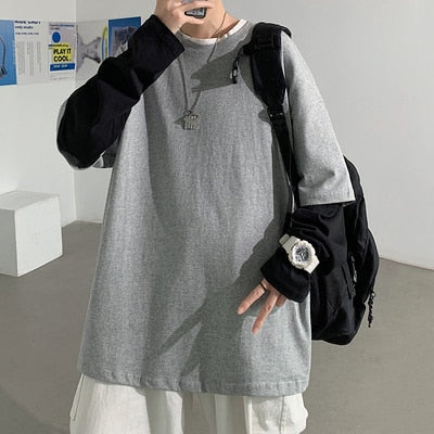 Autumn Spring Fashion Oversized Fake Two Pieces Black Grey Tshirt Men's Long Sleeve Casual O Neck T-Shirt For Man TOP TEES