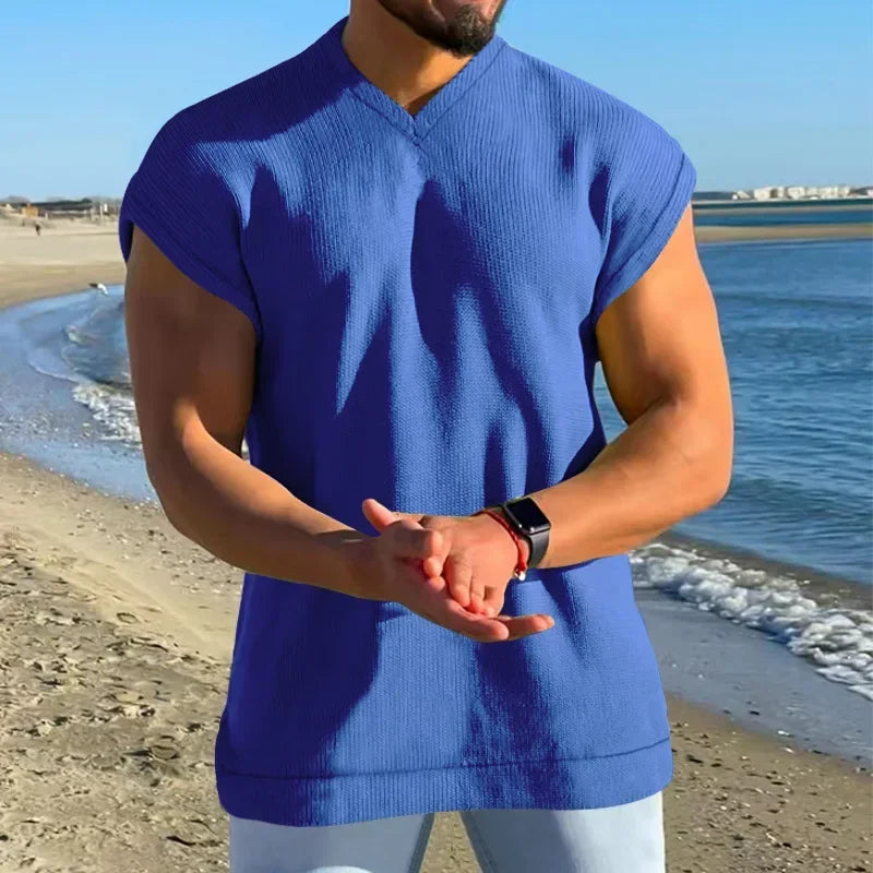Aidase Man White Blue Sleeveless T-shirt Summer V-neck Tshirt Xxxl Casual Fit Tank Top Male Waffle Fabric Boys Plus Size Tee Shirt