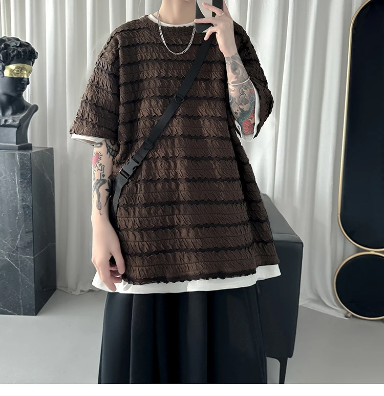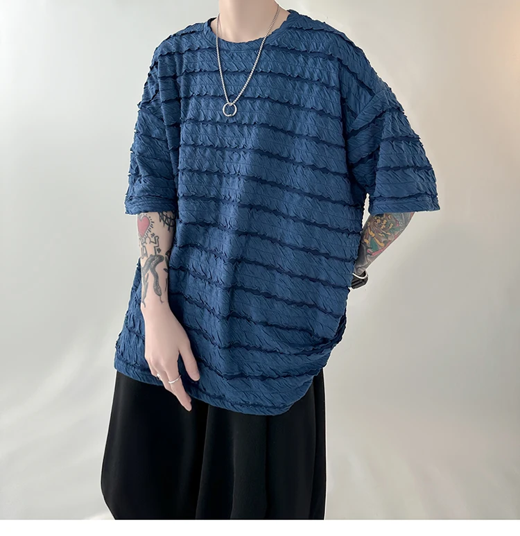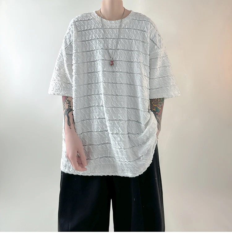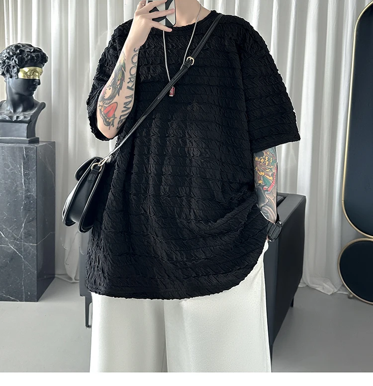 Summer Short Sleeve T-shirt Men Fashion Oversized Pleated T Shirt Men Streetwear Korean Loose Round Neck Tshirt Mens Top S-3XL
