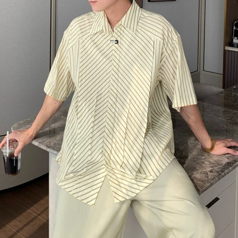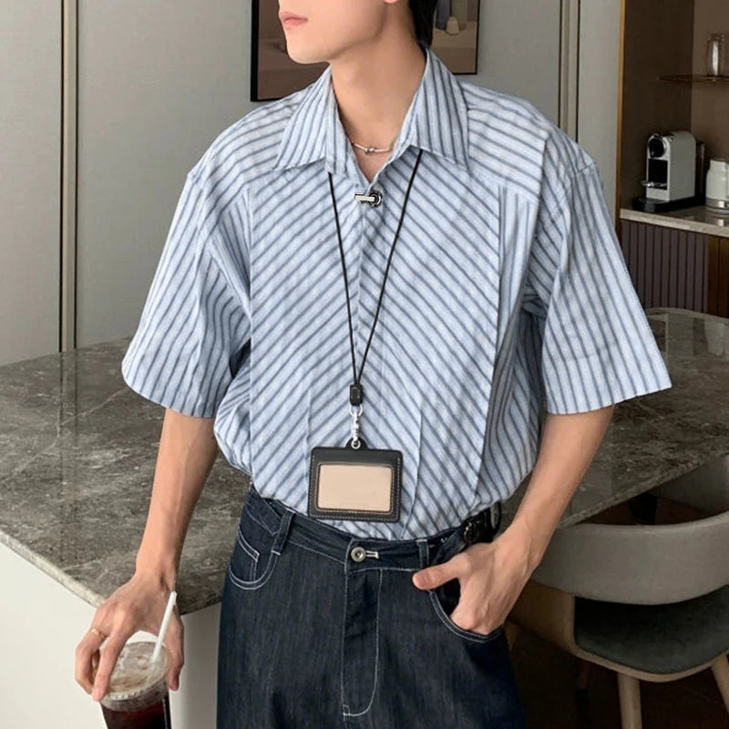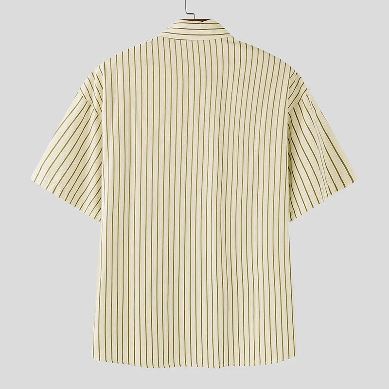 AIDASE  -  Men Shirt Striped Patchwork Lapel Short Sleeve Button Men Clothing Streetwear Korean Style Loose Fashion Casual Tops Men