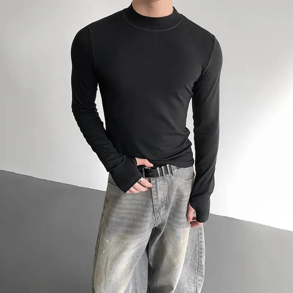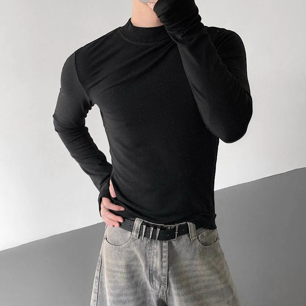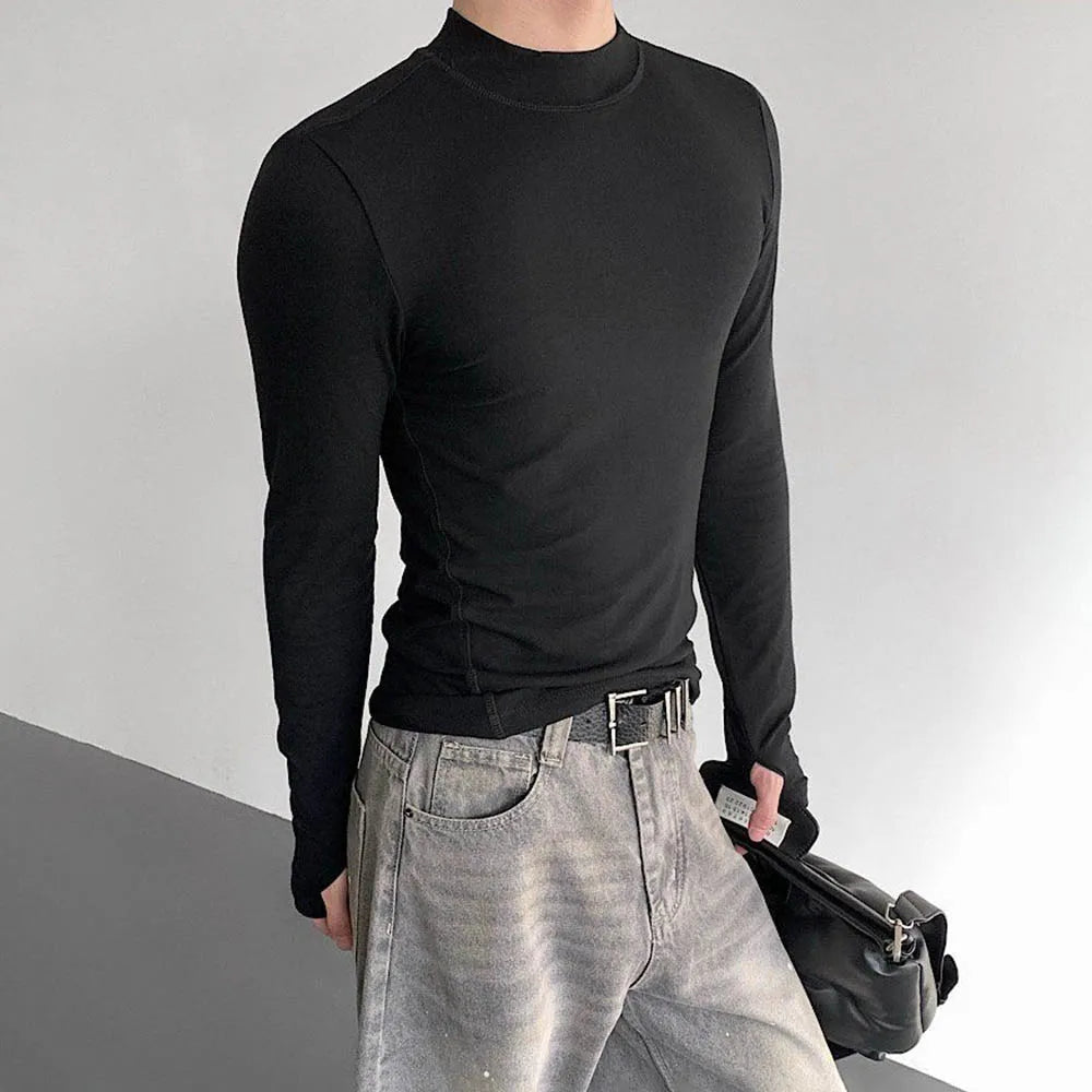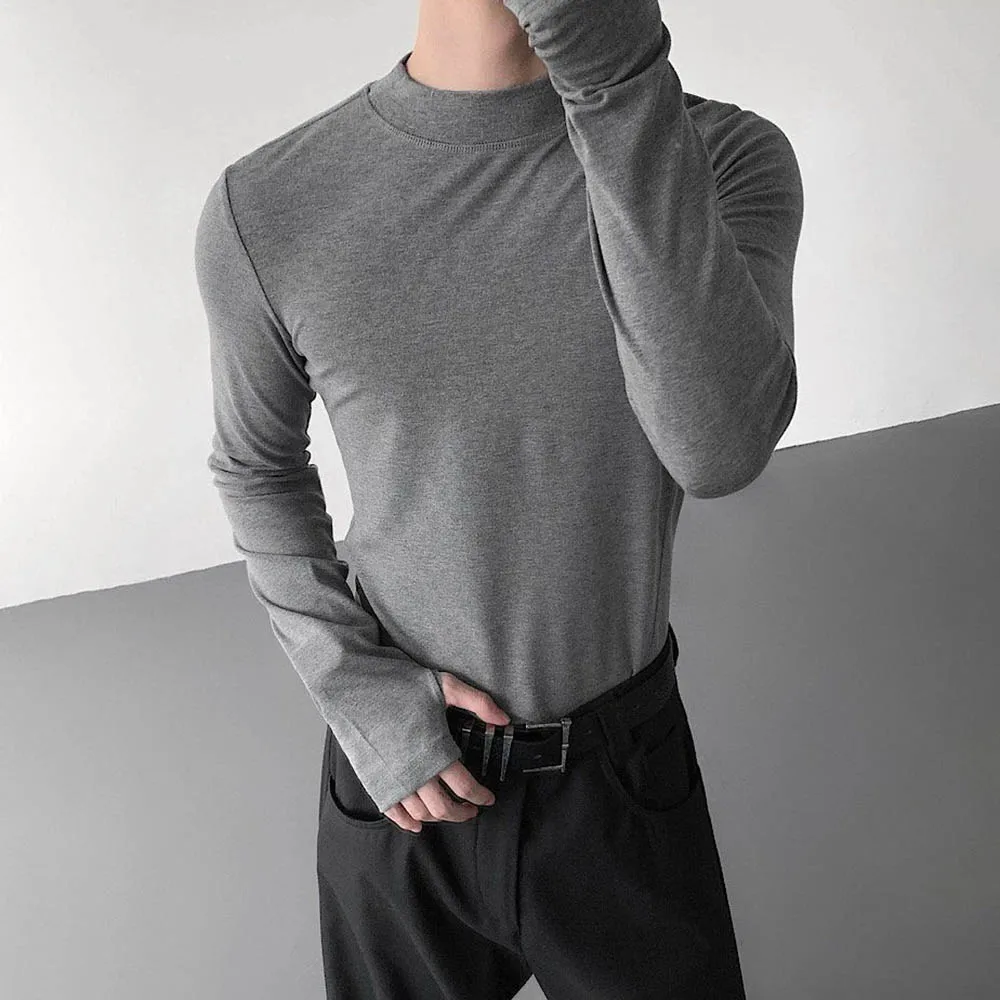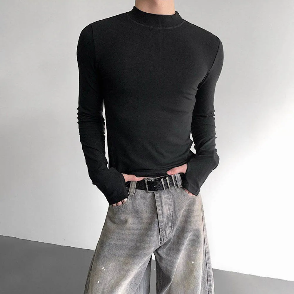 AIDASE - Men's Solid Color Half Turtleneck Long-Sleeved T-Shirt American Retro Fashion Trend High Street Slim Breathable Niche Men's Tops