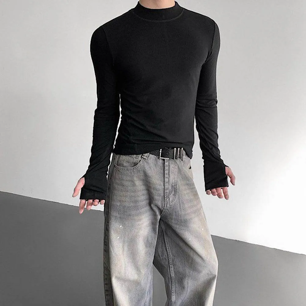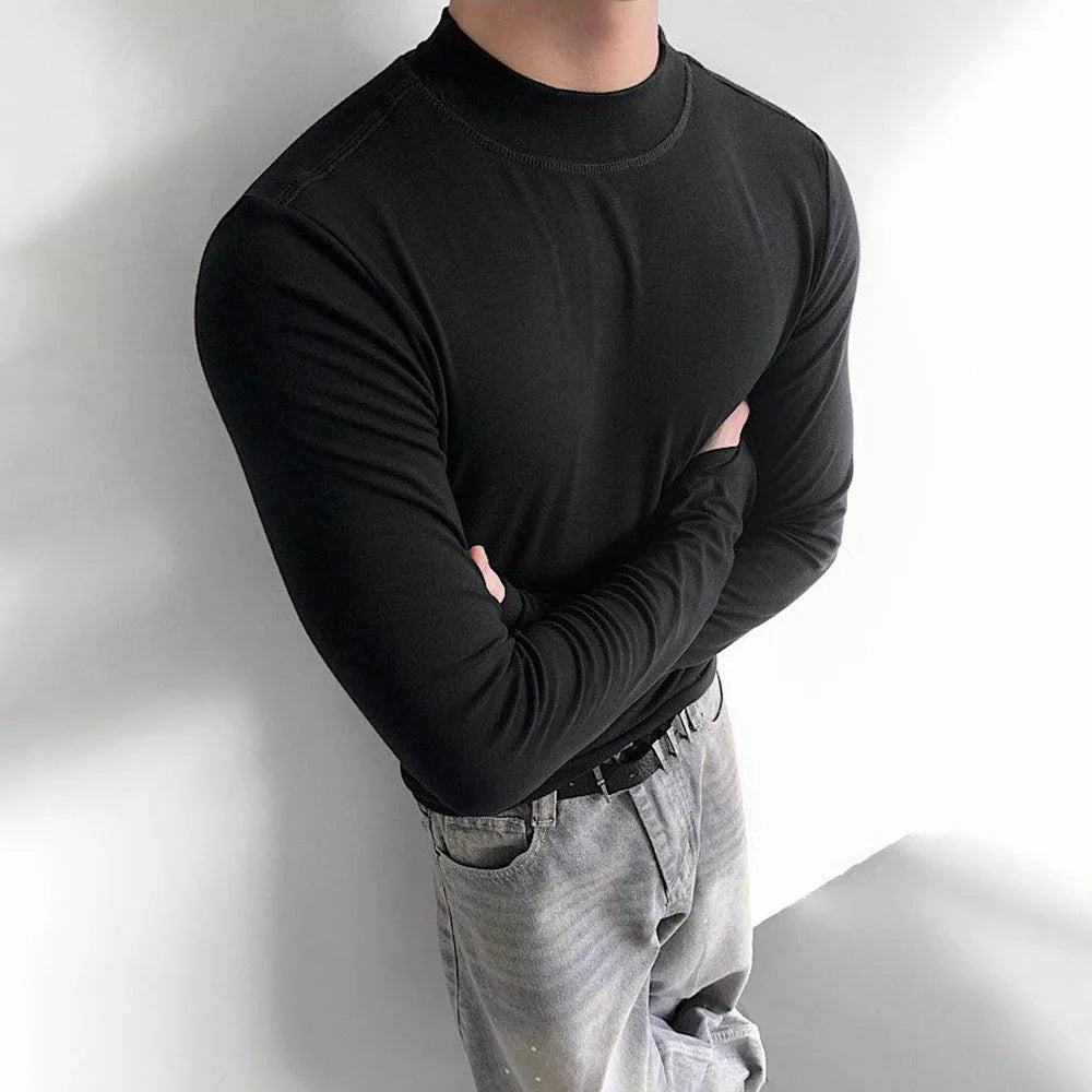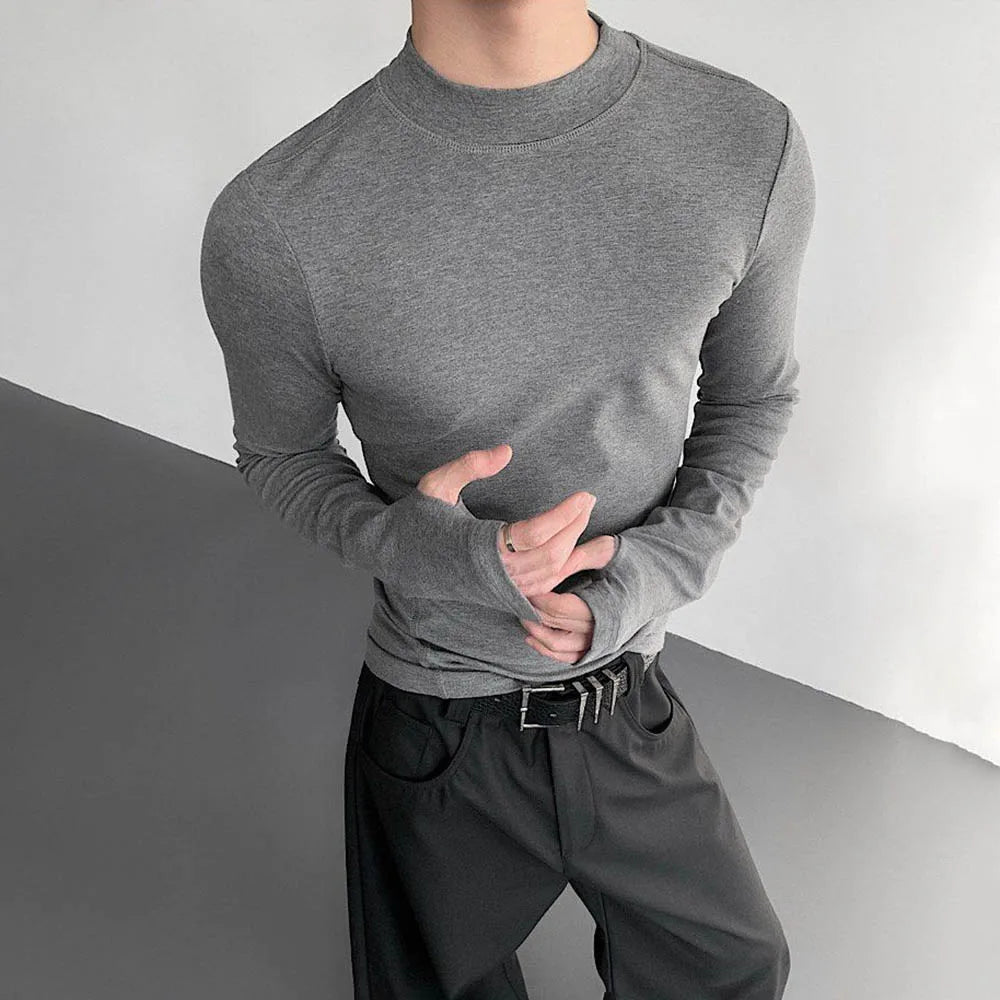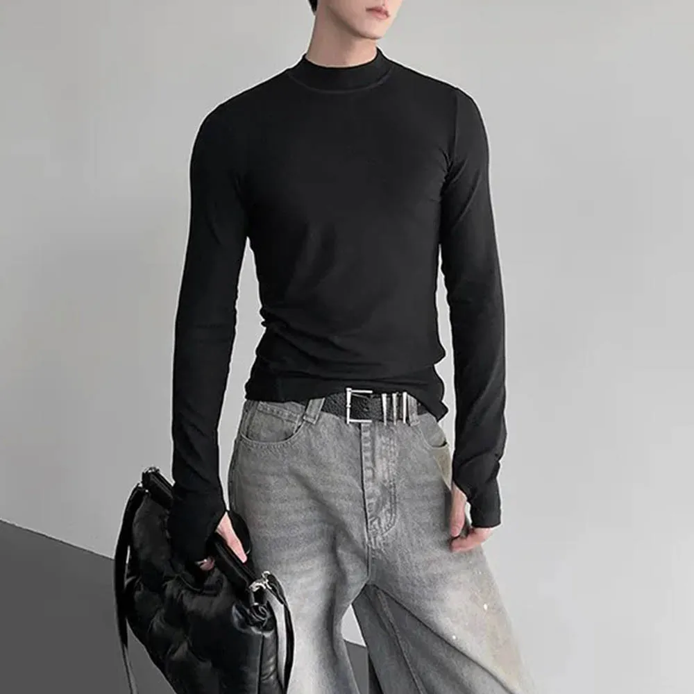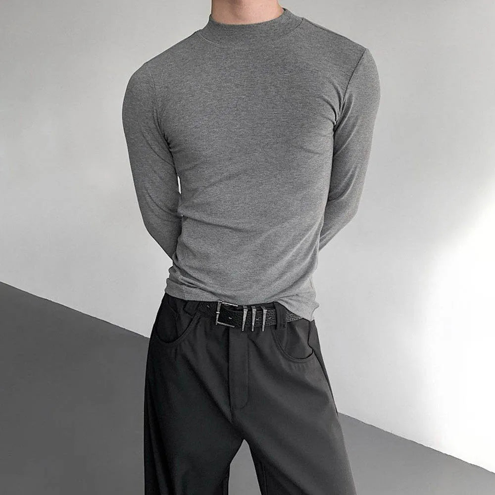 AIDASE - Men's Solid Color Half Turtleneck Long-Sleeved T-Shirt American Retro Fashion Trend High Street Slim Breathable Niche Men's Tops