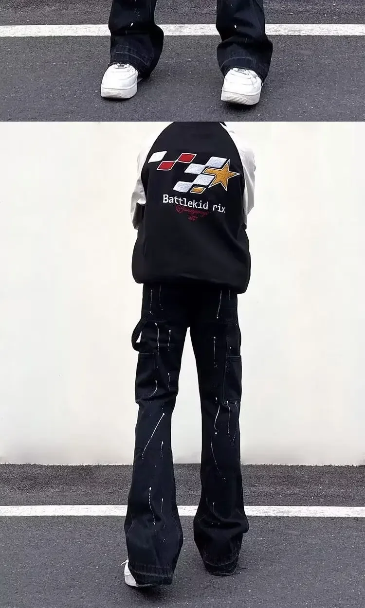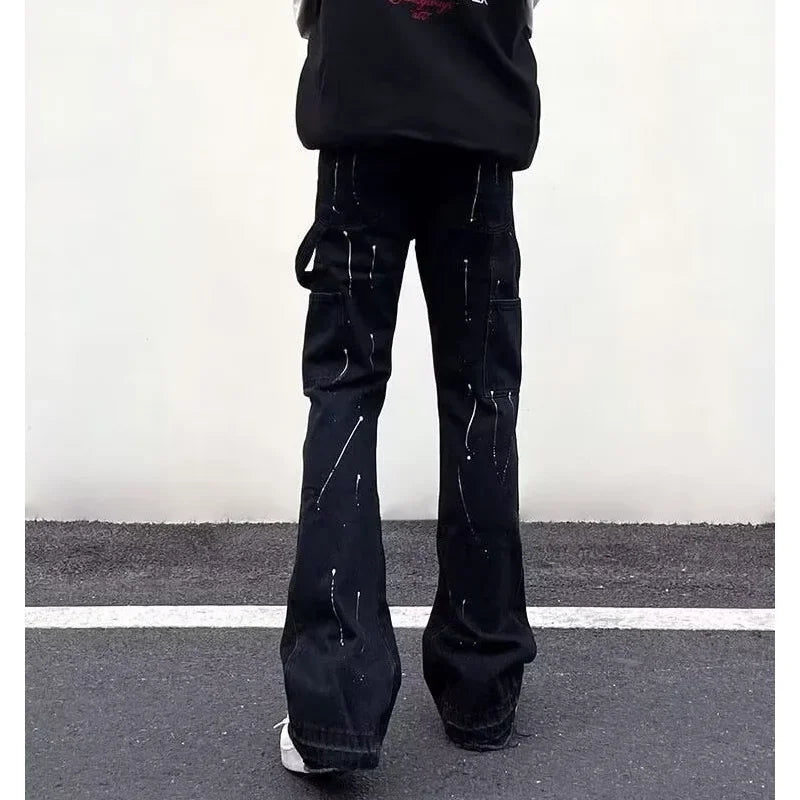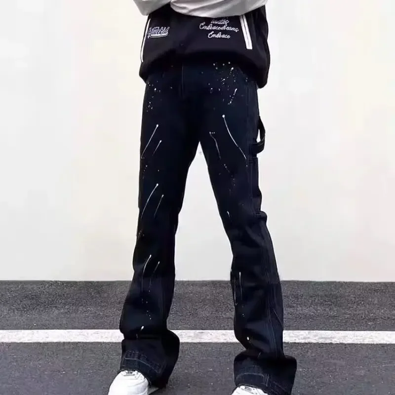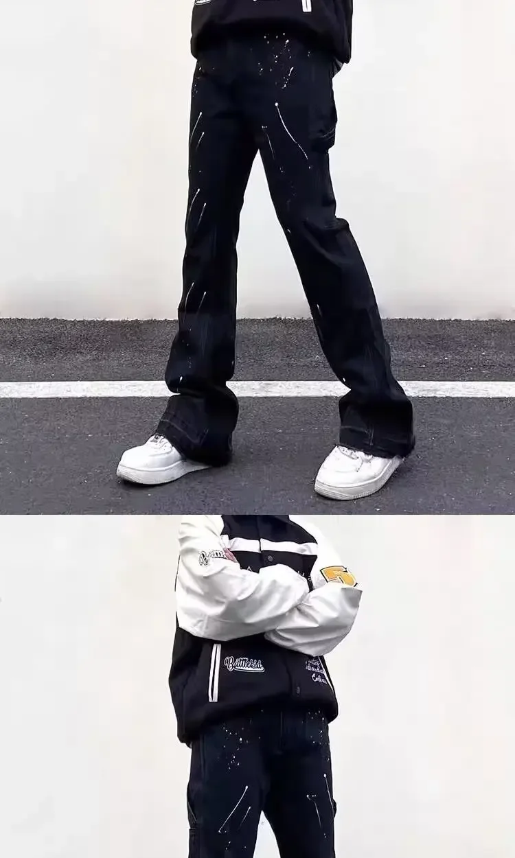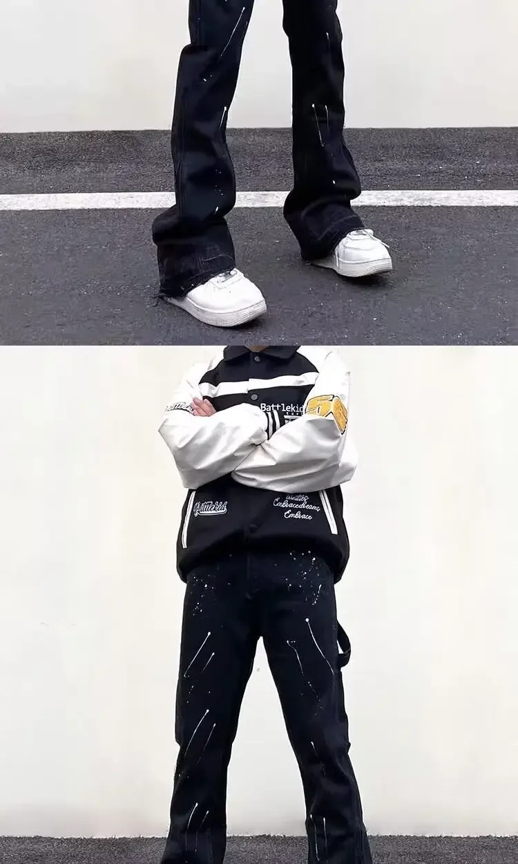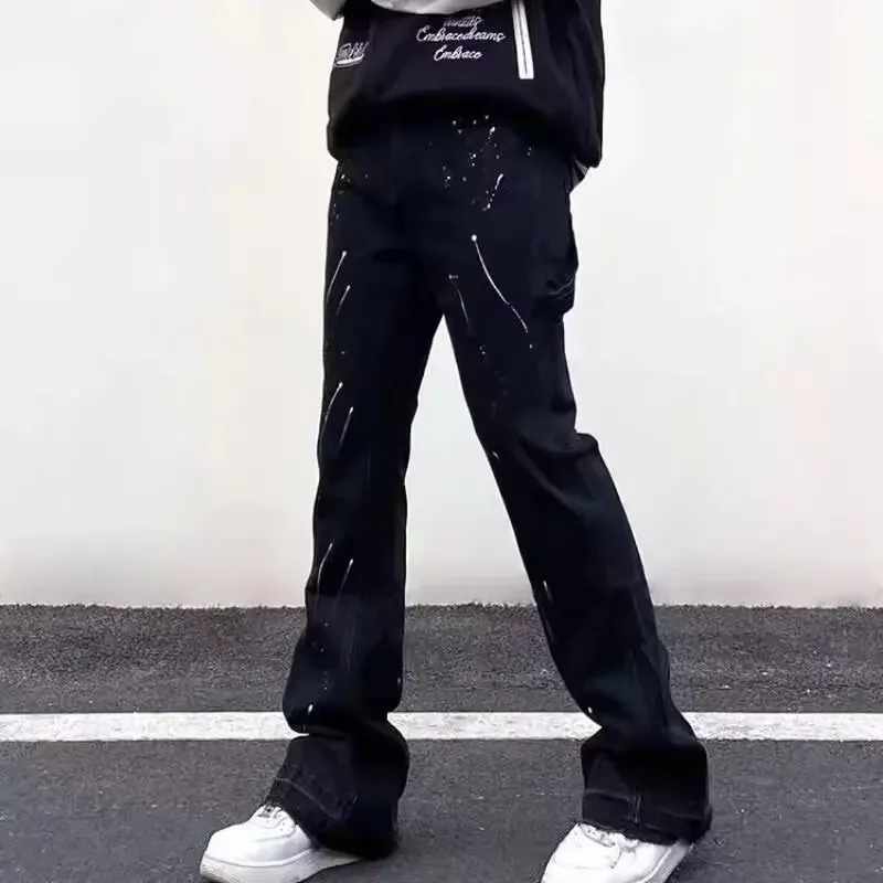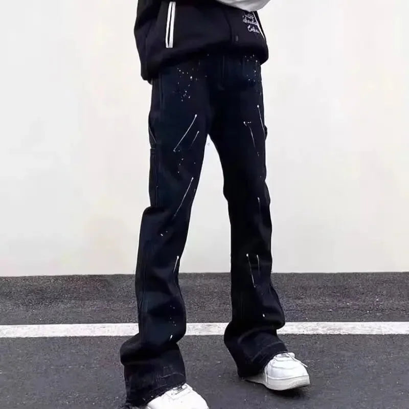 AIDASE - American High Street Splashed Denim Micro Flared Jeans Unisex Vintage Slimming Loose Straight Leg Casual Trousers