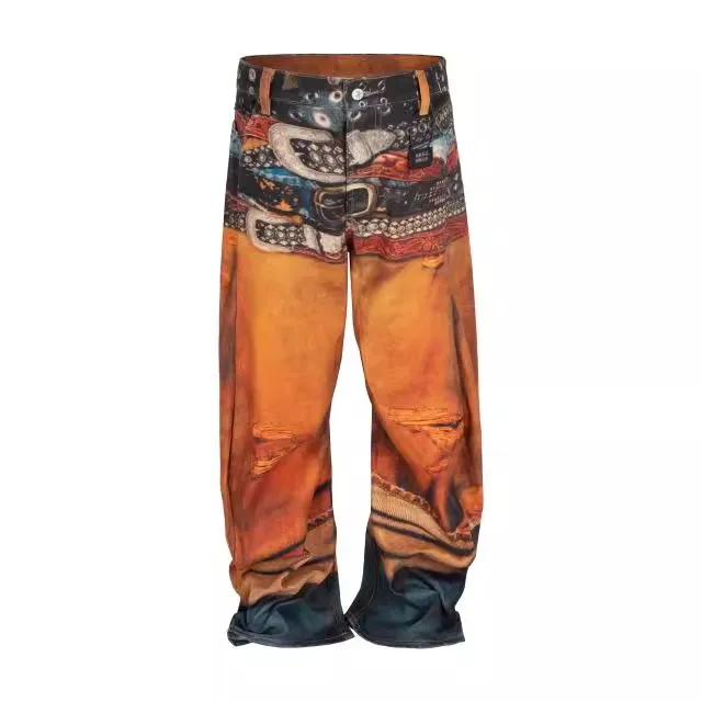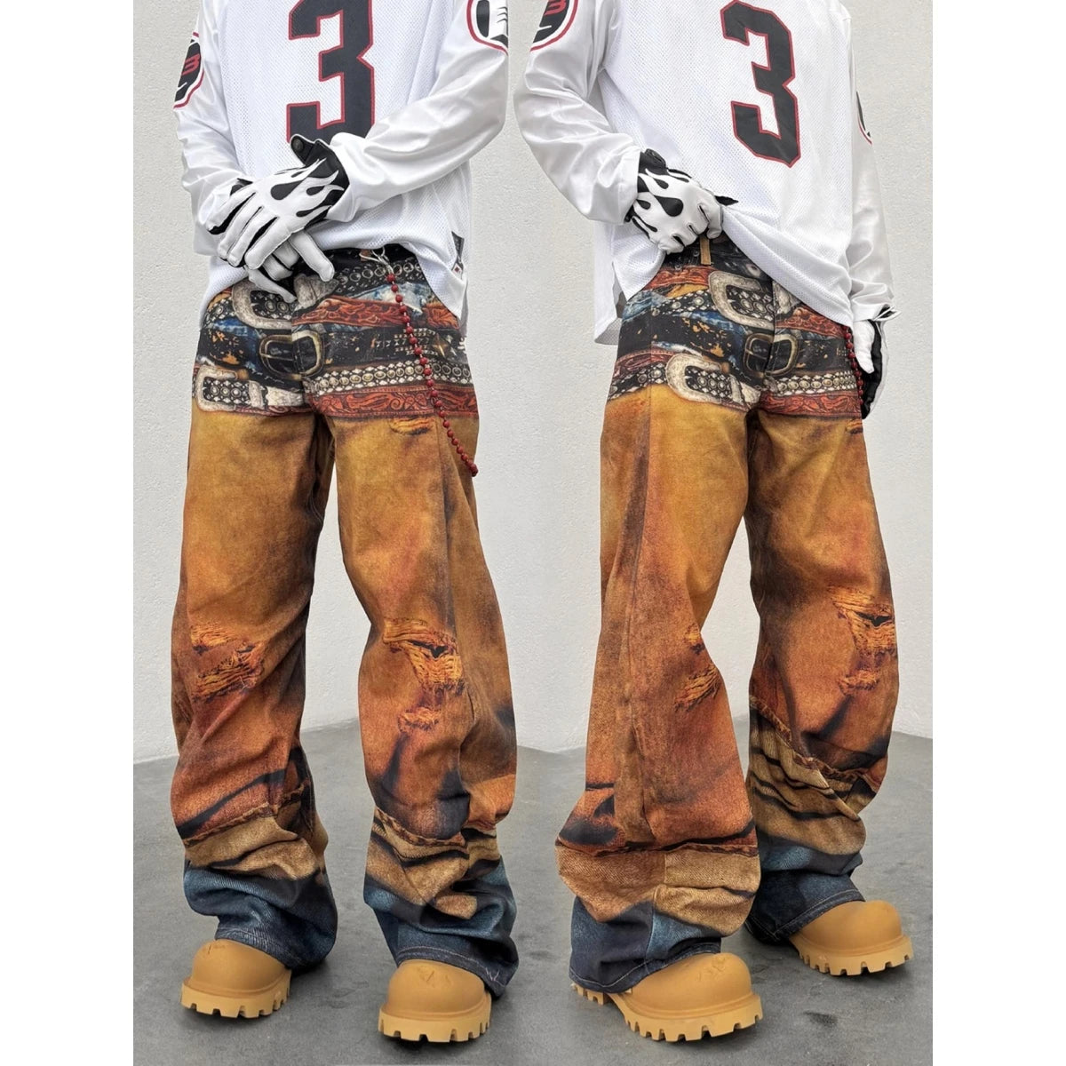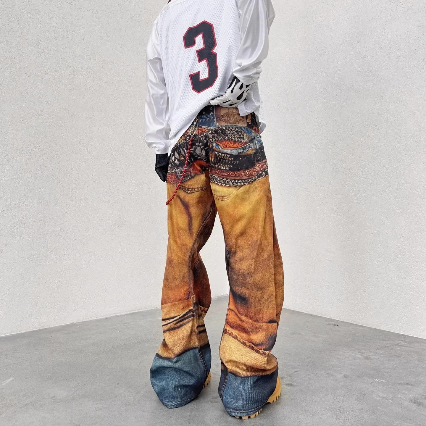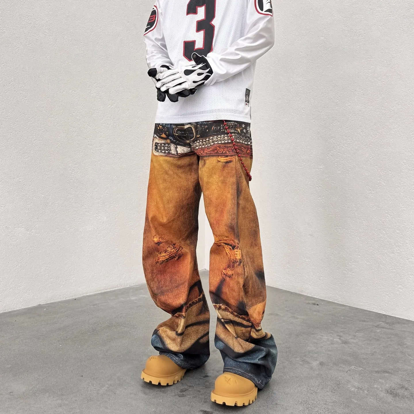 AIDASE - American High Street Trendy Brand 3D Digital Printing Multi-Waist Fake Hole Yellow Jeans Men Loose Straight Casual Pants