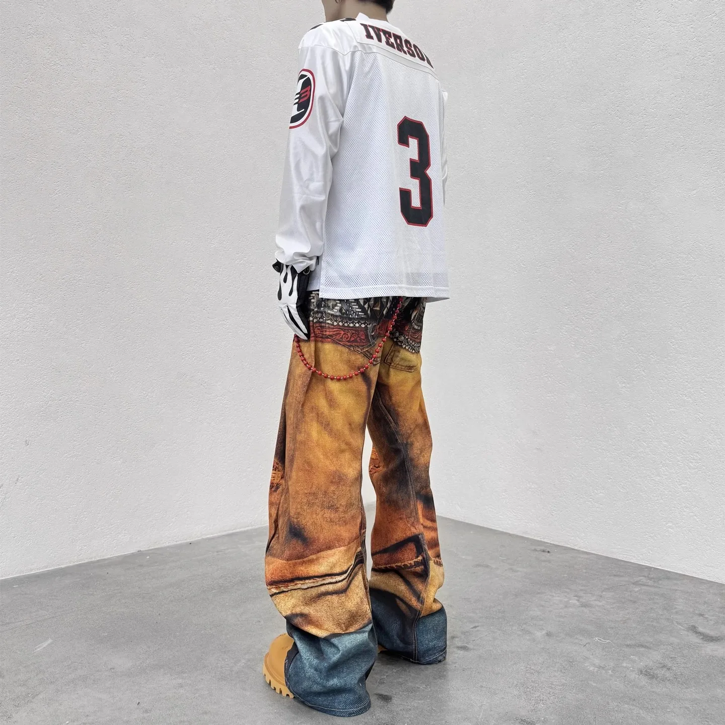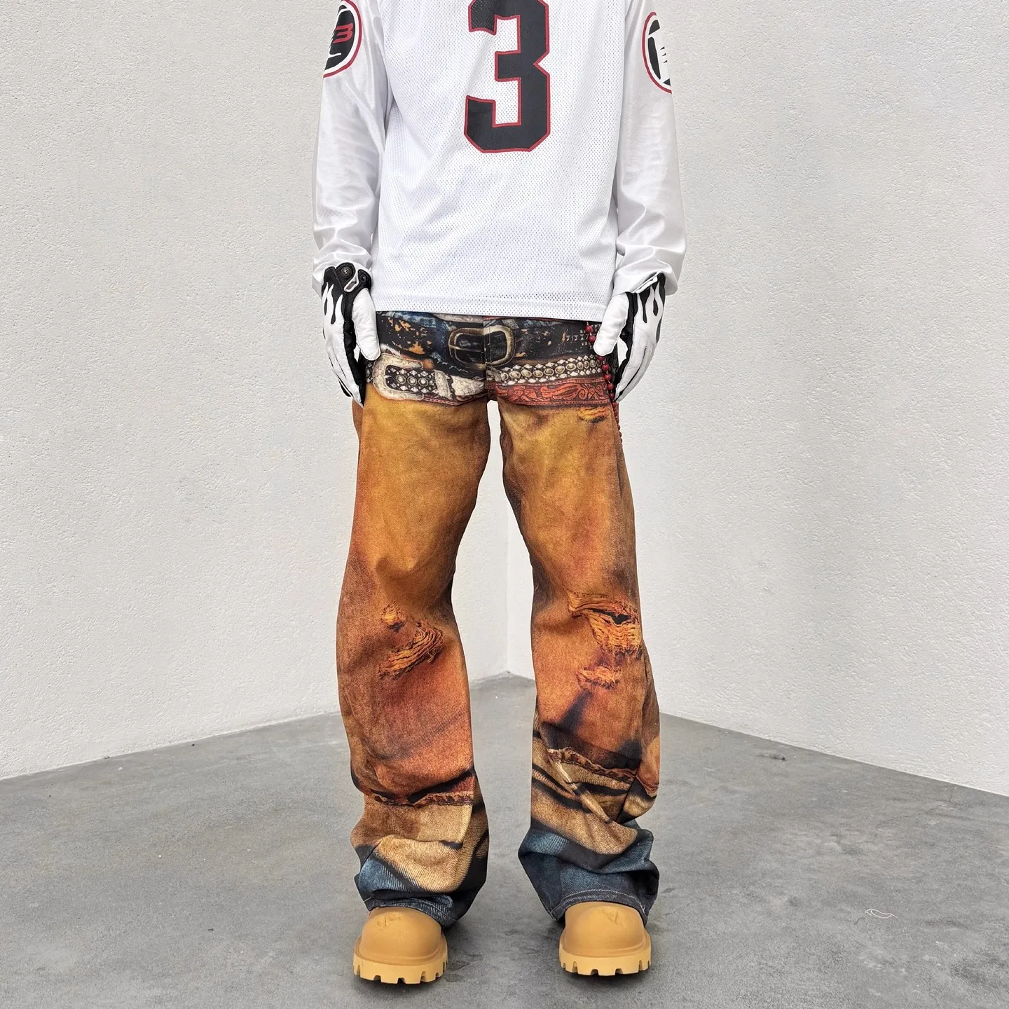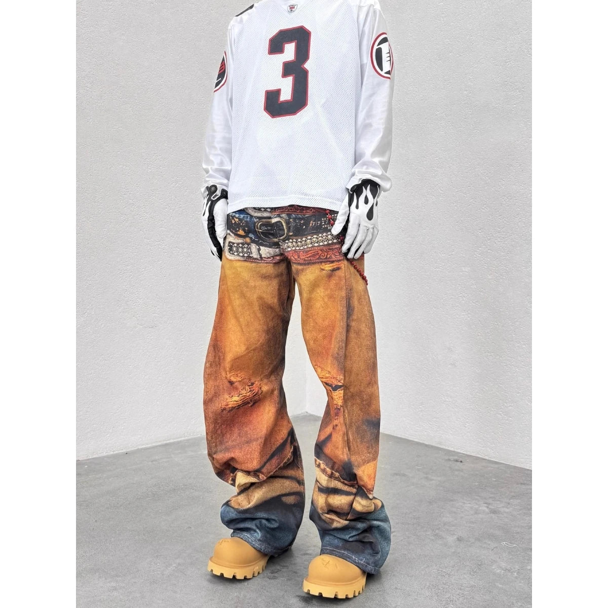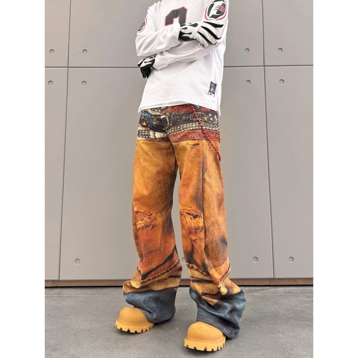AIDASE - American High Street Trendy Brand 3D Digital Printing Multi-Waist Fake Hole Yellow Jeans Men Loose Straight Casual Pants