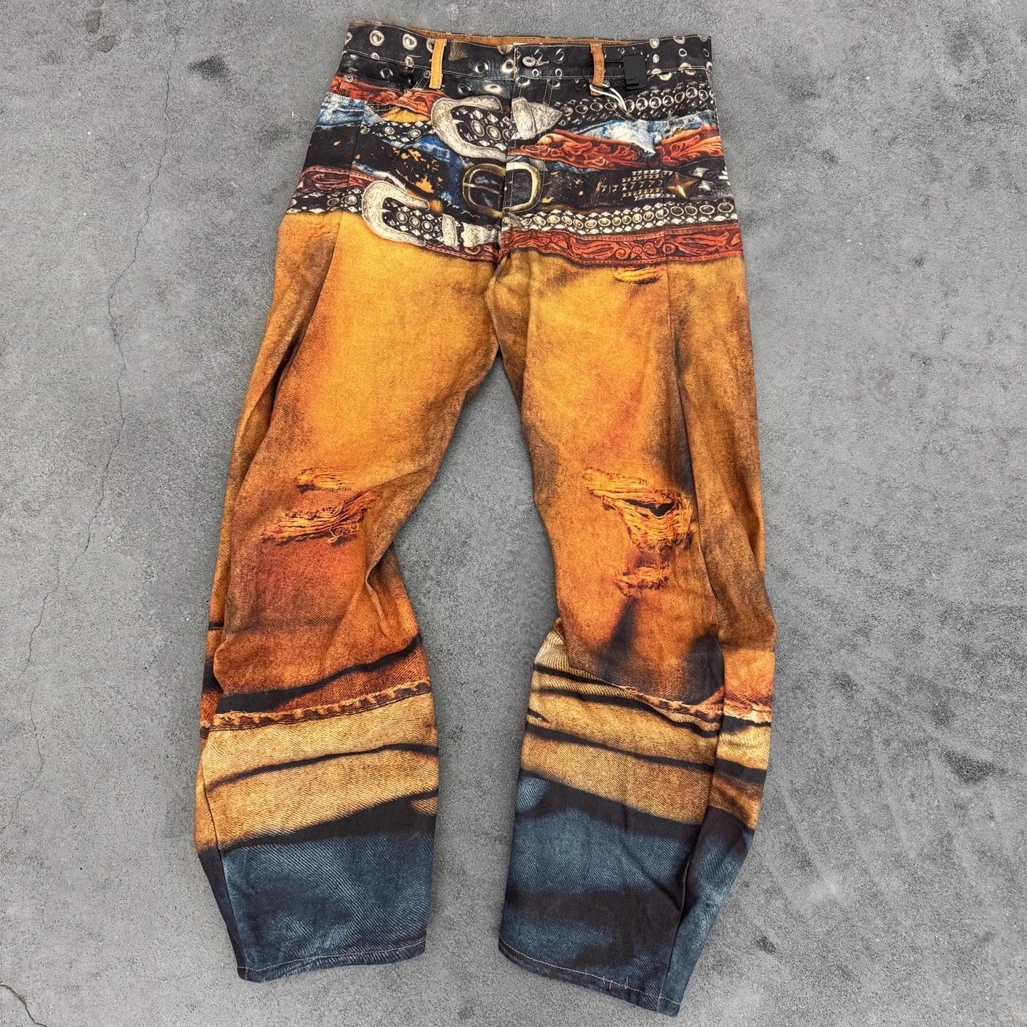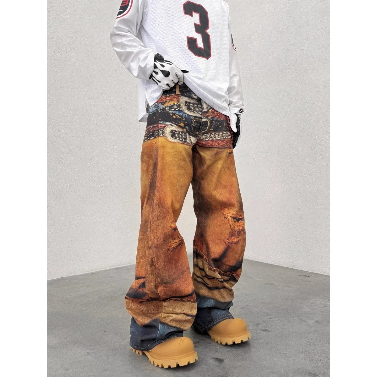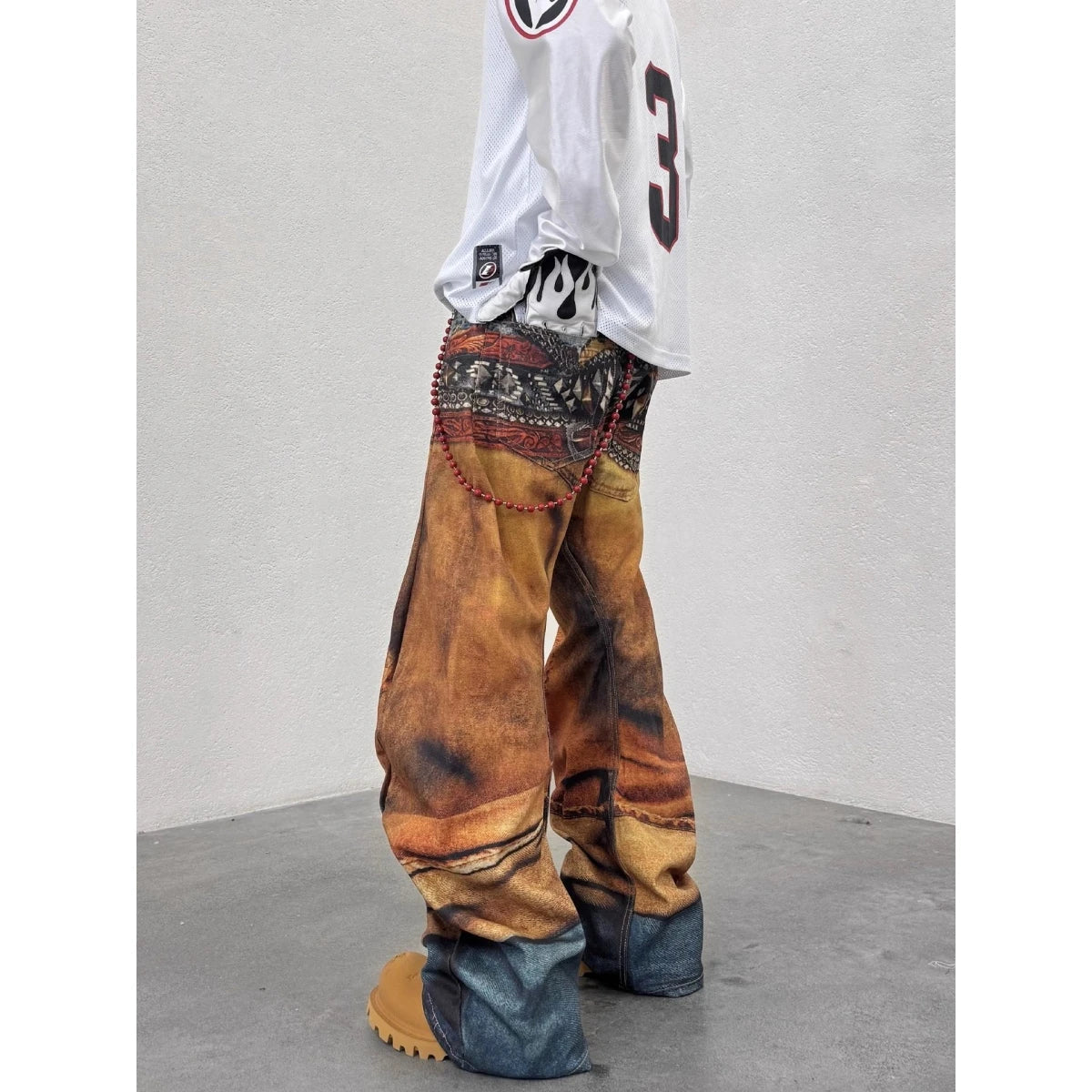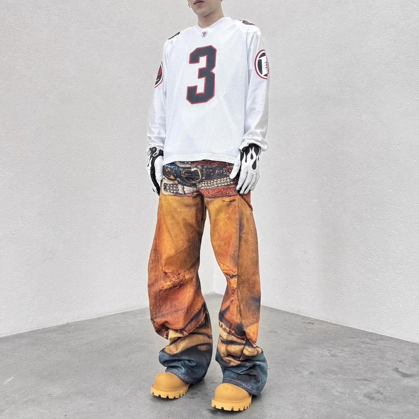 AIDASE - American High Street Trendy Brand 3D Digital Printing Multi-Waist Fake Hole Yellow Jeans Men Loose Straight Casual Pants