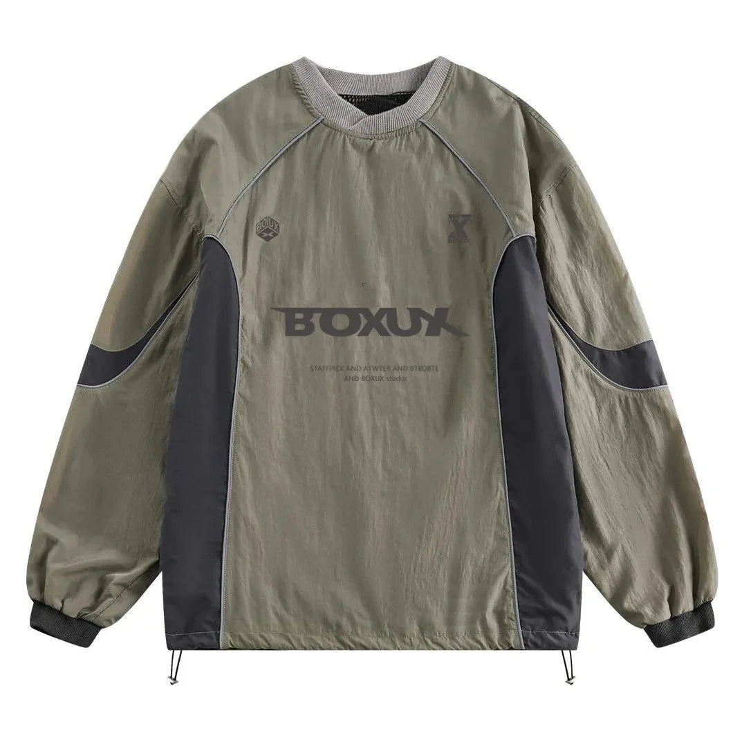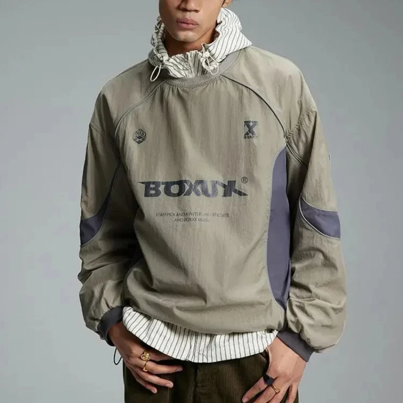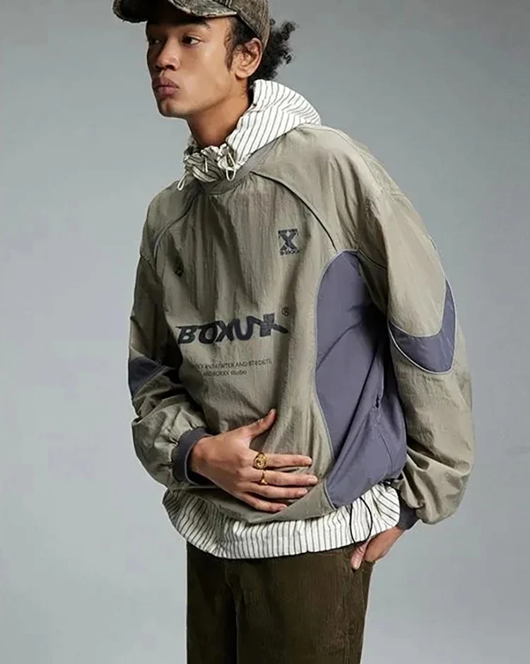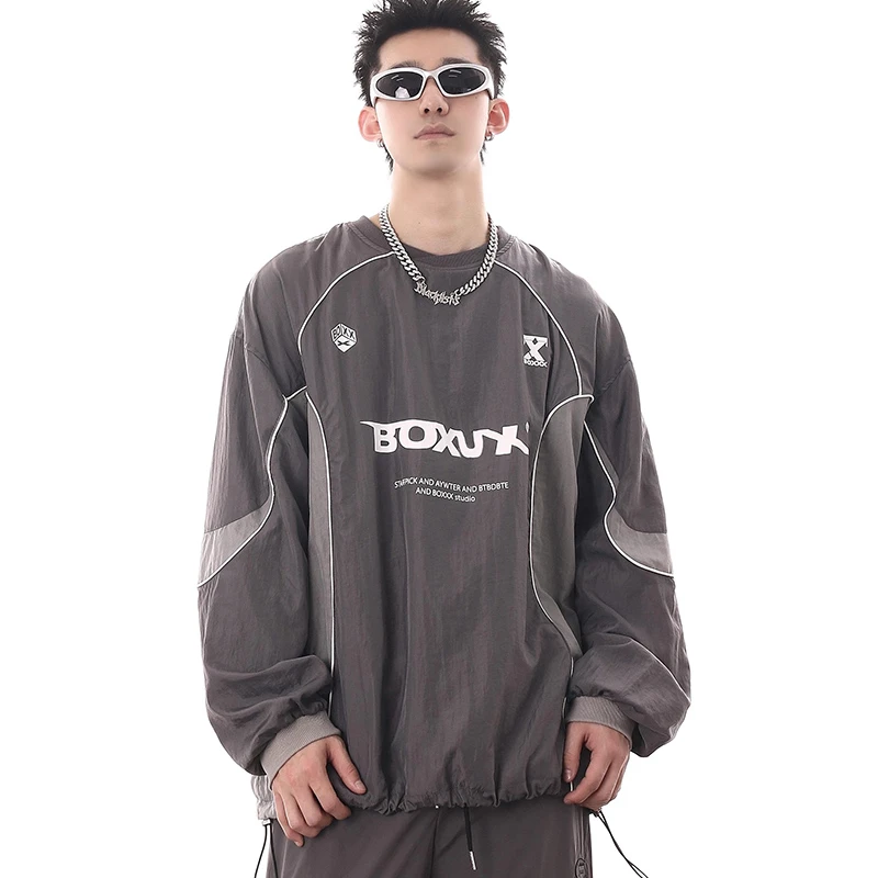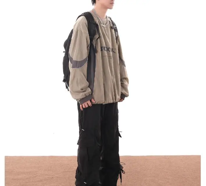 American Men Women Sweatshirt Drawstring Spring High Street Functional Punk Color Block Letter Print Loose O-Neck Tops Hip Hop