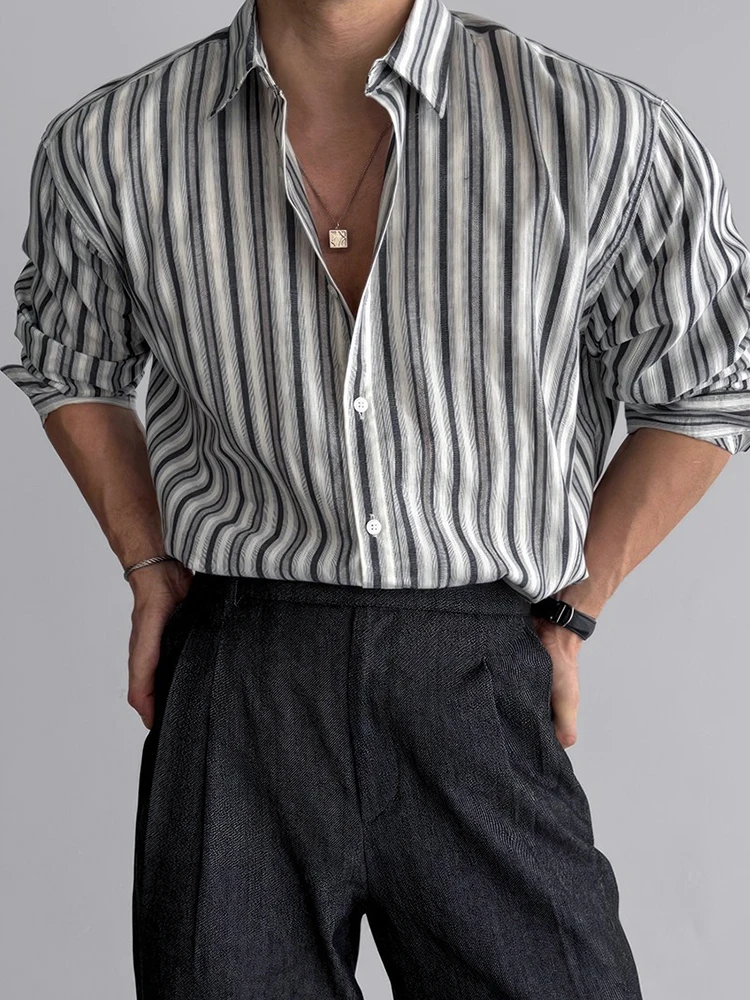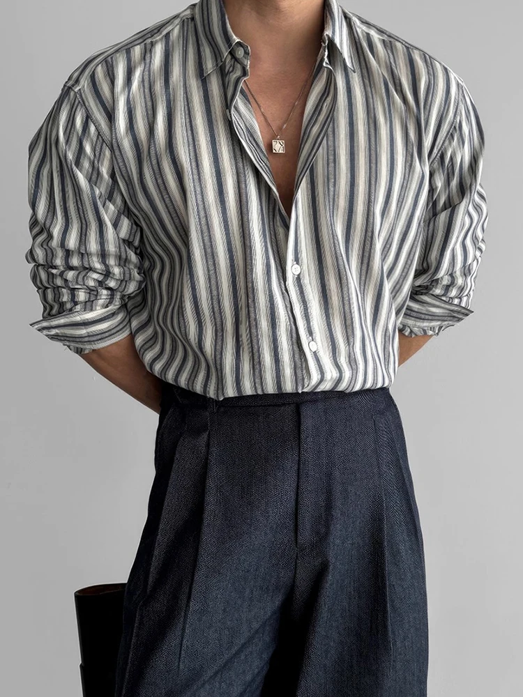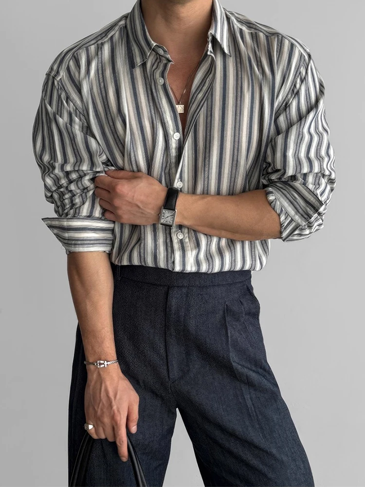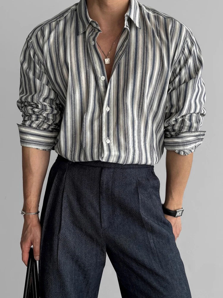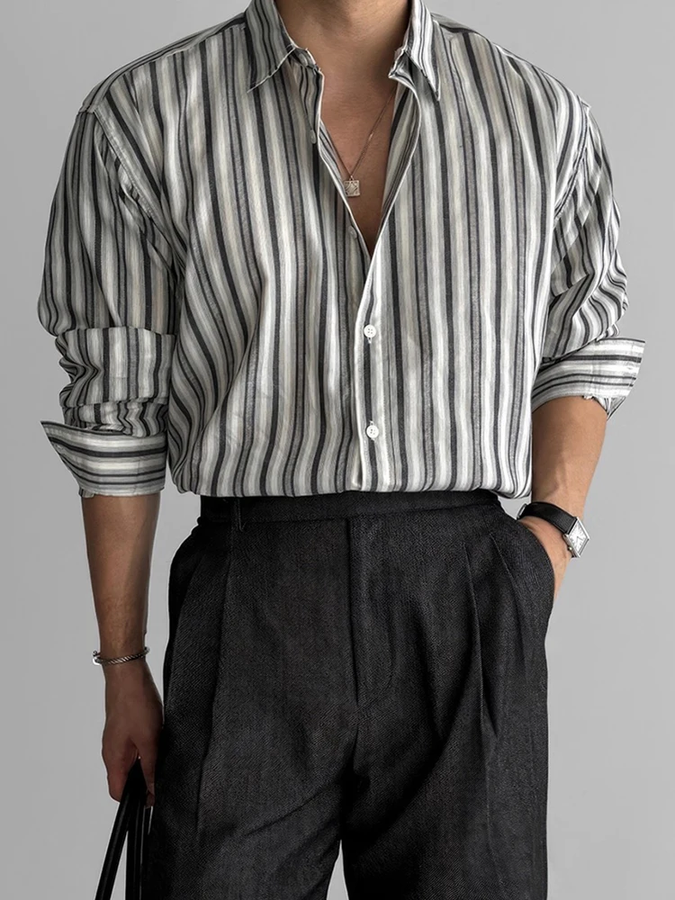 AIDASE - Autumn Vintage Button-up Turn-down Collar Shirt For Men Outdoor Fashion Loose Cardigans Casual Long Sleeve Mens Striped Shirts
