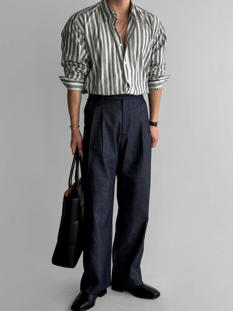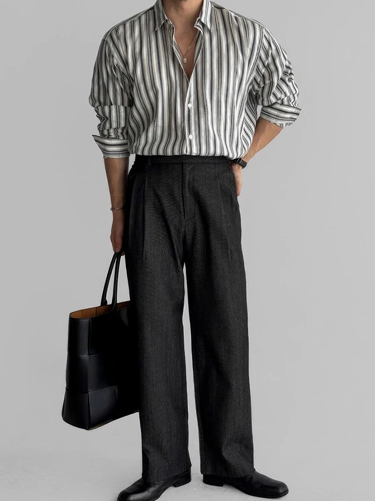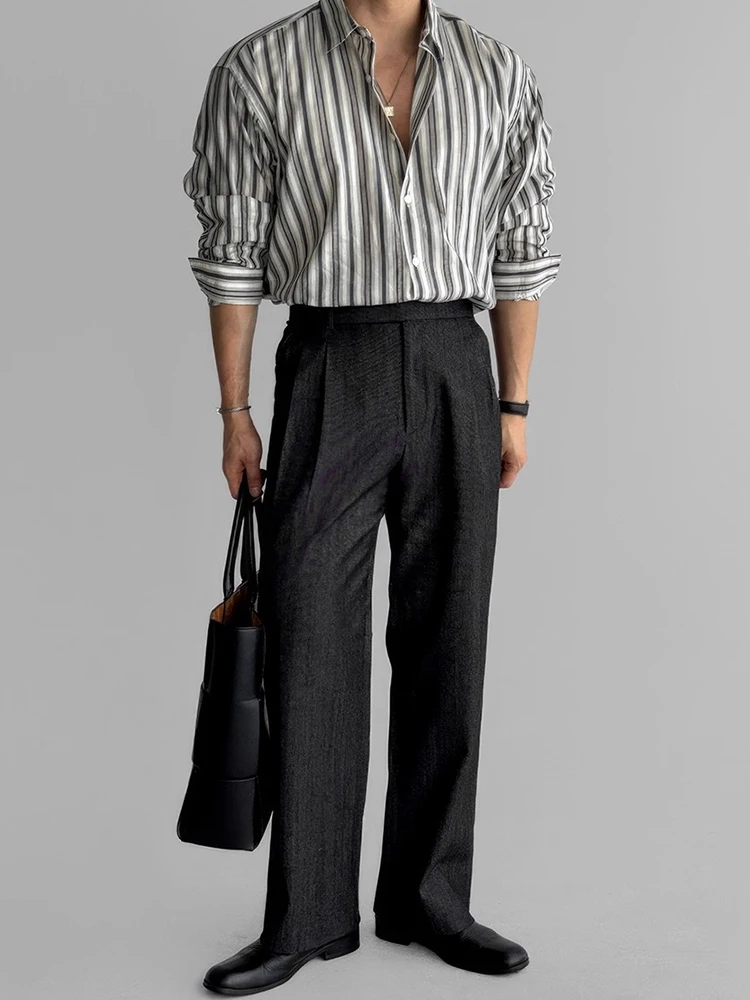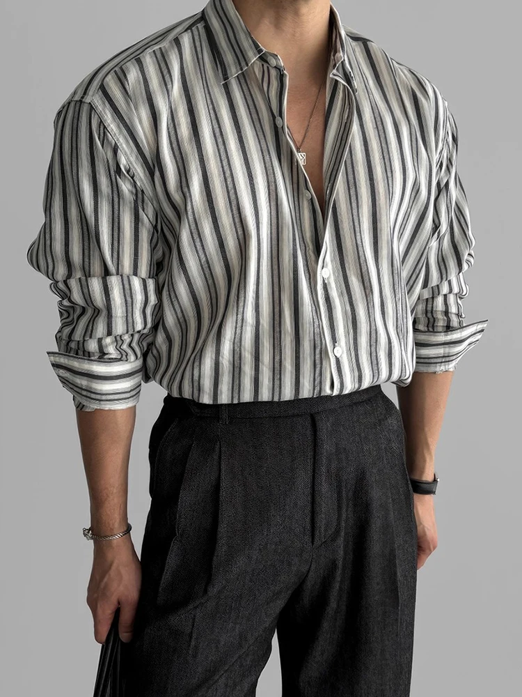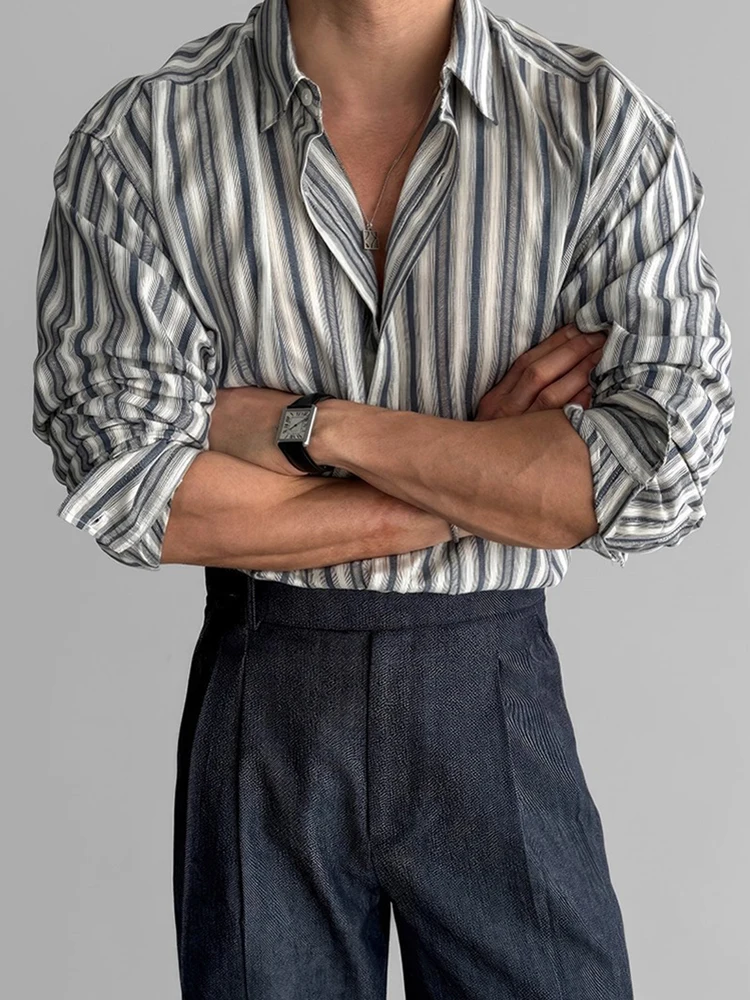 AIDASE - Autumn Vintage Button-up Turn-down Collar Shirt For Men Outdoor Fashion Loose Cardigans Casual Long Sleeve Mens Striped Shirts