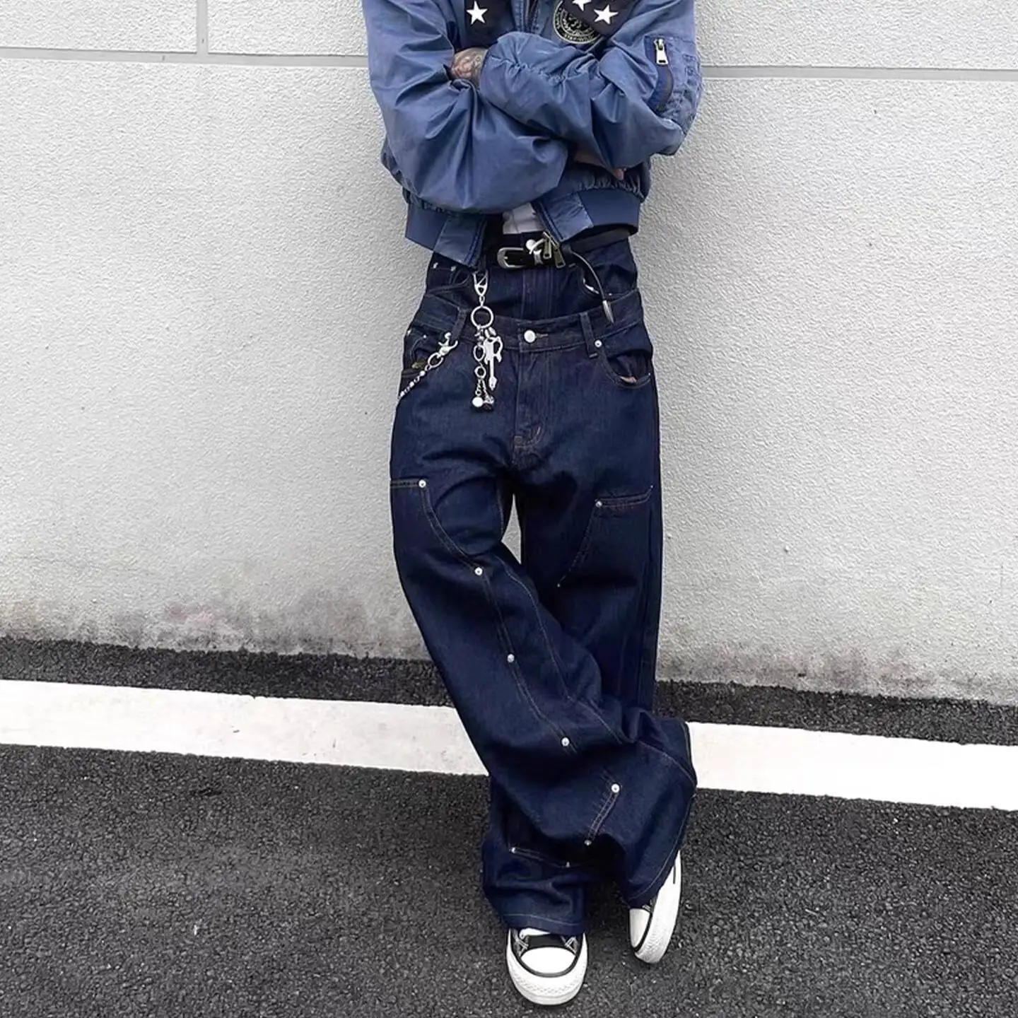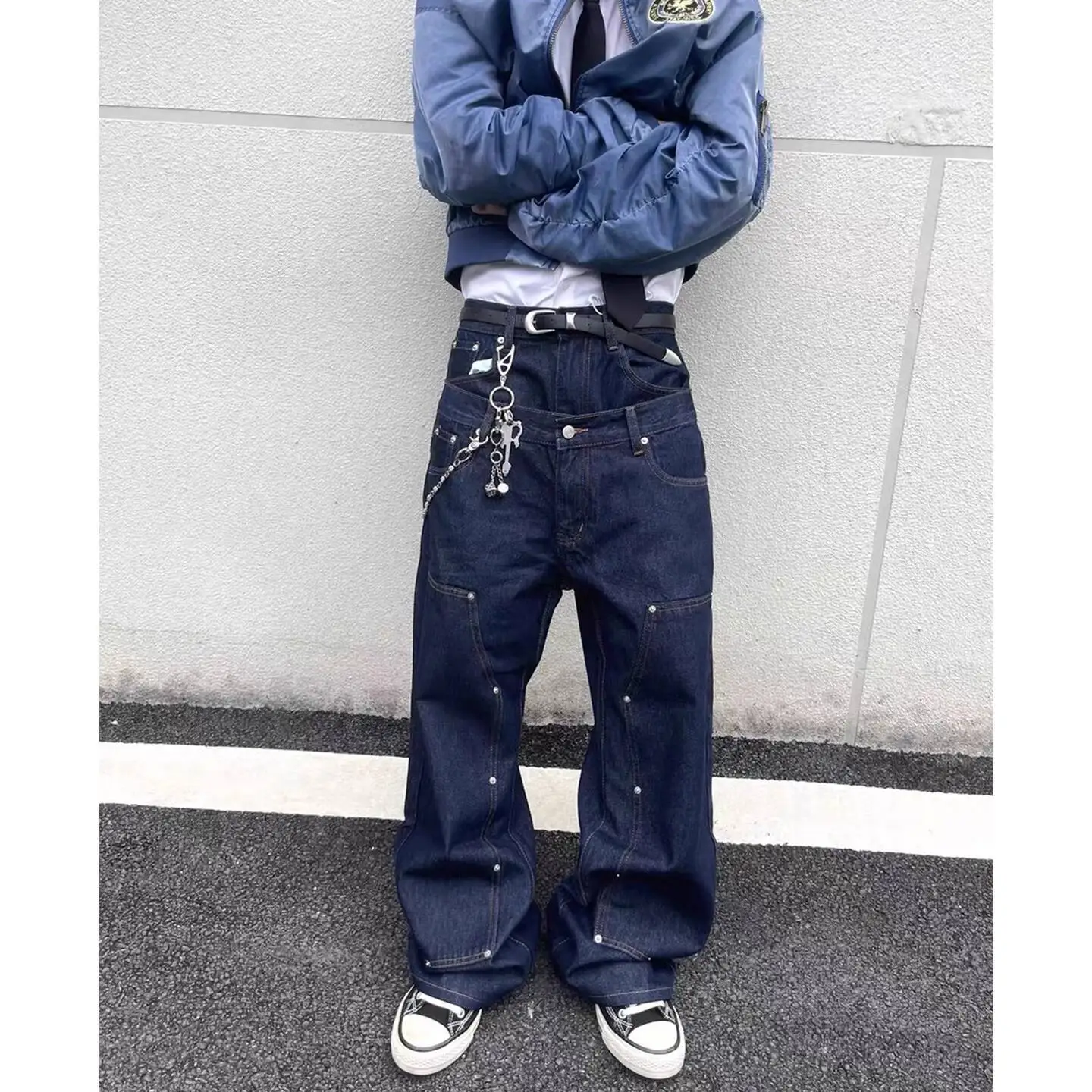 AIDASE - High Street Men's Jeans Washing Solid Color Metal Rivets Double Waistband Wide Leg Straight Loose Male Denim Pants 24K5919
