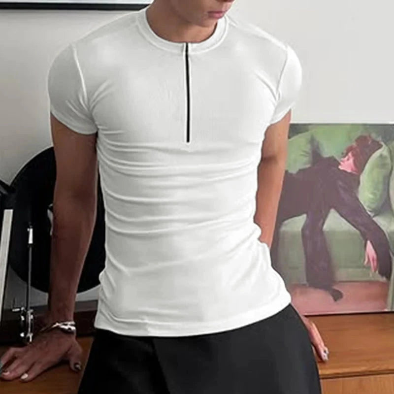 AIDASE - Men T Shirt Knitted Solid Color Zipper O-neck Short Sleeve Male Tee Tops Streetwear 2025 Fashion Casual Men Clothing