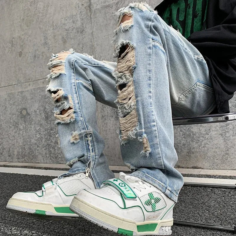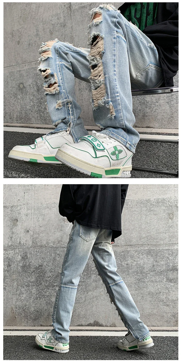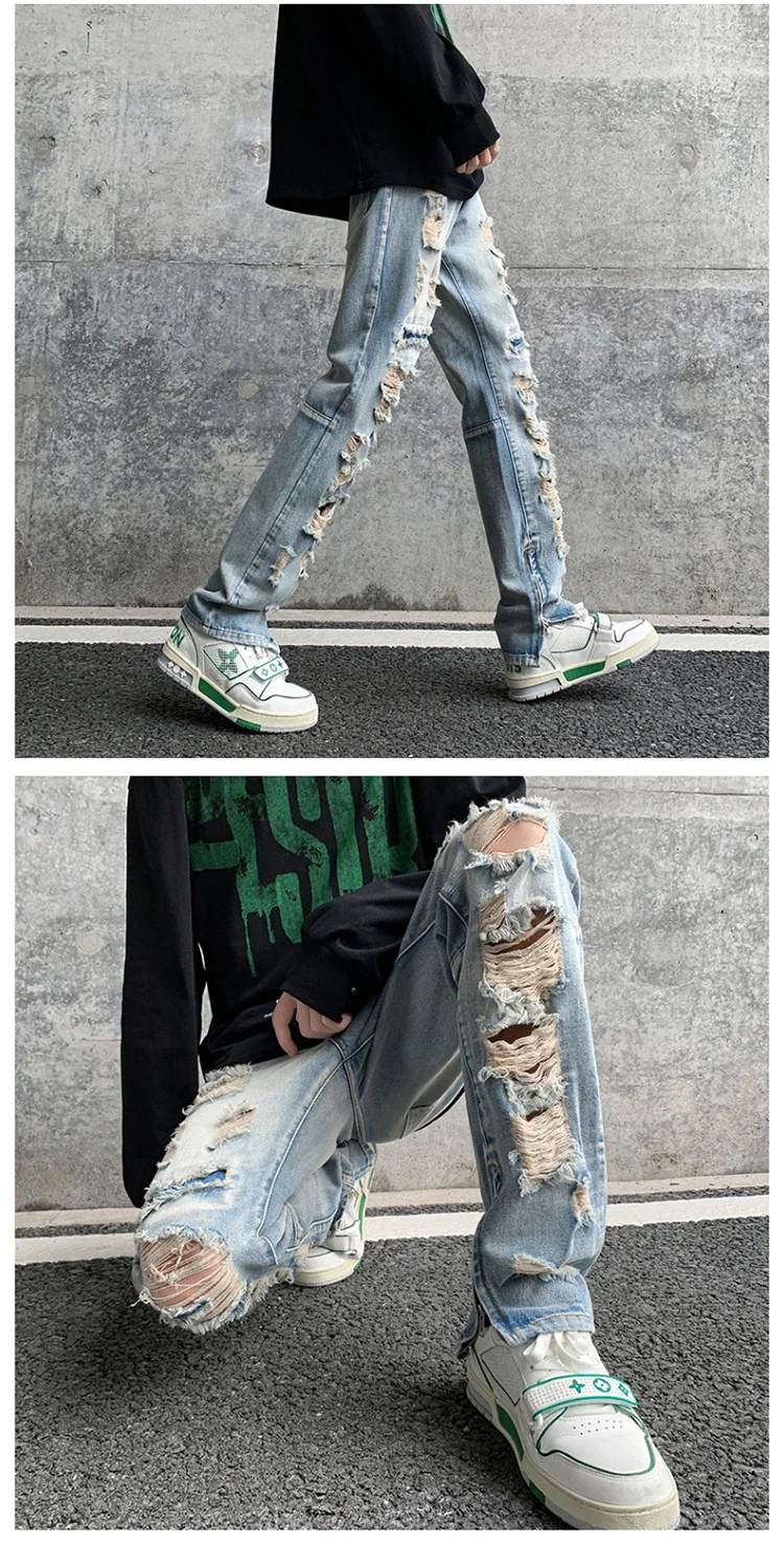 AIDASE - Men's Casual High Street Style Denim Jeans Spring Autumn New Straight Leg Zipper Washed Ripped Long Trousers
