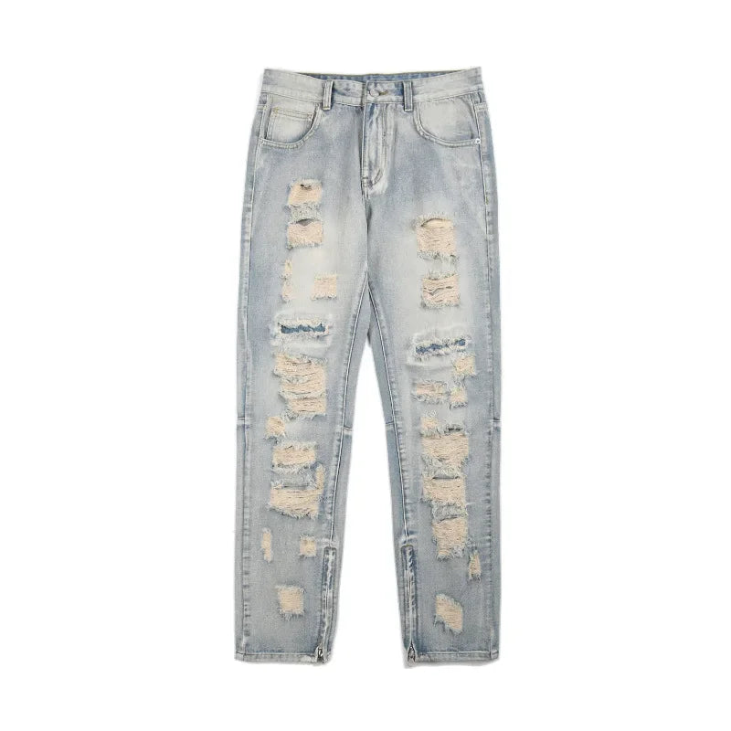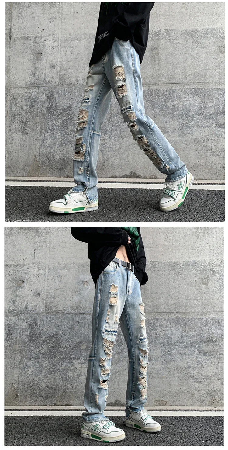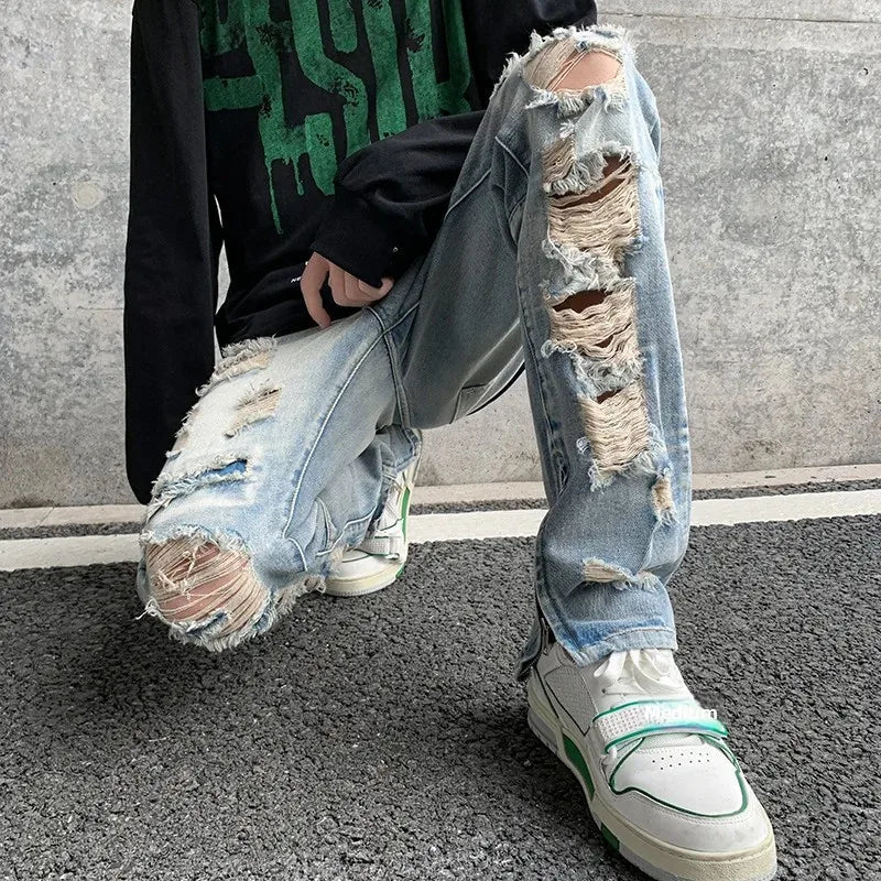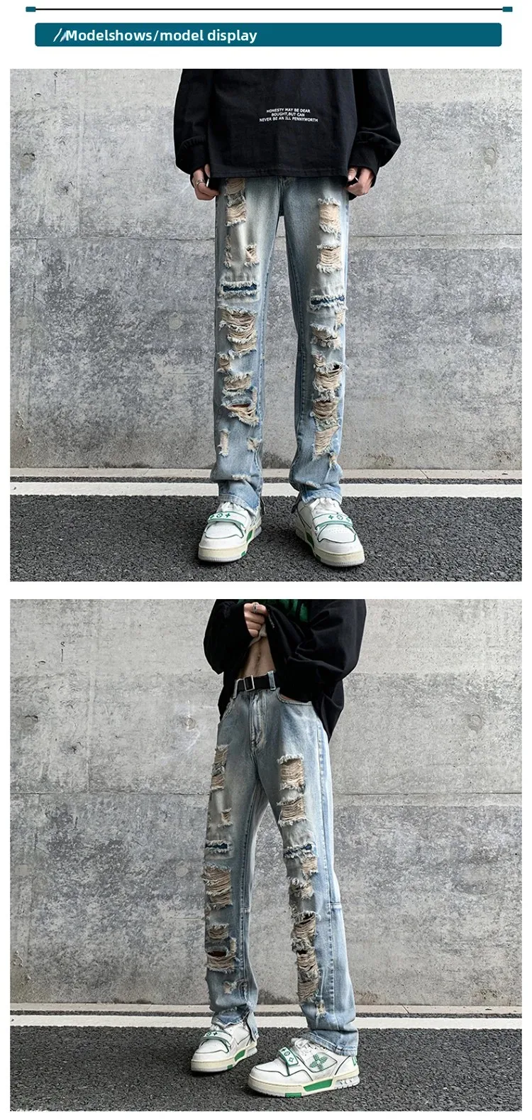 AIDASE - Men's Casual High Street Style Denim Jeans Spring Autumn New Straight Leg Zipper Washed Ripped Long Trousers