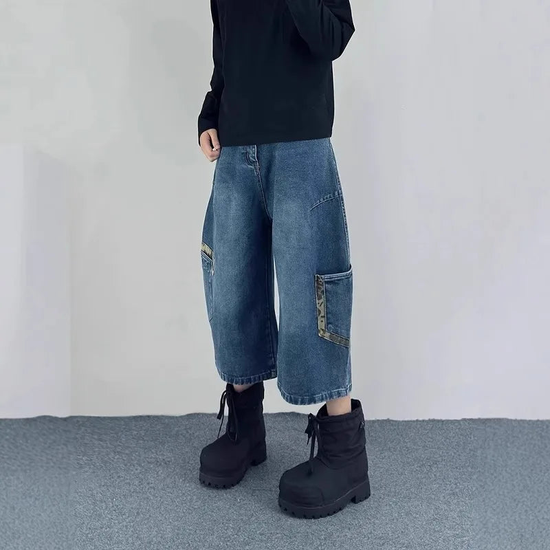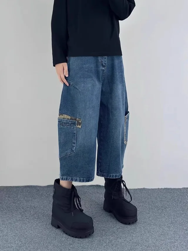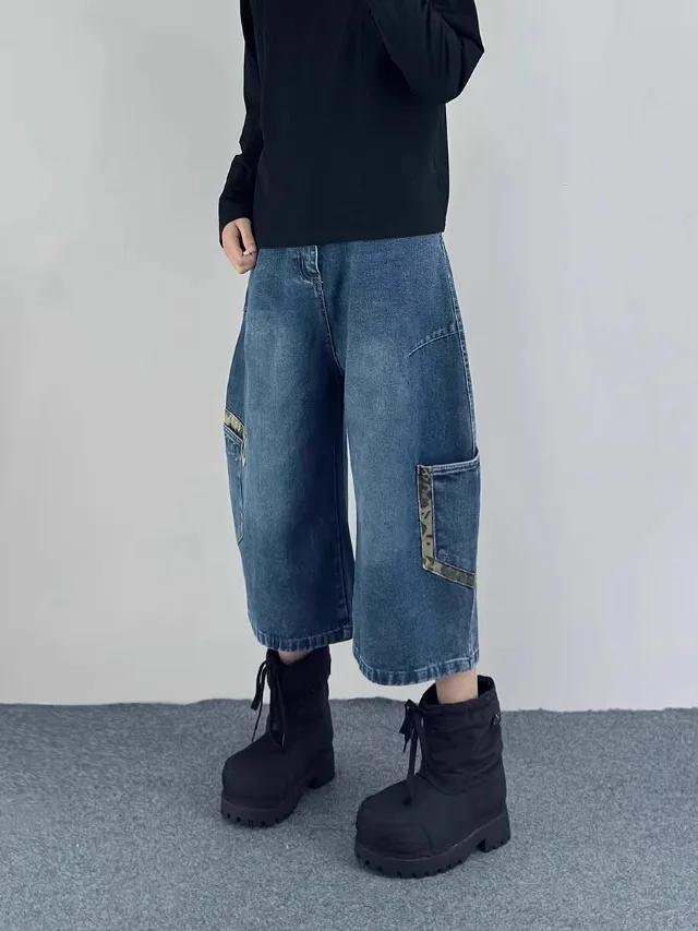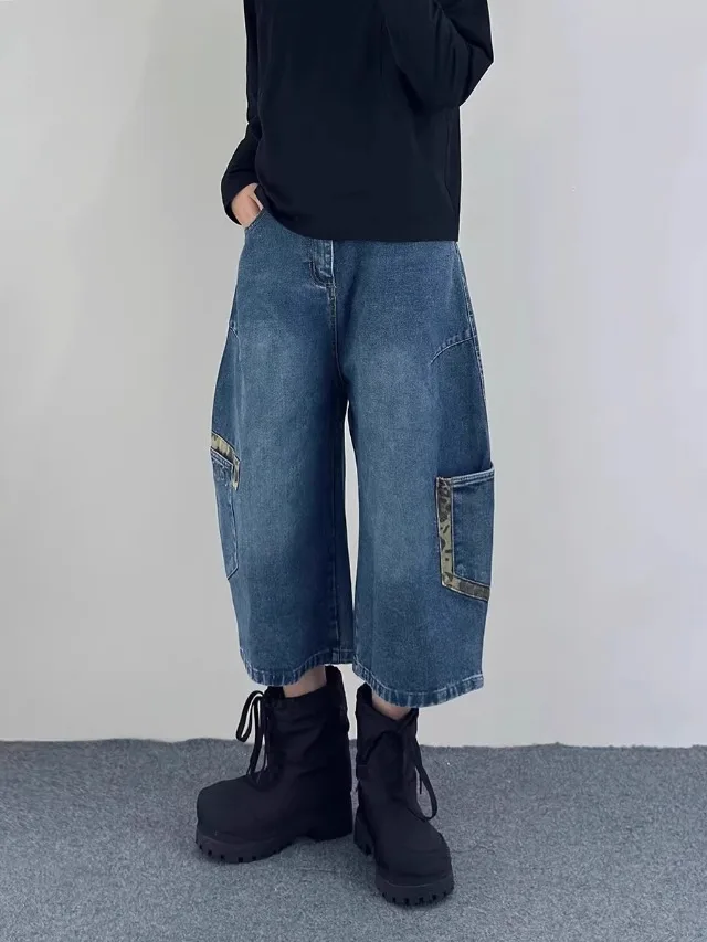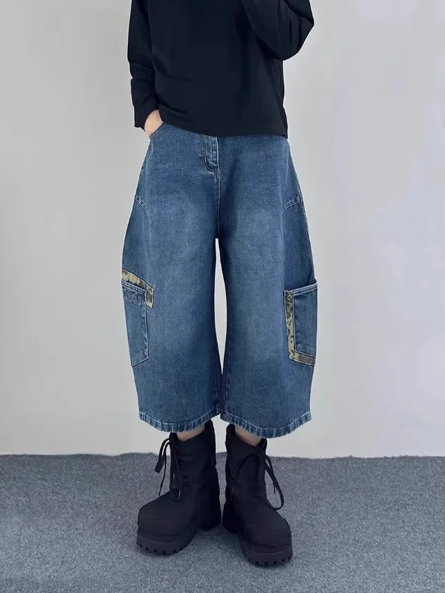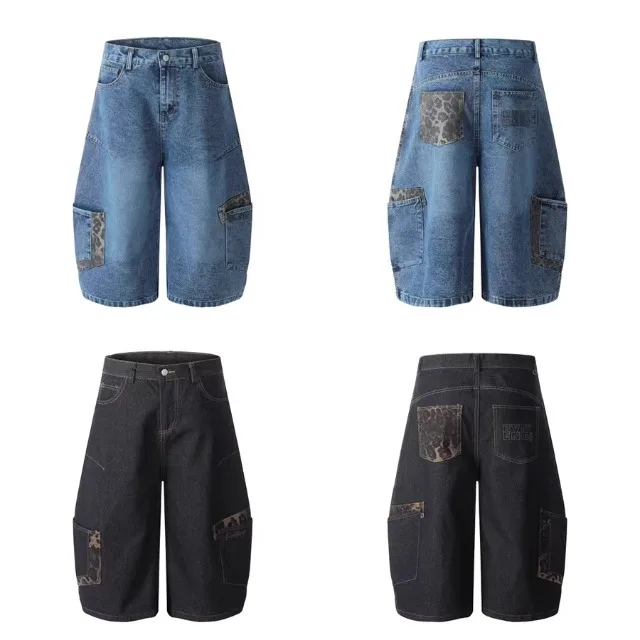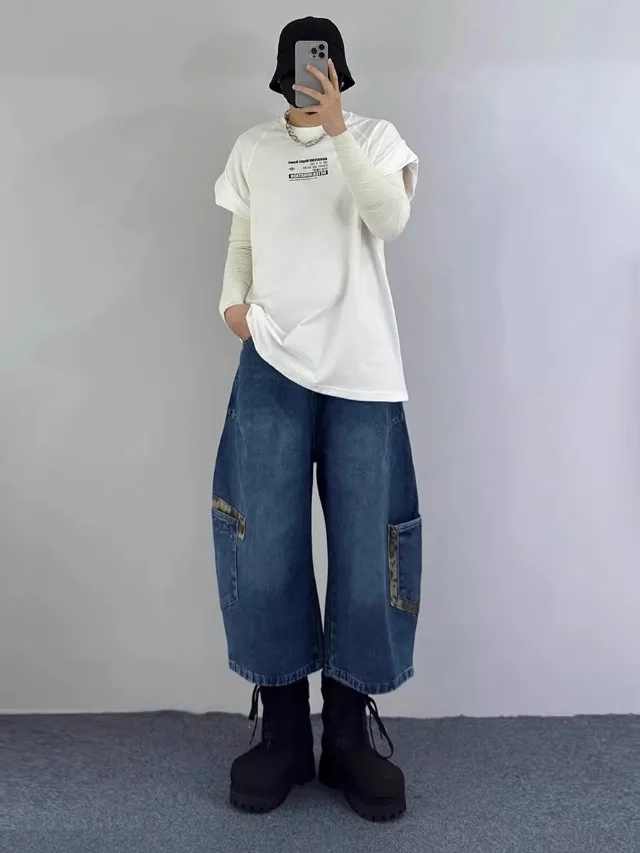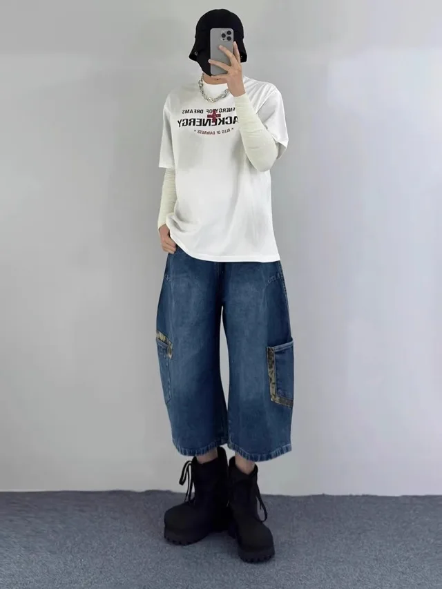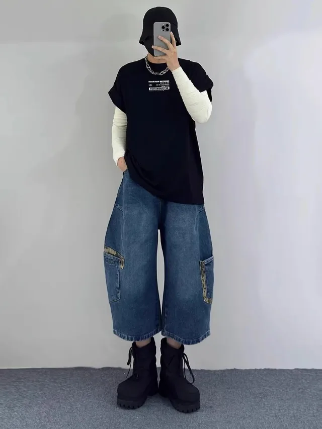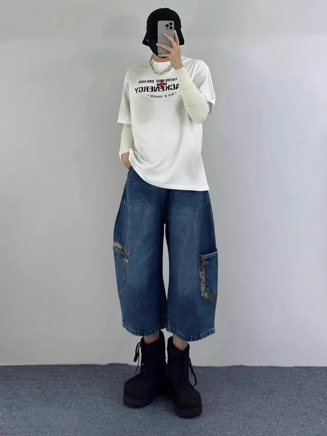 AIDASE - Retro Patchwork Wide Leg Jeans orts Men Women Summer New Sle Couple Workwear Denim Seven-Foot Pants Casual Straight Leg Pant