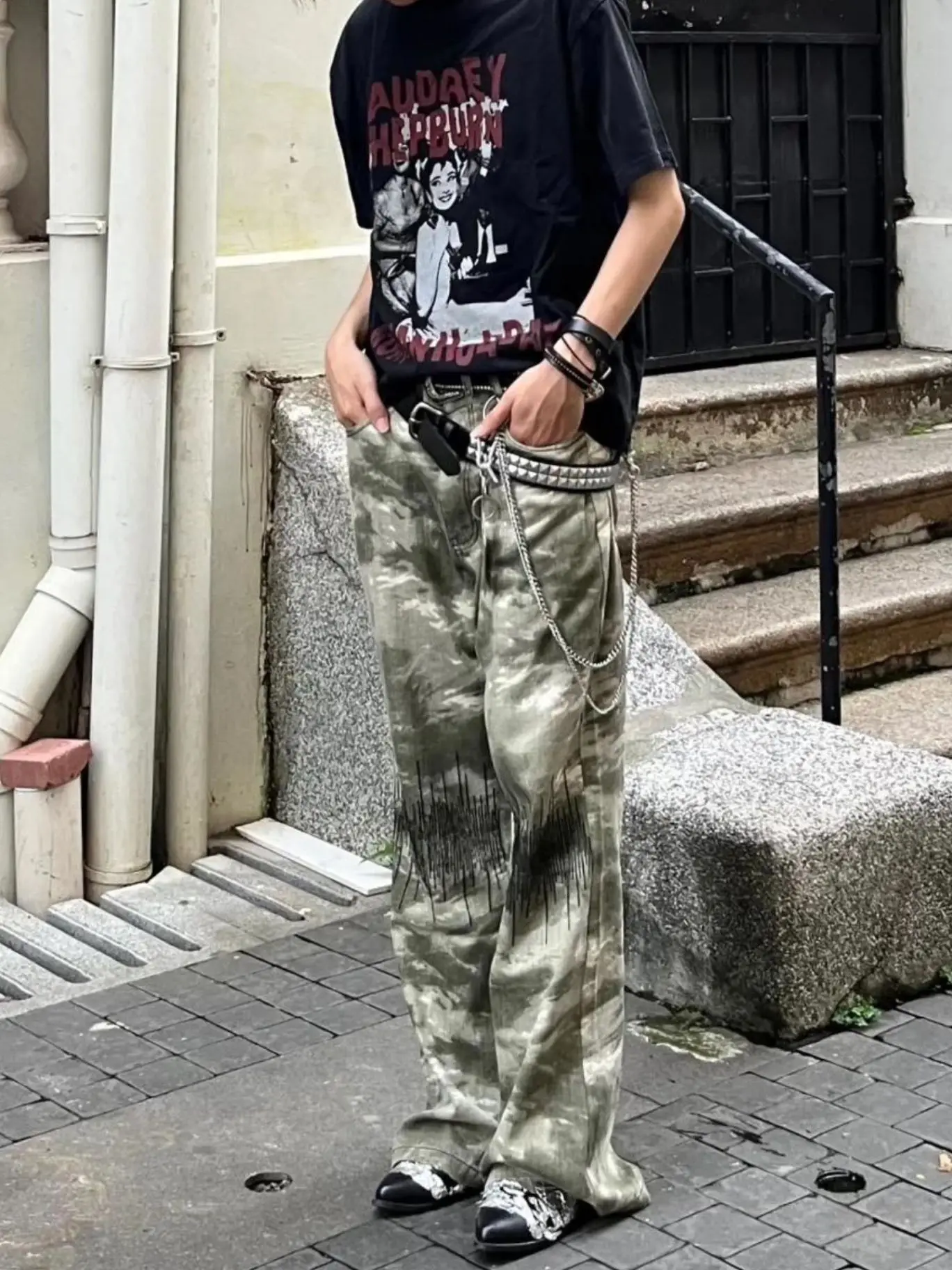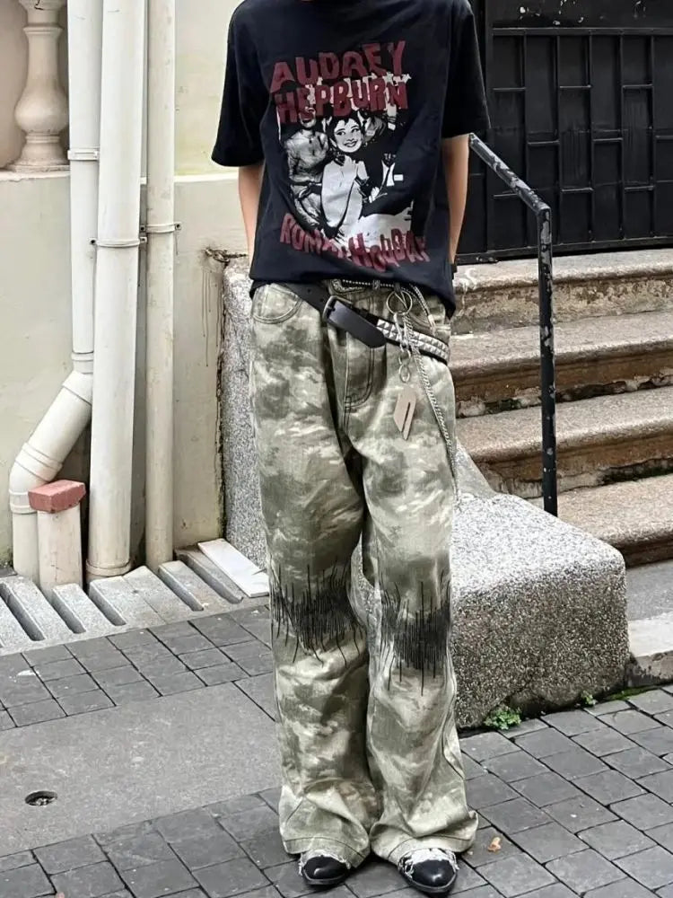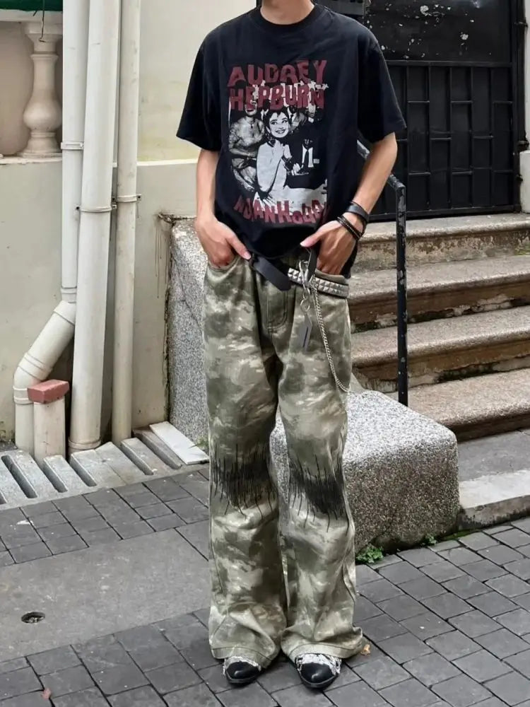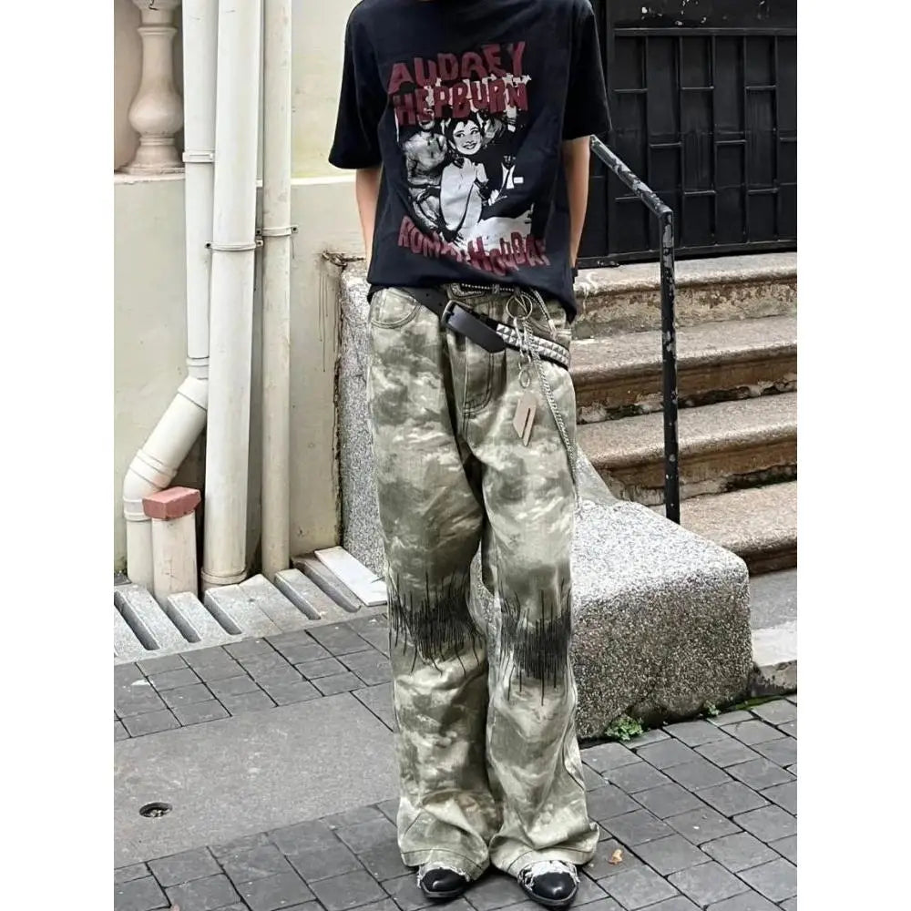 AIDASE - Retro Street Sle Camouflage American Micro Flared Jeans Men Straight Loose Casual Pants Embroidered Wide Leg Commute