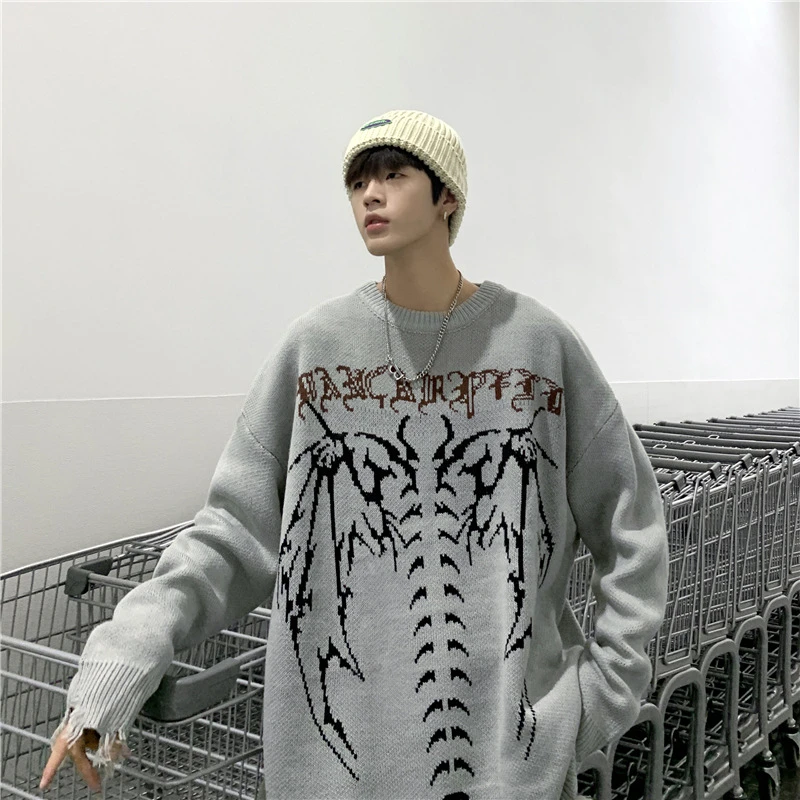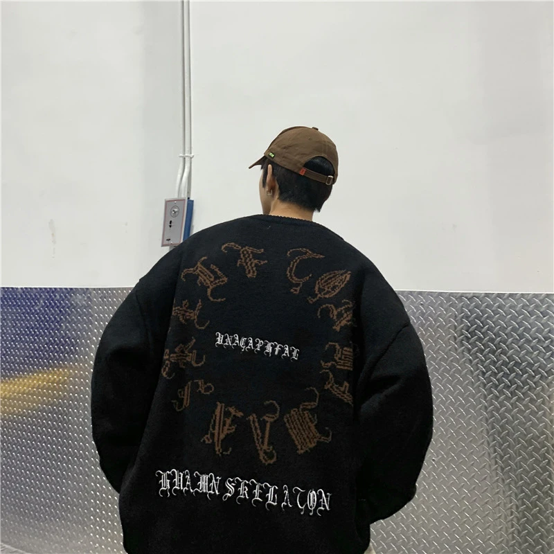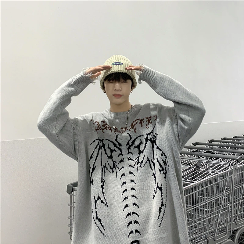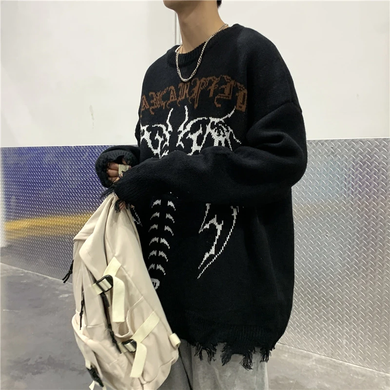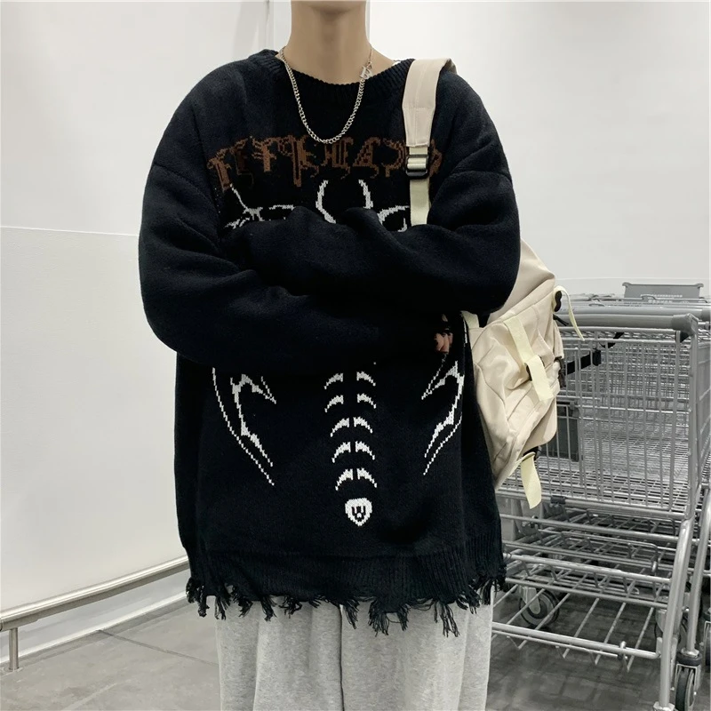 Aidase Skeleton Jacquard Sweater Mens High Street Autumn Knitted Sweater Raw Hem Ripped Loose Crew Neck Long Sleeve Pullover Men