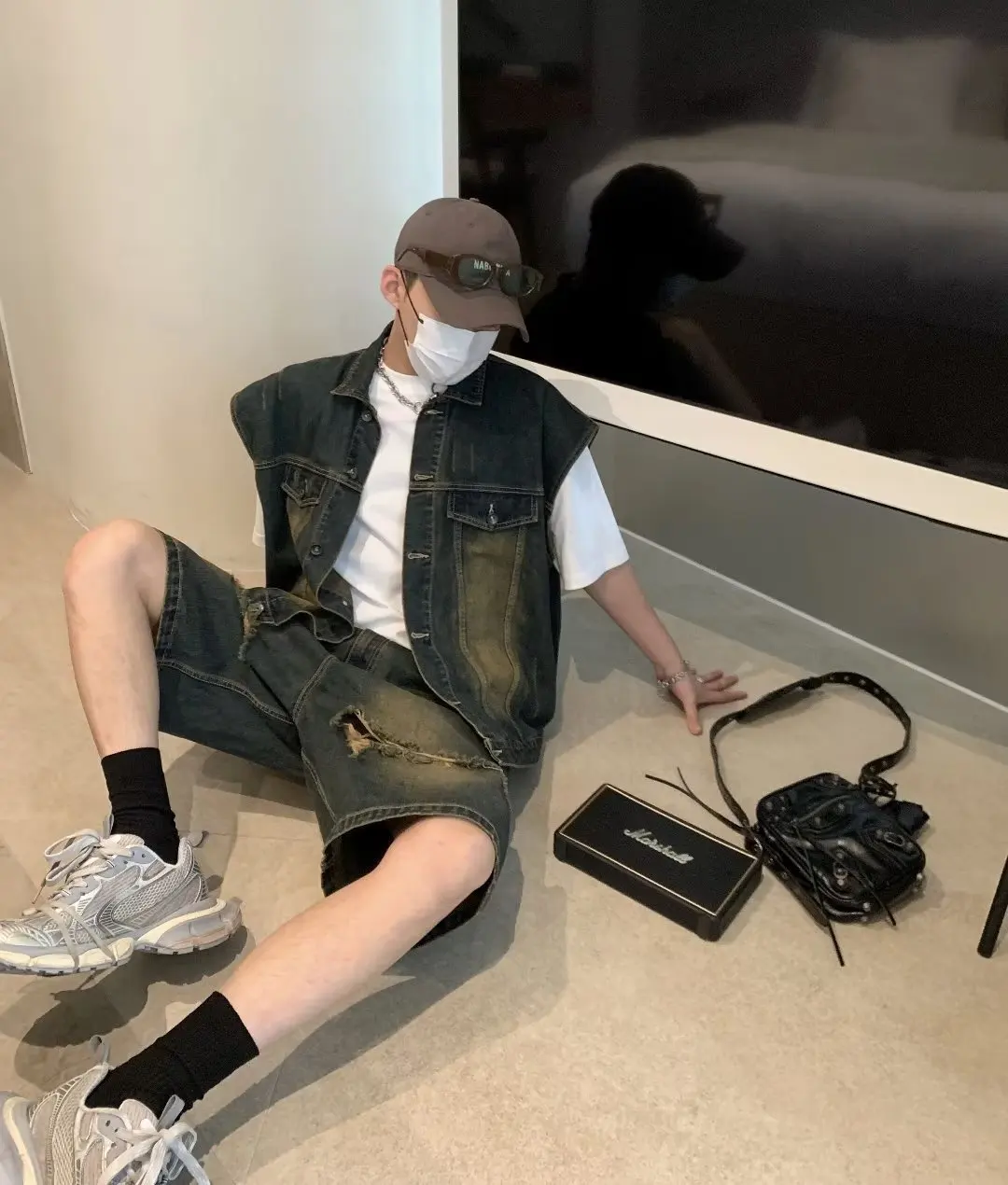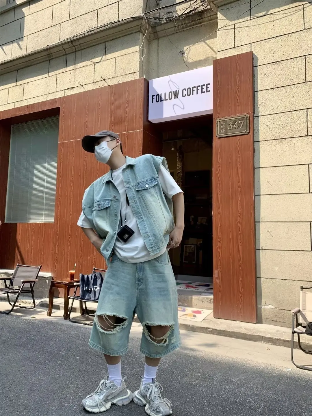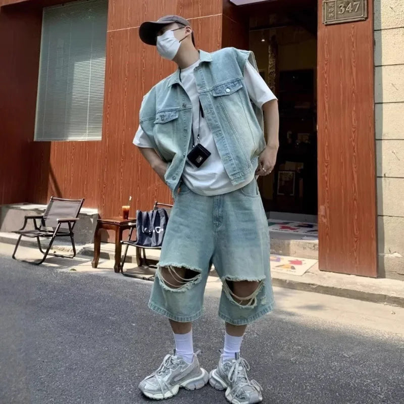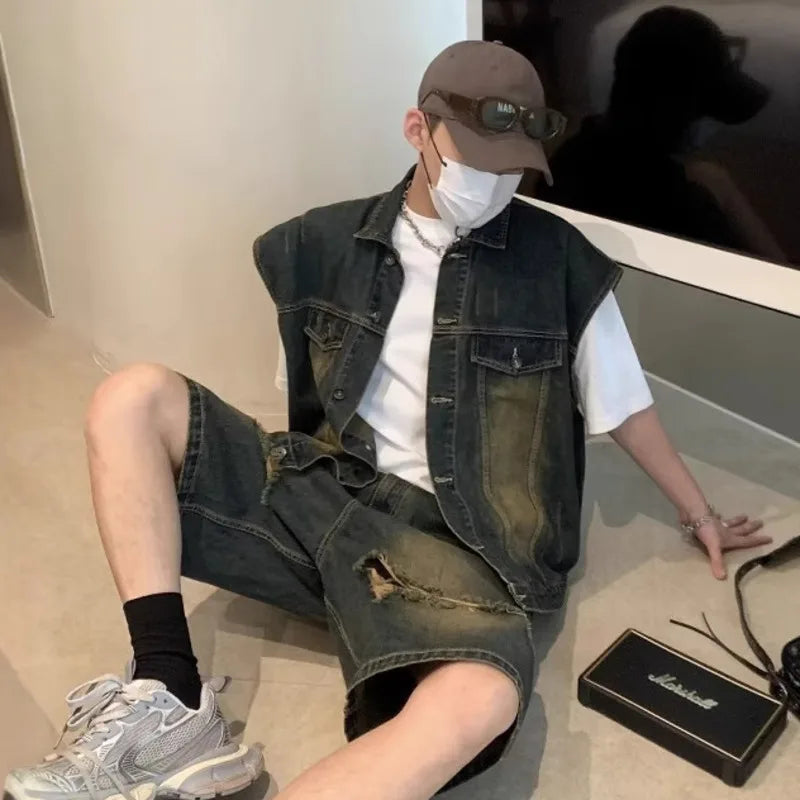 AIDASE - Summer New Men Tide Punk Vintage Style Washed Denim Vest Torn Shorts Set Hip Hop Trend High Street Sleeveless Jacket