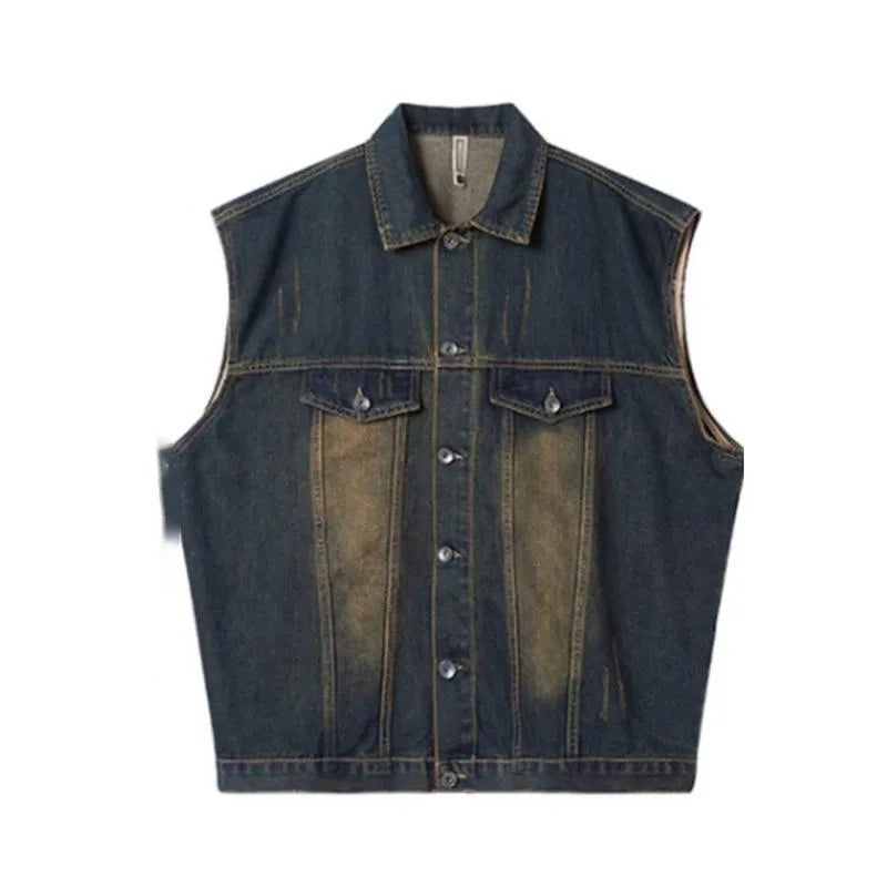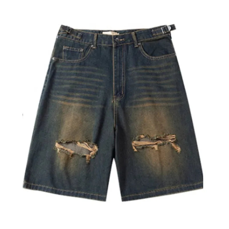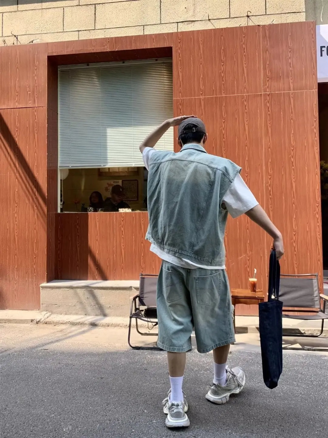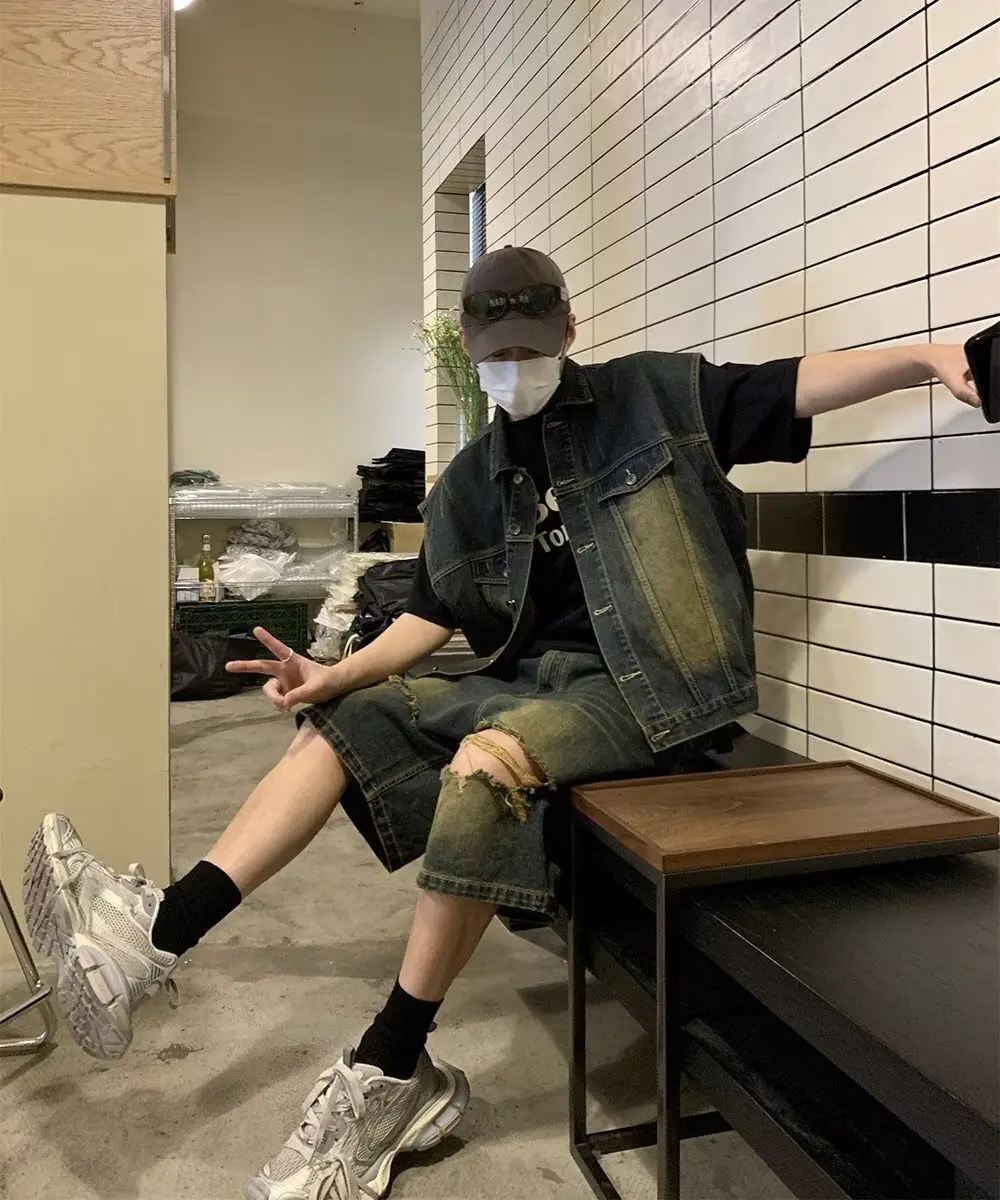 AIDASE - Summer New Men Tide Punk Vintage Style Washed Denim Vest Torn Shorts Set Hip Hop Trend High Street Sleeveless Jacket