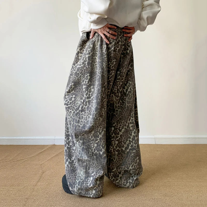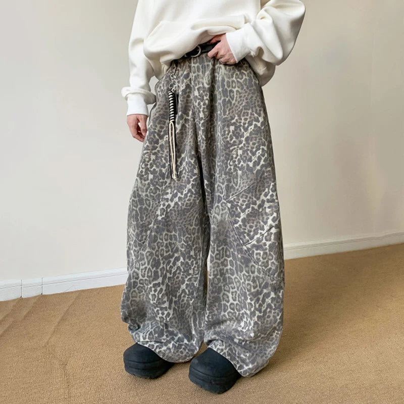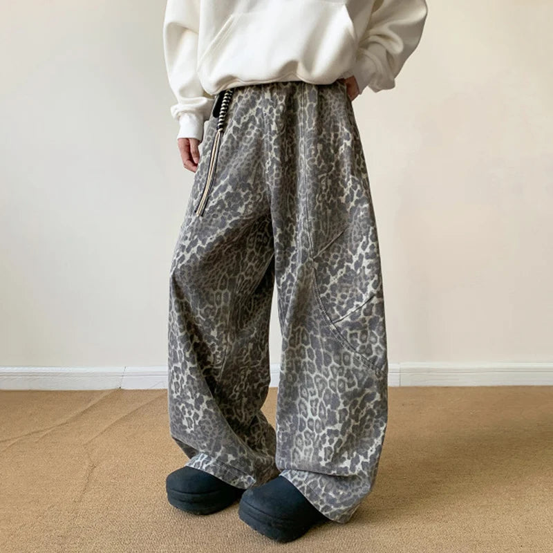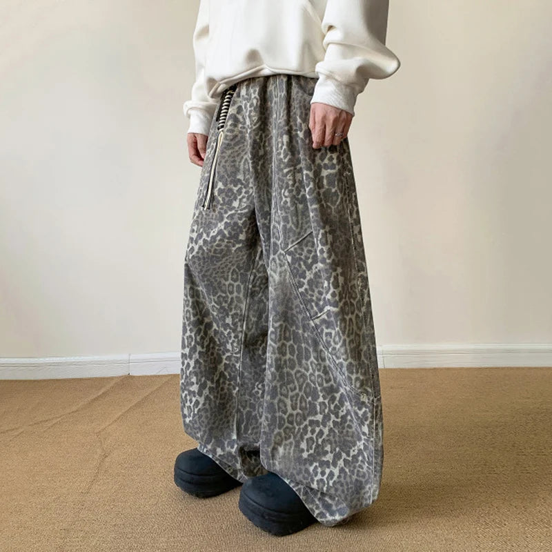 AIDASE - Vintage Men's Leopard Print Jeans American Style Loose Floor-Length Washed Scimitar Denim Pants 2025 New Trousers 21E7190