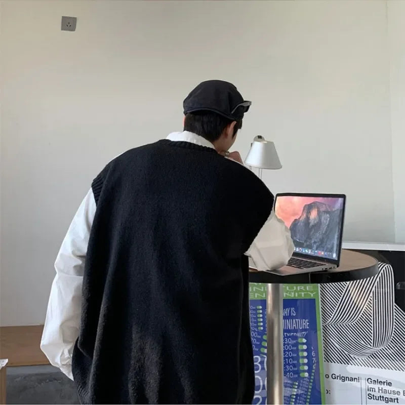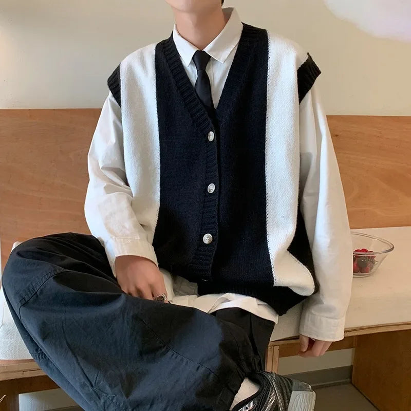 Aidase Vintage Sweater Vest Men Knitted Patchwork Sleeveless V-neck Teens Outwear Preppy Cool Ulzzang Casual Mens Clothes Fashion Daily